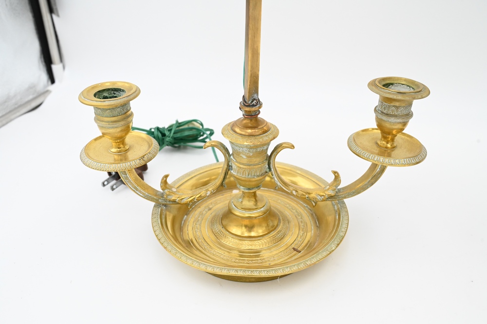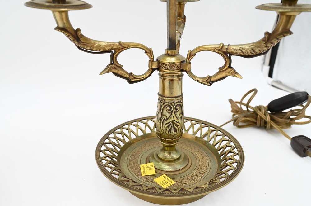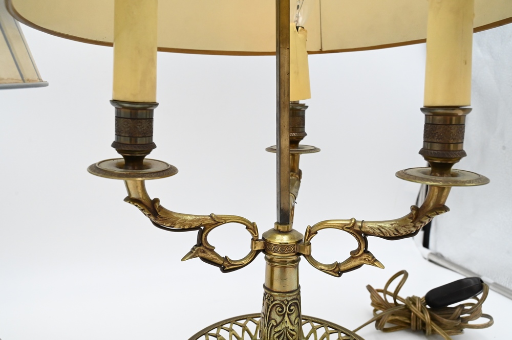 Lot 156: Two French Boulette Table Lamps, having adjustable tole shades, one having two candle holders and the other having three bird form brass arms and reticulated base, height 26 inches.