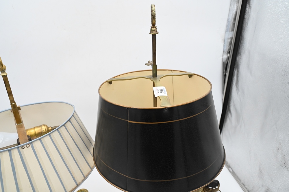 Two French Boulette Table Lamps, having adjustable tole shades, one having two candle holders and the other having three bird form brass arms and reticulated base, height 26 inches.