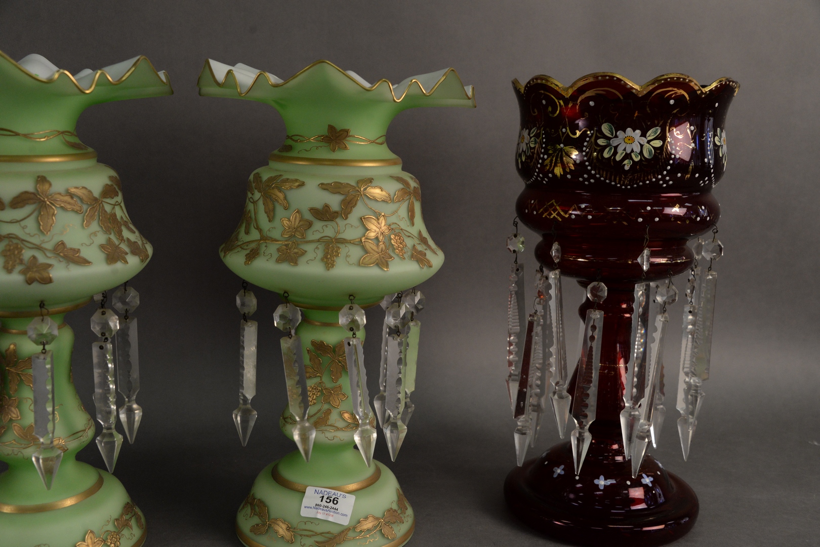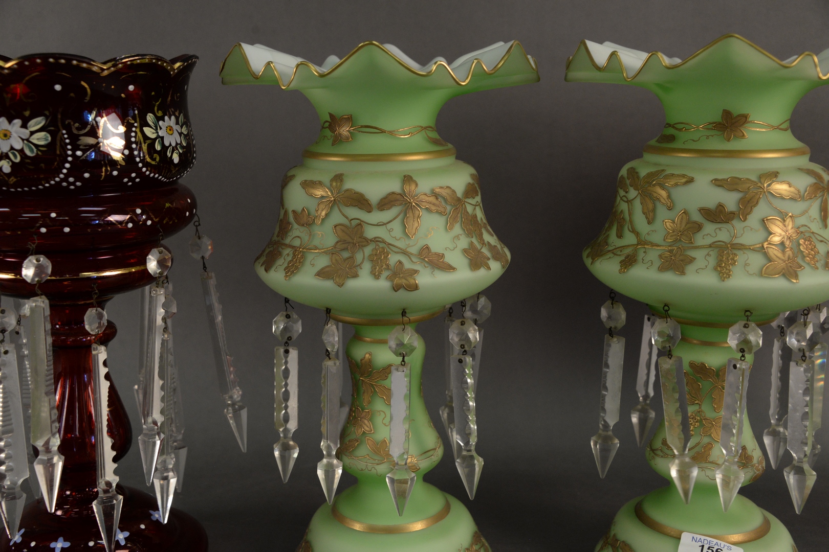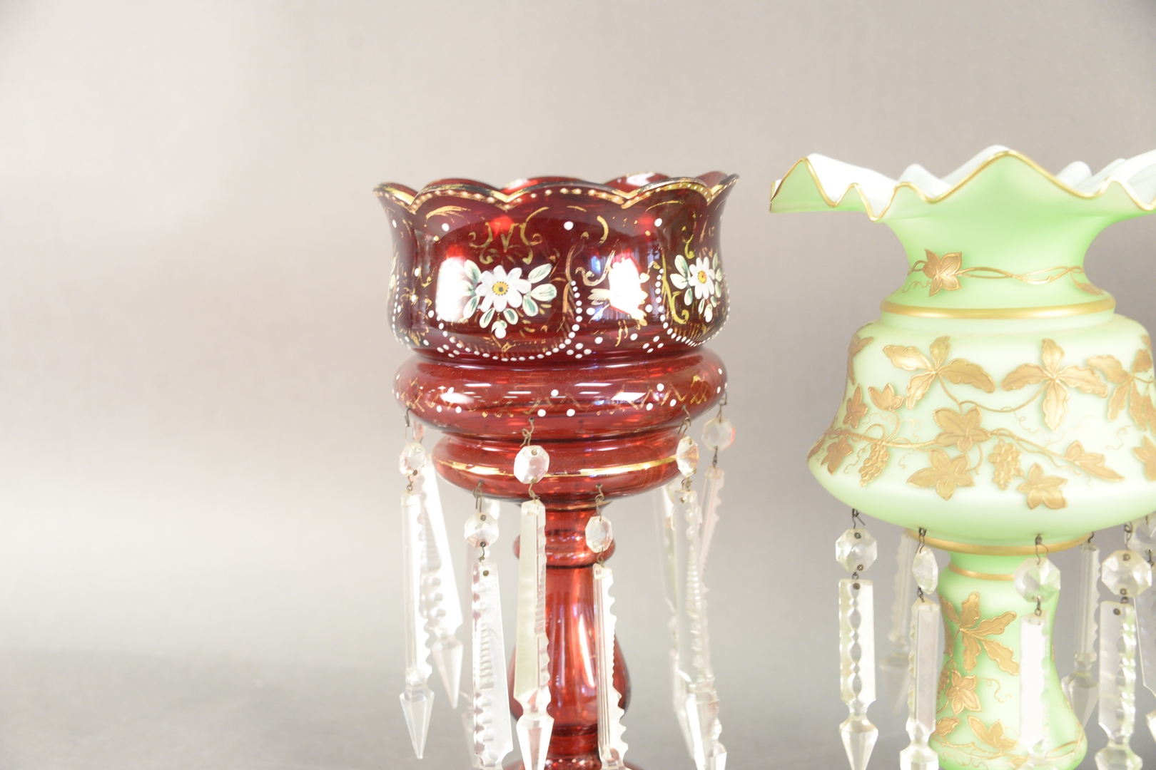 Lot 156: Two Pairs of Lusters, to include one green satin glass with enameling; along with a pair of ruby glass with enameling, height 14 1/2 inches. Provenance: Estate of James Wadhams.
