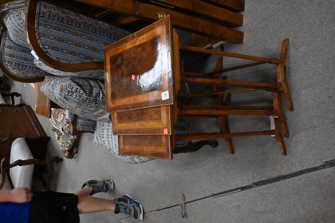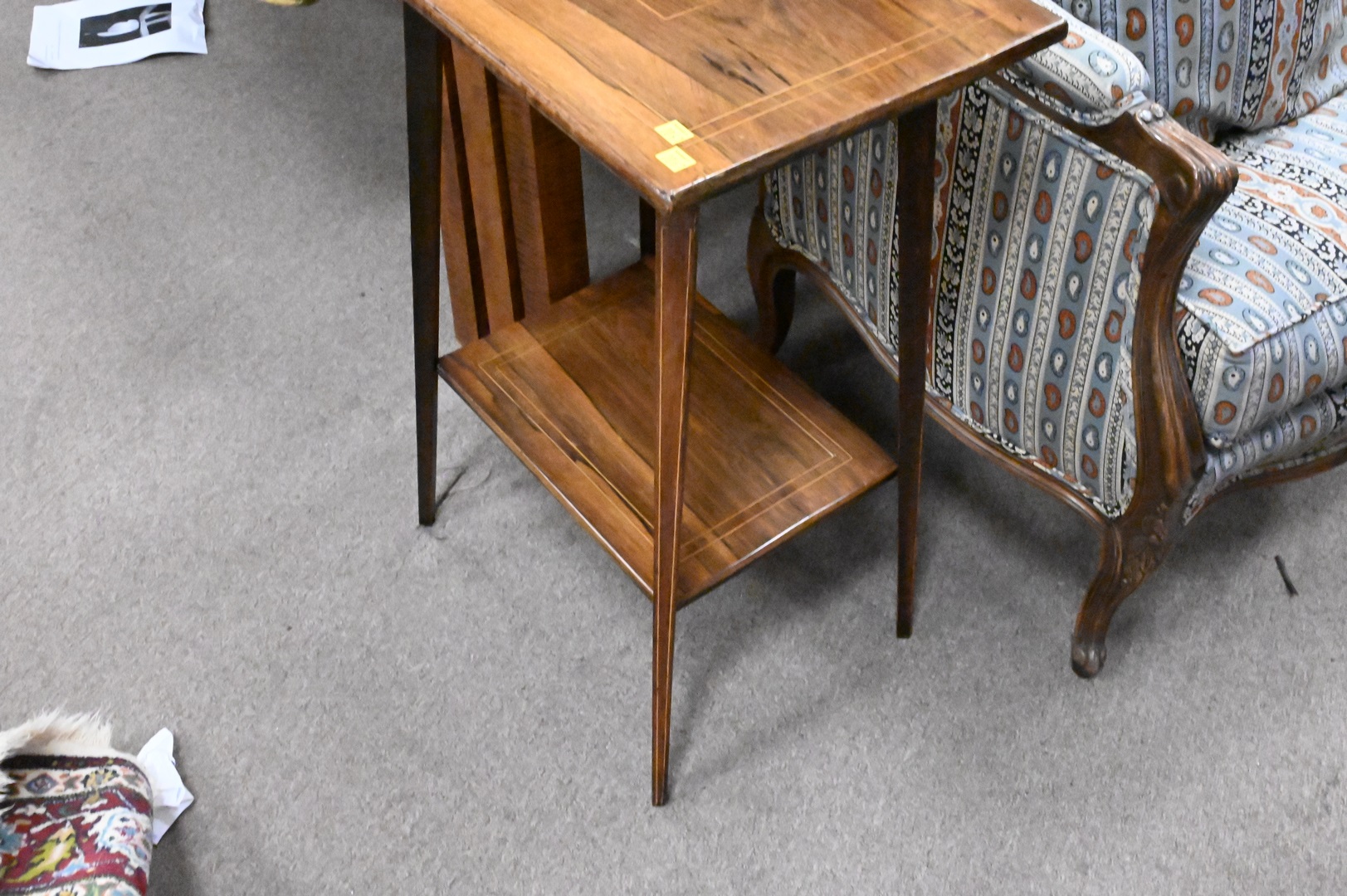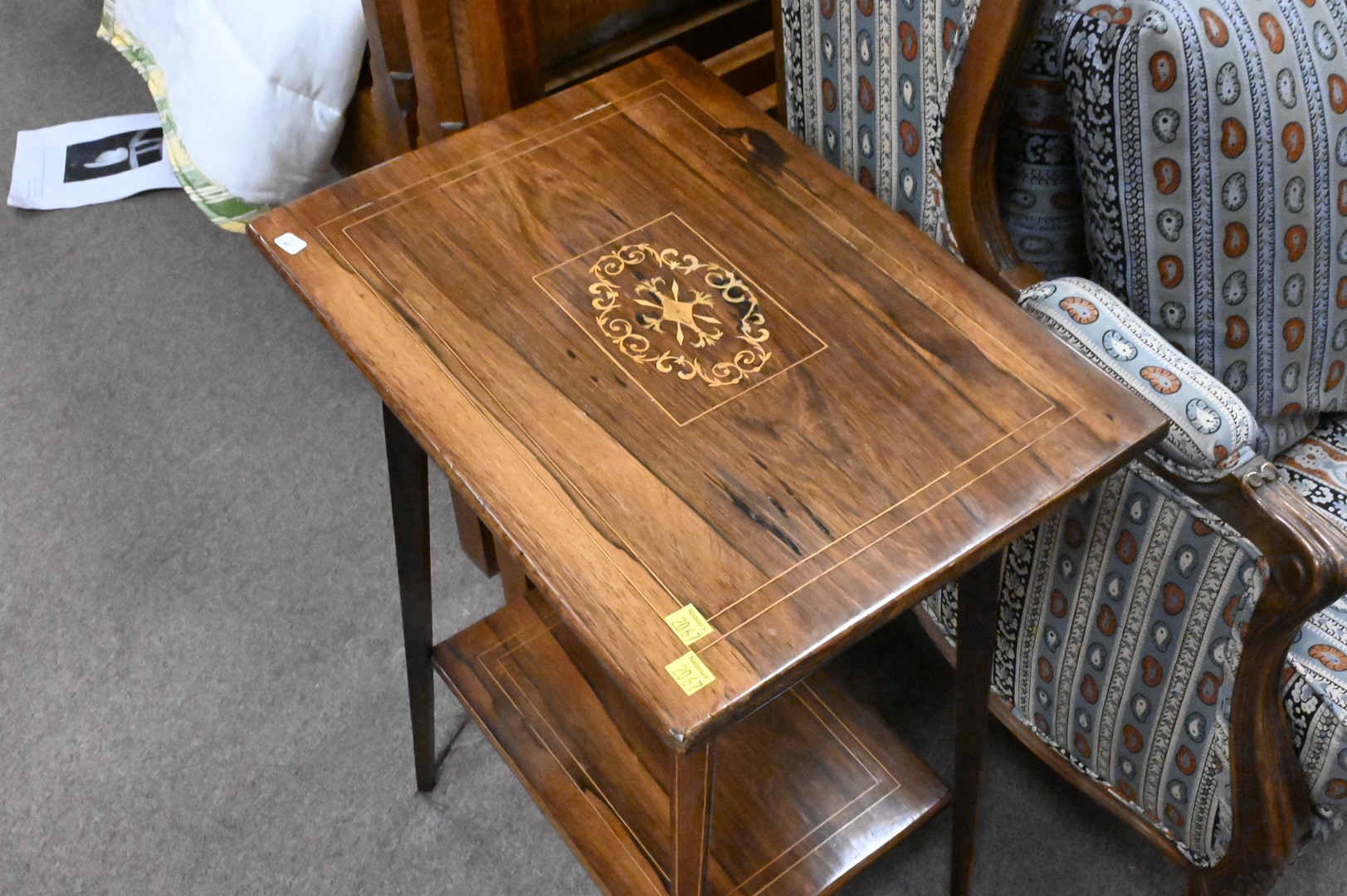 Two Piece Lot, to include a set of three inlaid burlwood nesting tables, height 28 1/2 inches, top 11 1/2″ x 19″; along with an inlaid rosewood two-tier stand, height 28 inches, top 14″ x 19″.