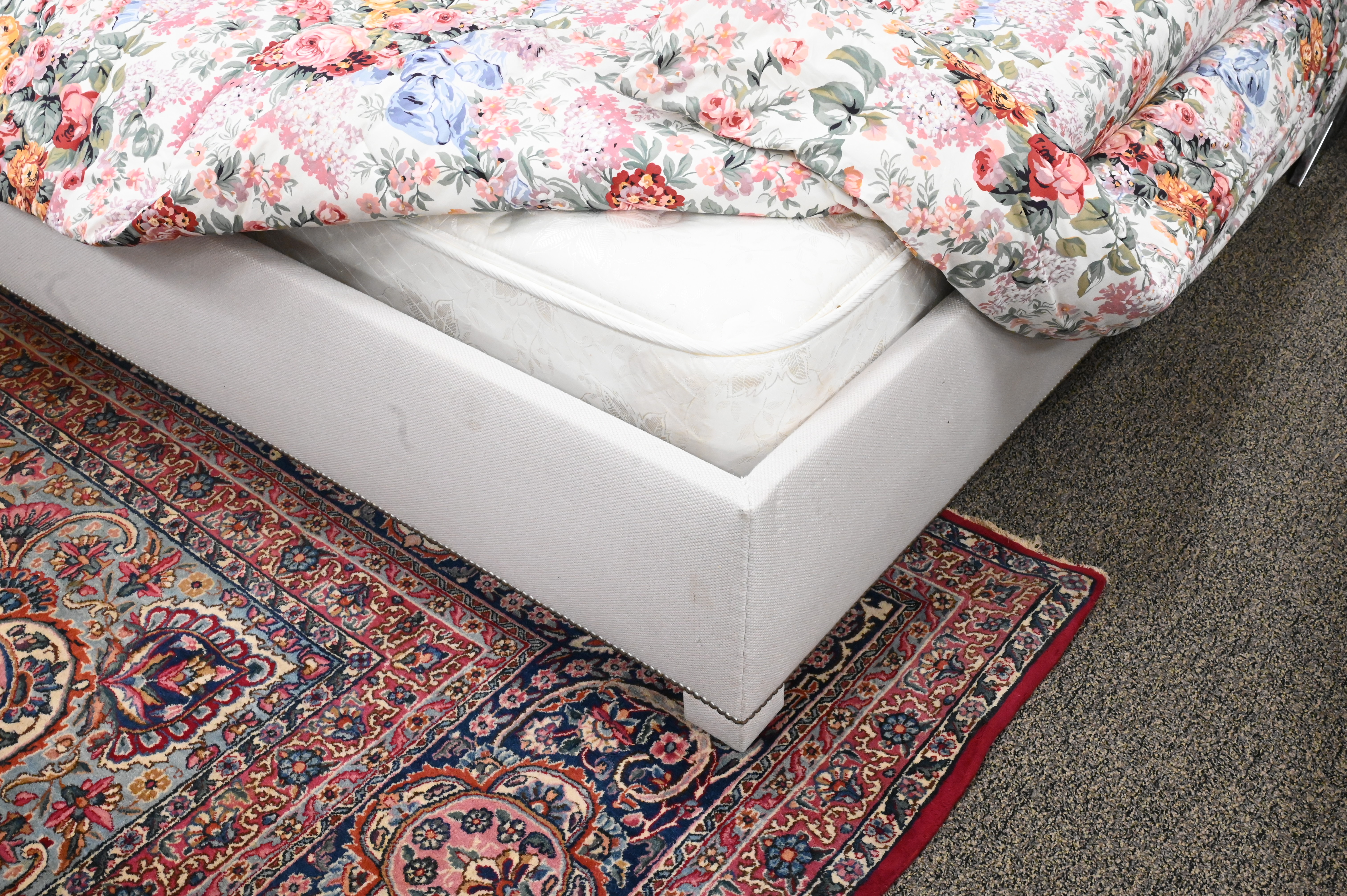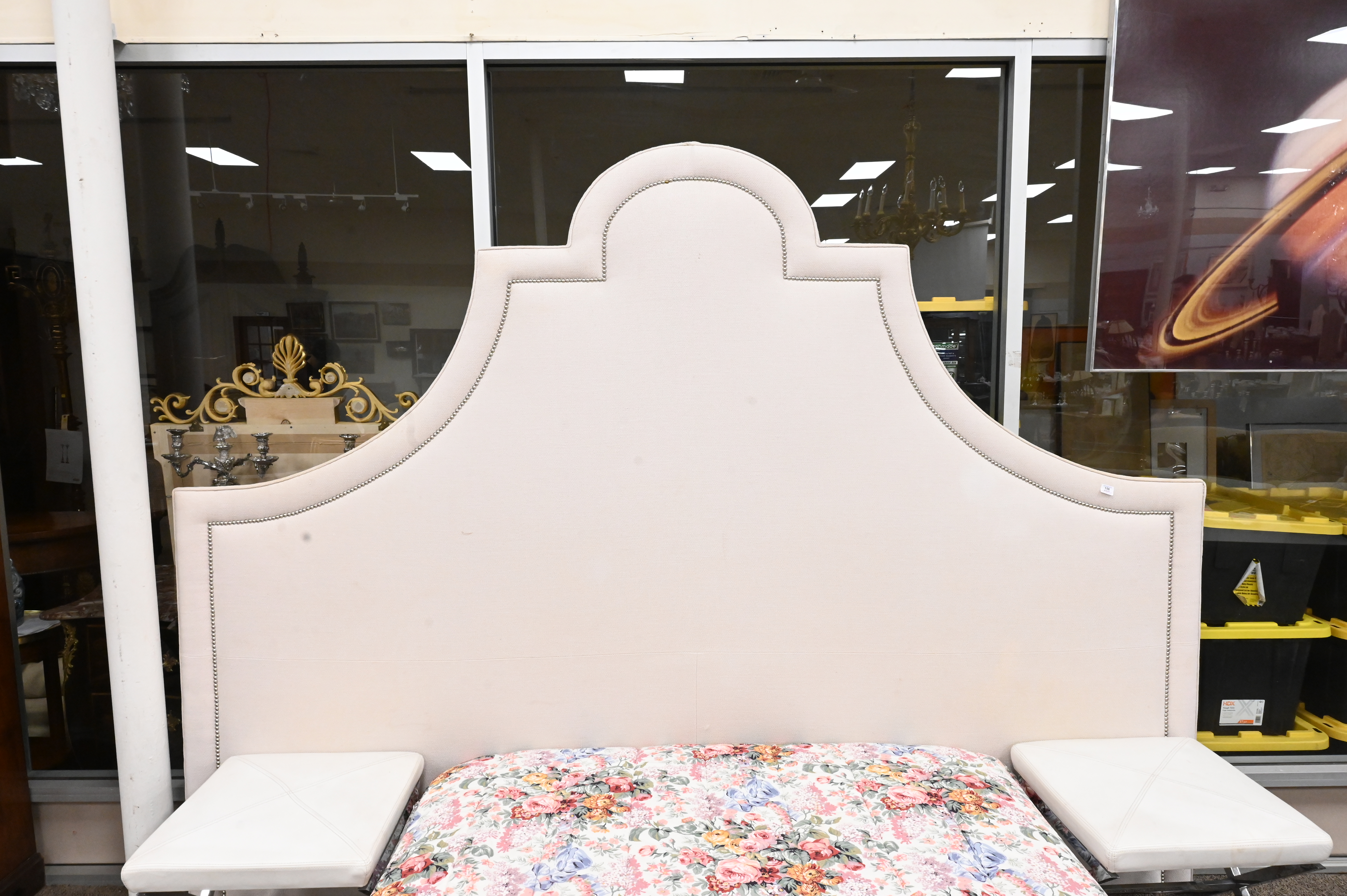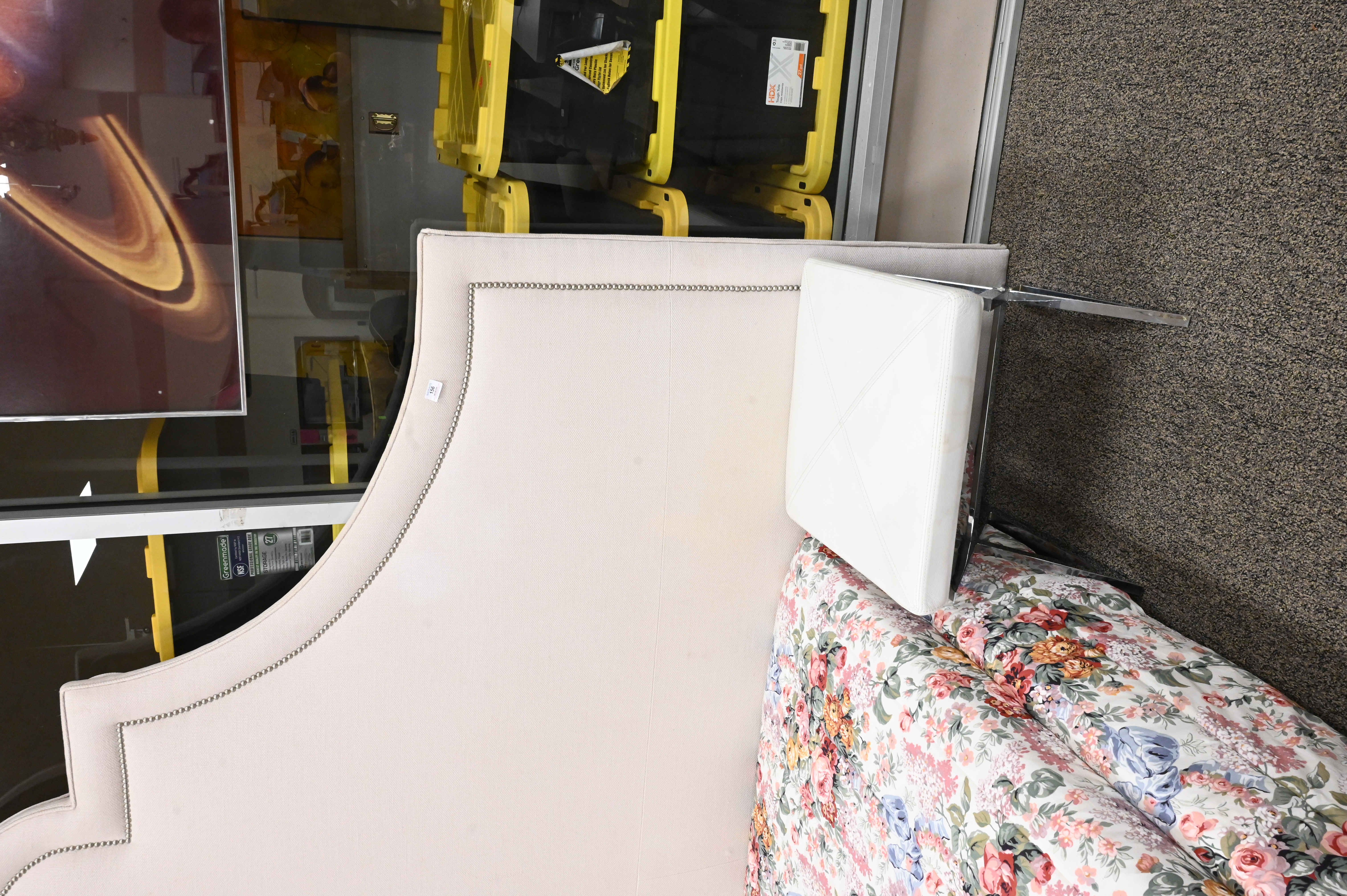 Upholstered Queen Sized Bed, having oversized headboard, height 85 inches, width 114 inches, (minor soiling to headboard); along with a pair of leather top stools having chrome bases.