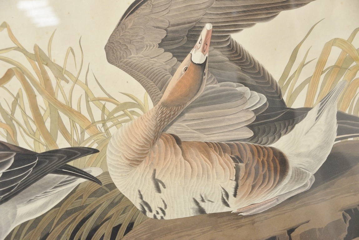 After John James Audubon 1785-1851 White-Fronted Goose Lath Anser Albifrons Bechst 1 Male, 2 Female Hand Colored Engraving marked lower left: Drawn from Nature by J. J. Audubon, F.R.S. F.L.S. marked lower right: Engraved Printed and Coloured by R. Havell 1836 No. 58, Plate CCLXXXVI large label on reverse: The Birds of America from original drawers by John James Audubon 25 1/4 x 38 1/2 Provenance: The Estate of Natalie Rafferty