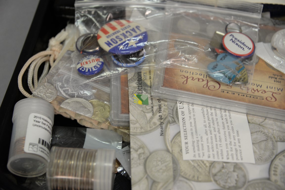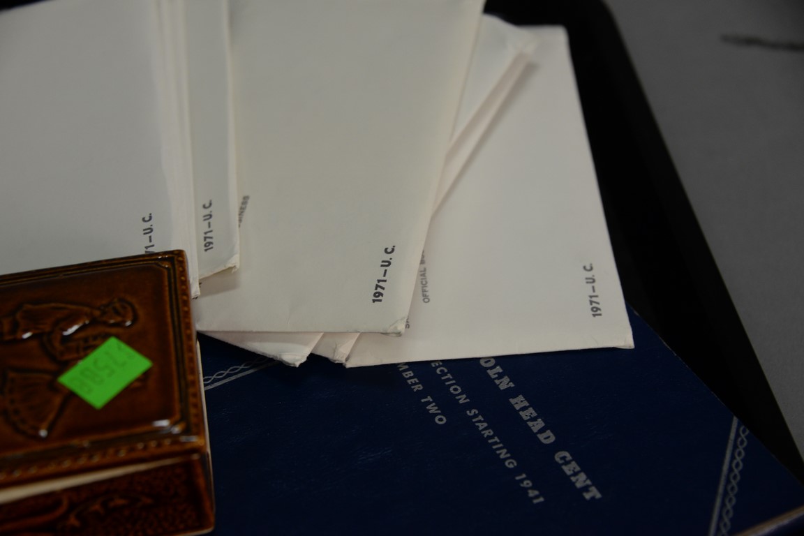 Lot 157: Coin lot to include 10 sets of Kennedy 1971 unc coin sets, a roll of Kennedy 67, 68, & 69 clad half dollars, book of pennies, 1 Eise…