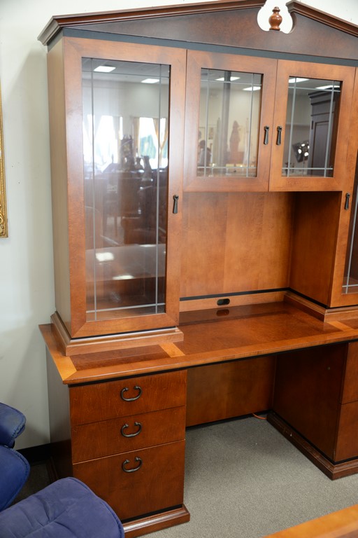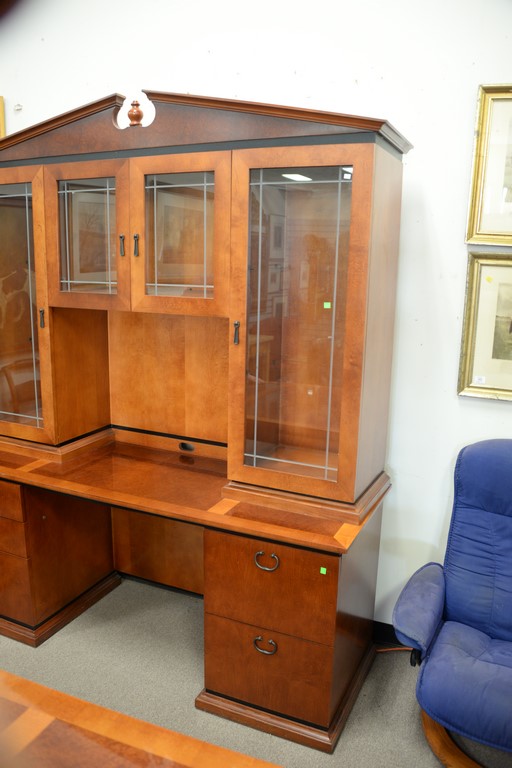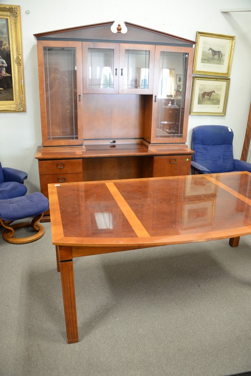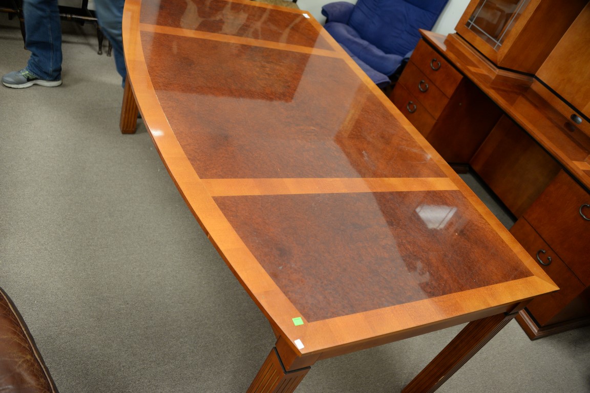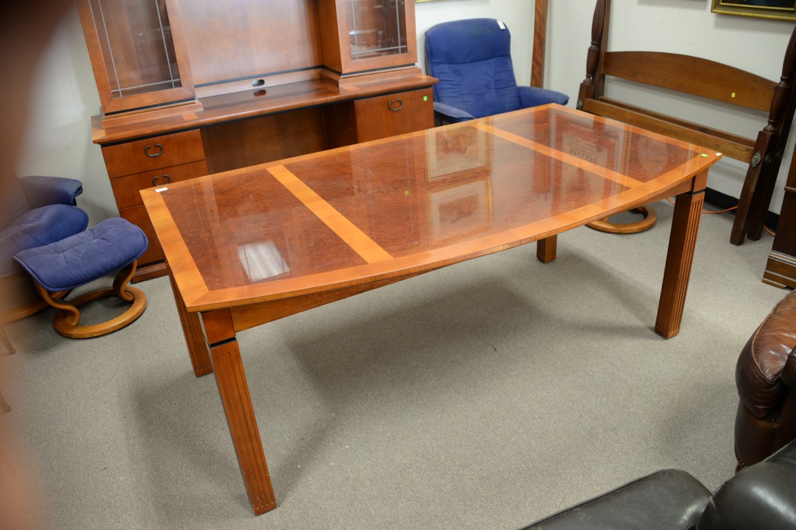 Lot 157: Custom Contemporary inlaid office table with bowed front and two part credenza. table: ht. 30 1/2in., top: 42 x 72, credenza: ht. …
