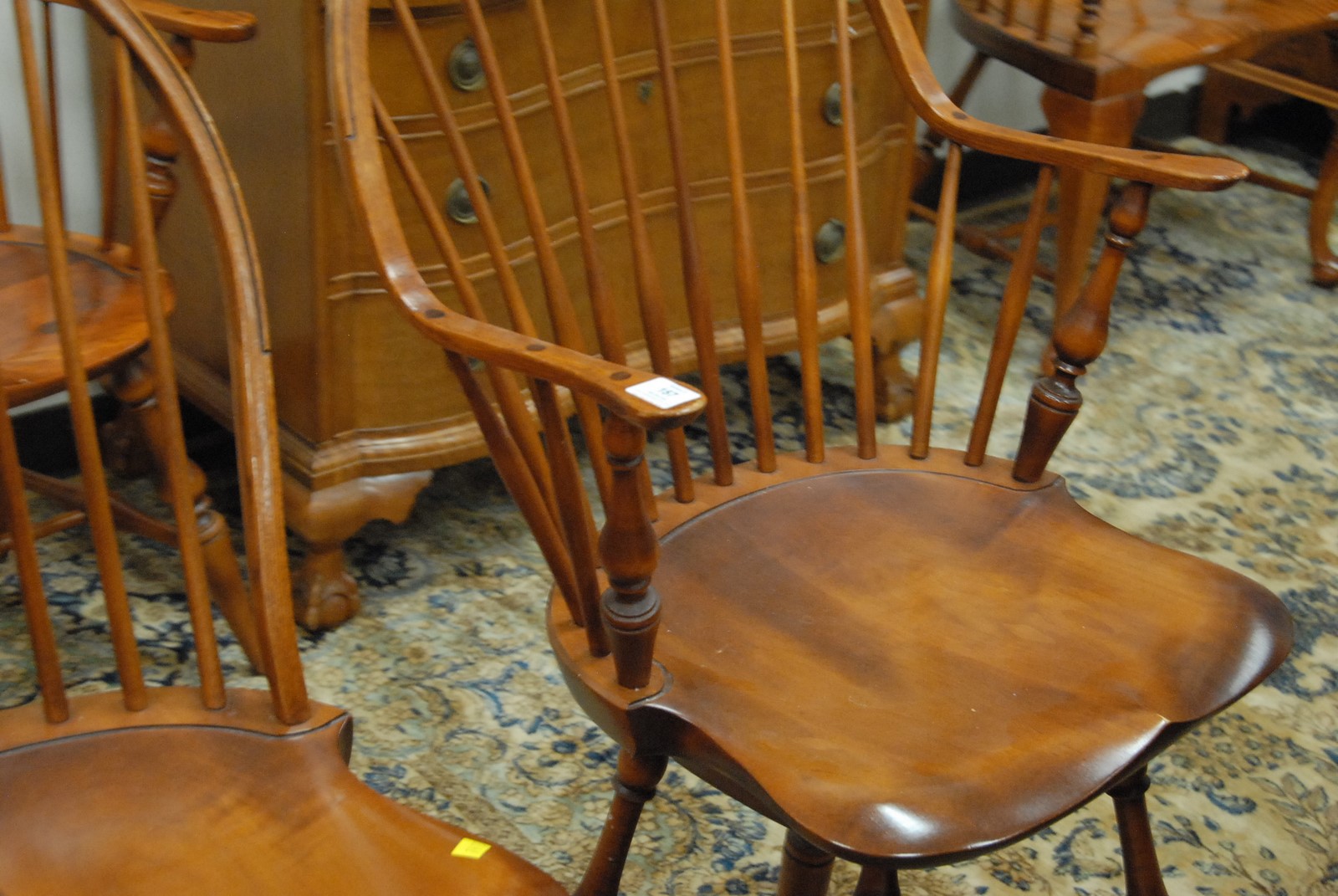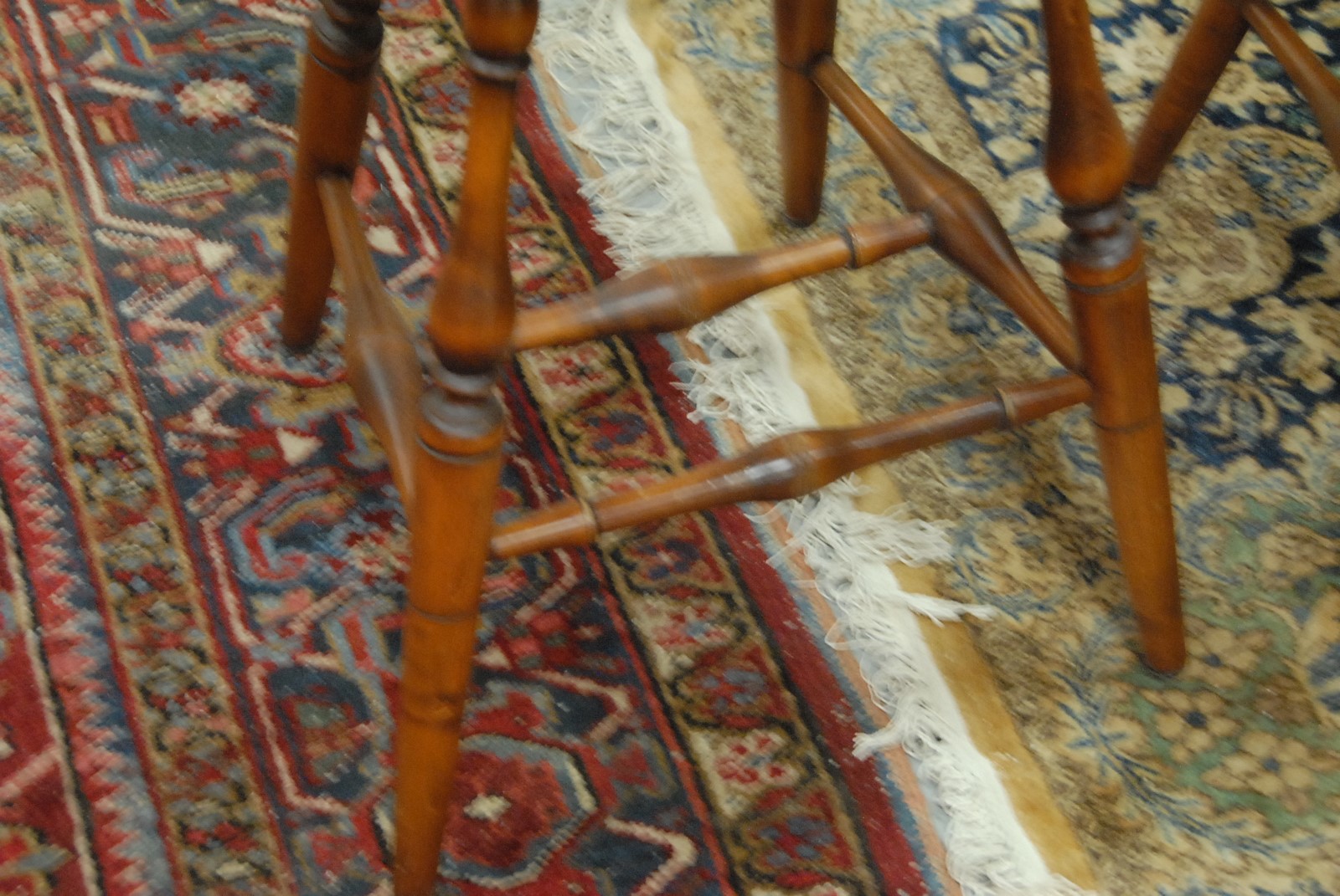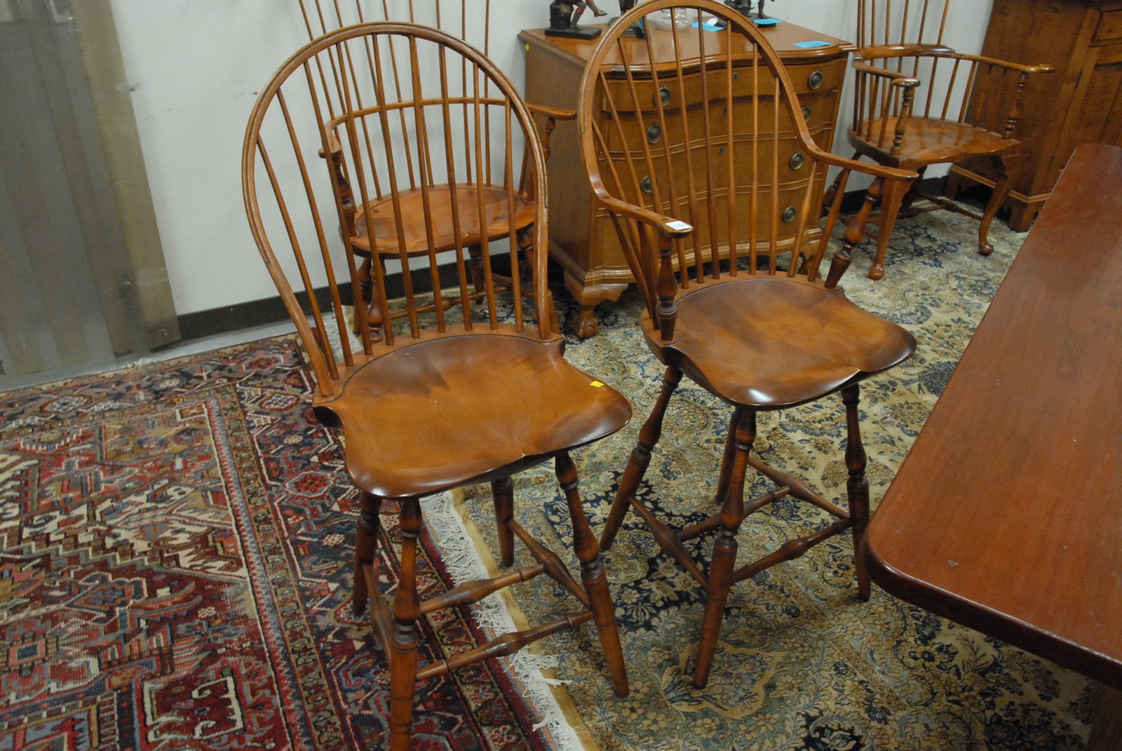 Lot 157: D.R. Dimes pair of Windsor style counter stools with swivel bases, one having arms, signed D.R. Dimes. seat ht. 26 1/4 in.