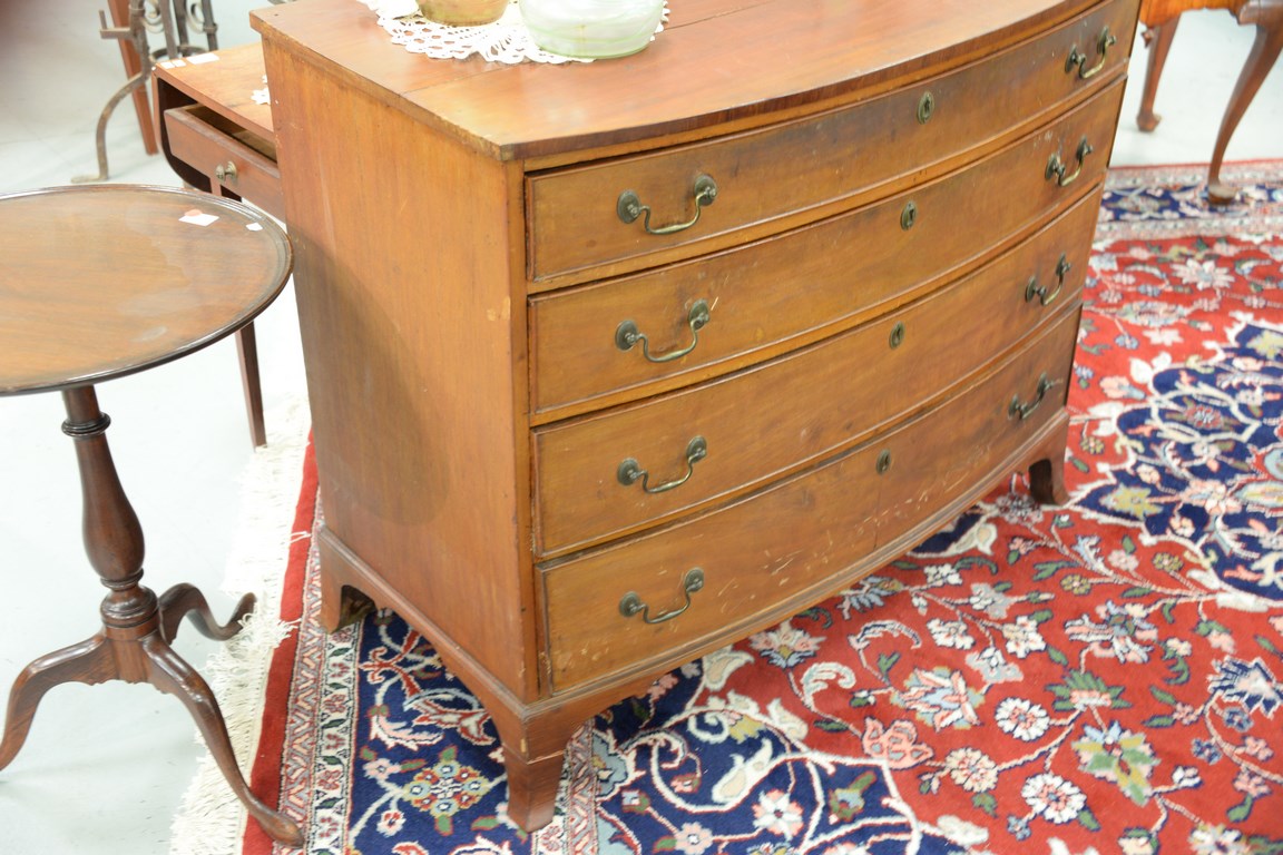 Lot 157: Federal cherry bowed front chest of four drawers on flared French feet, circa 1790 – 1810. ht. 35 in. wd. 41 1/2 in. 21 1/2 in.