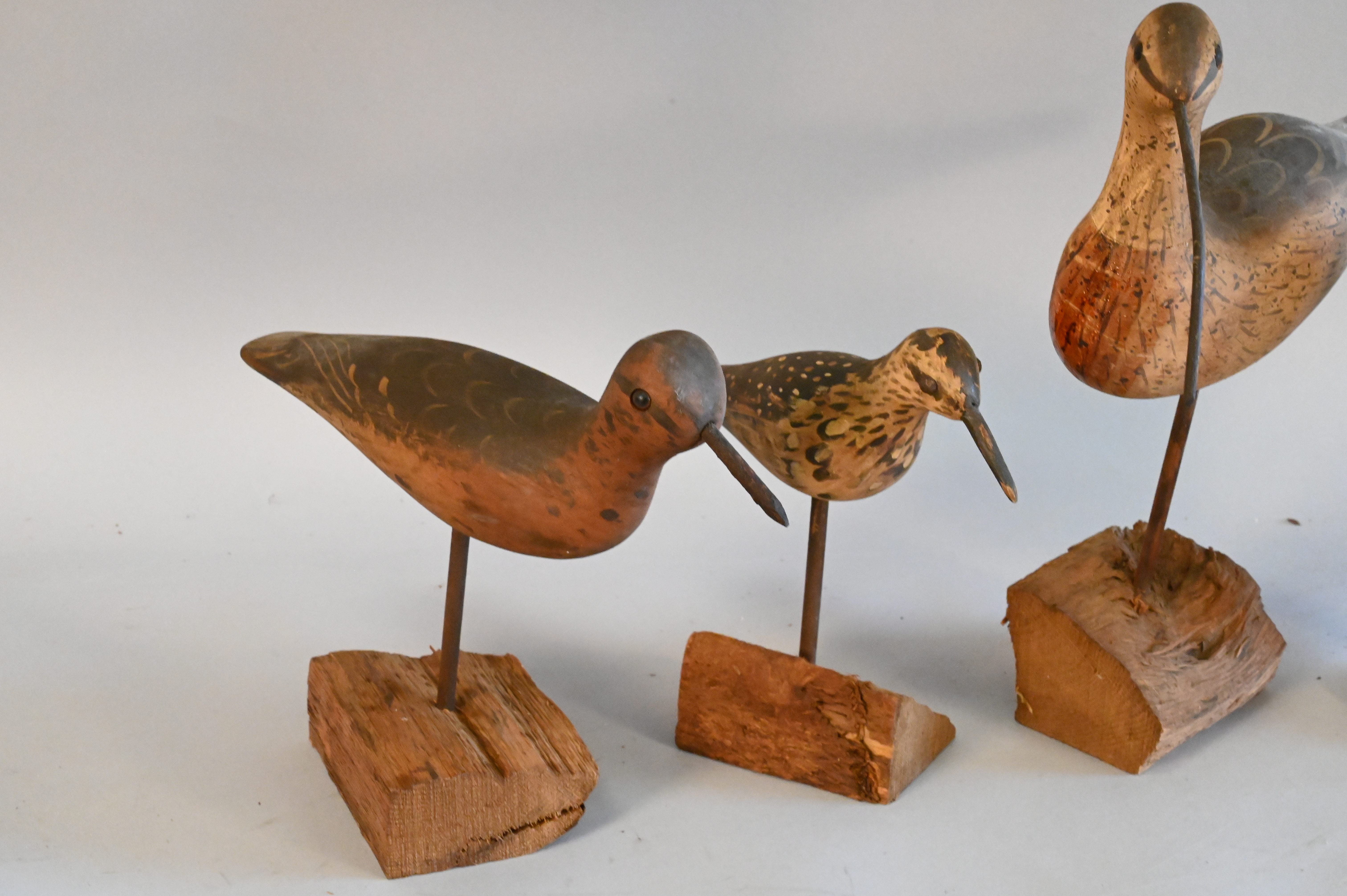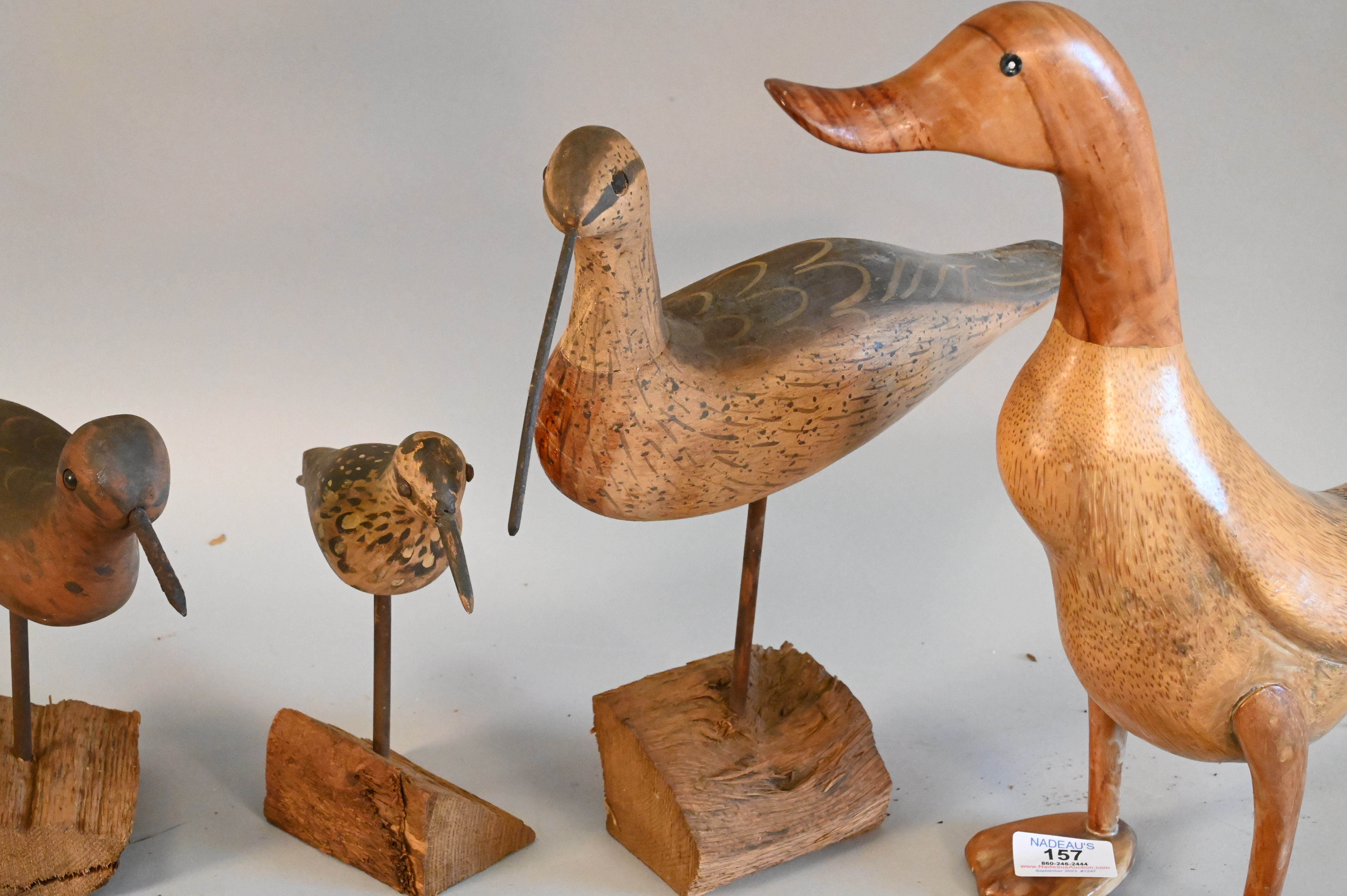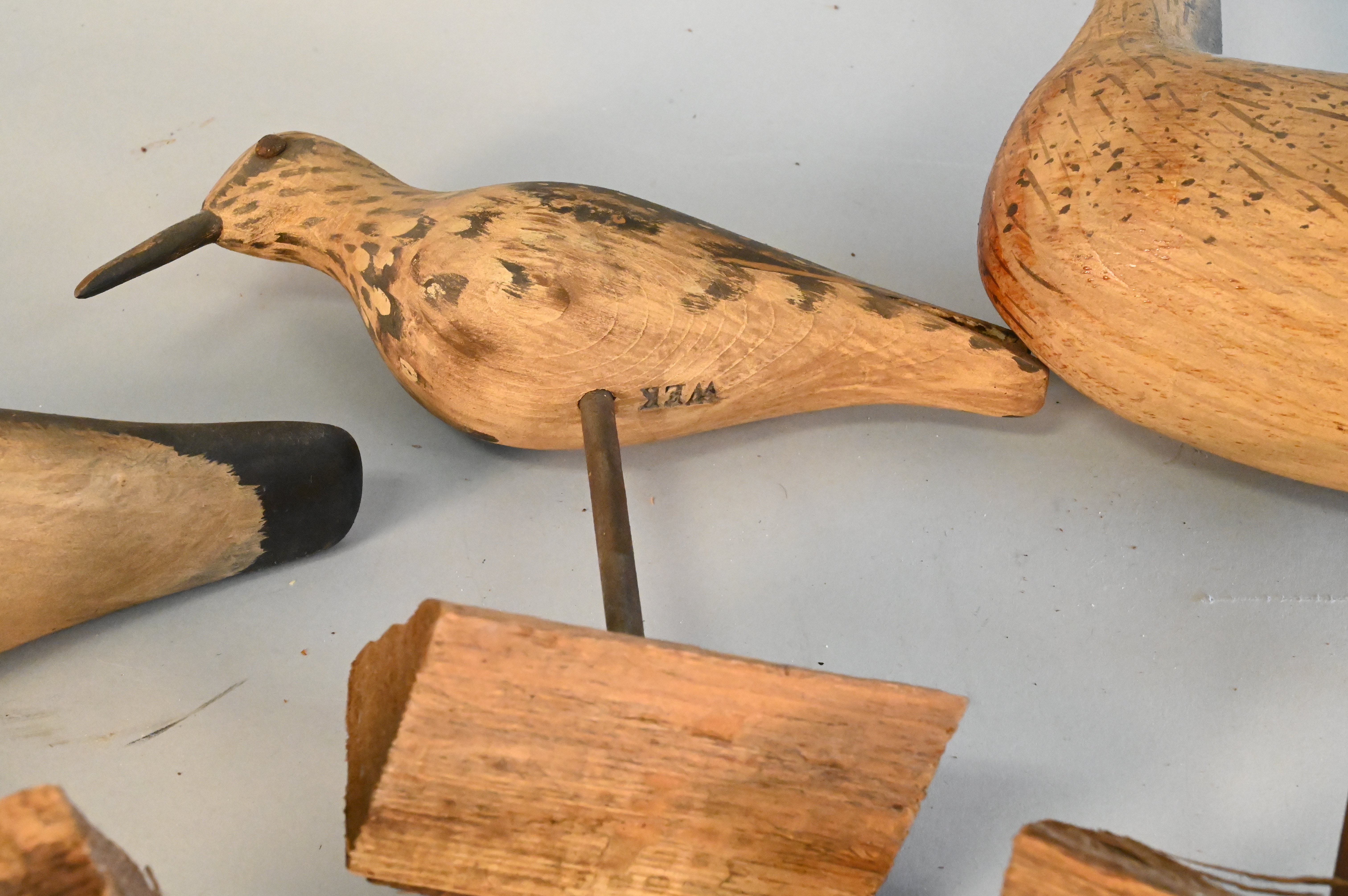 Four Birds, to include three shore bird decoys signed WEK, height 13 inches.