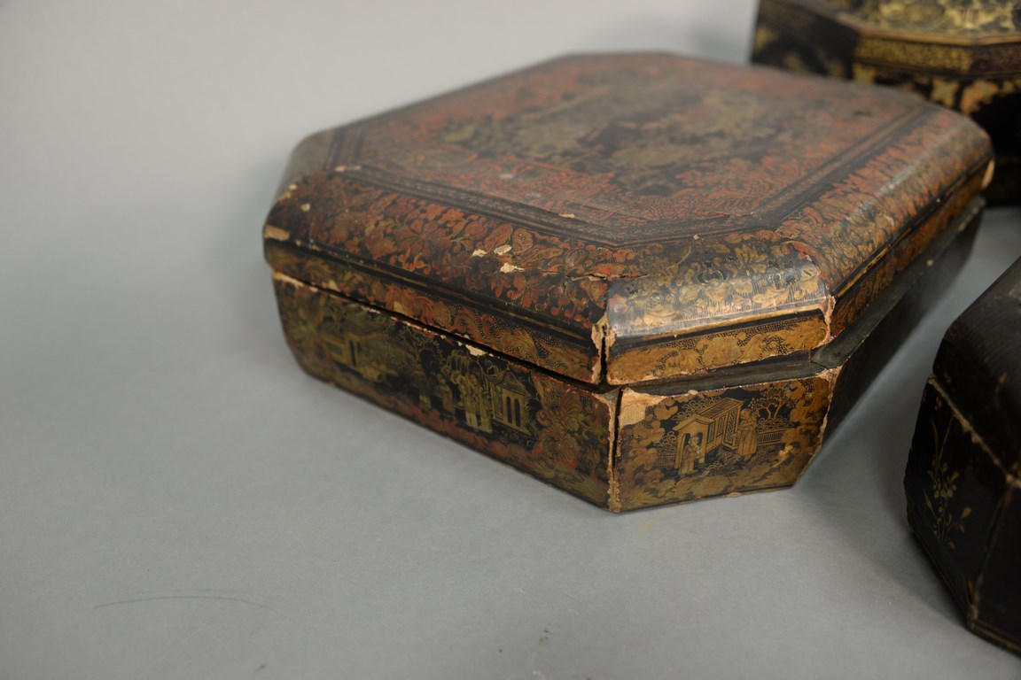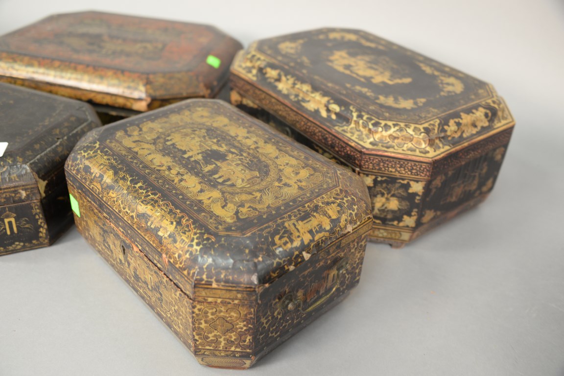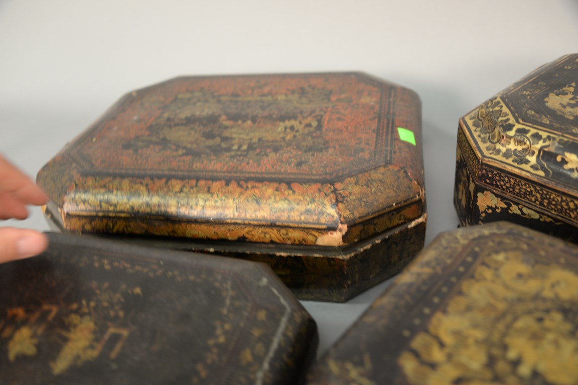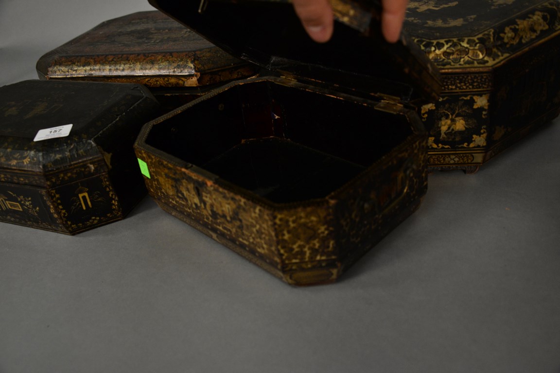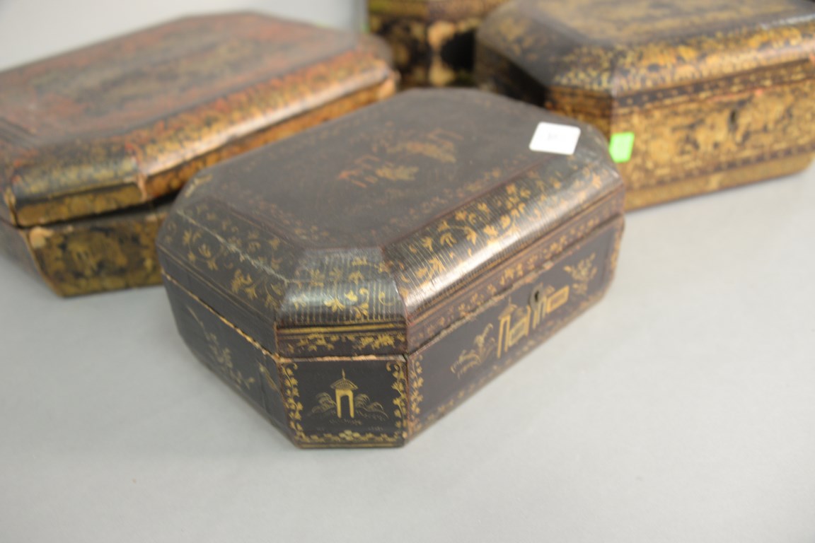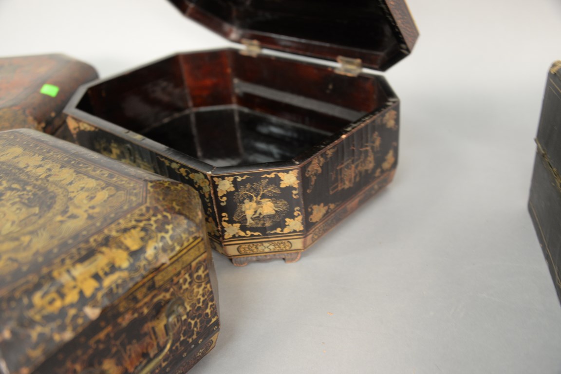 Lot 157: Four Chinoiserie black lacquered and gilt decorated boxes. smallest: ht. 4 1/2 in. 7 1/2 x 10 1/2, largest: ht. 6 in. 9 1/2 x 1…