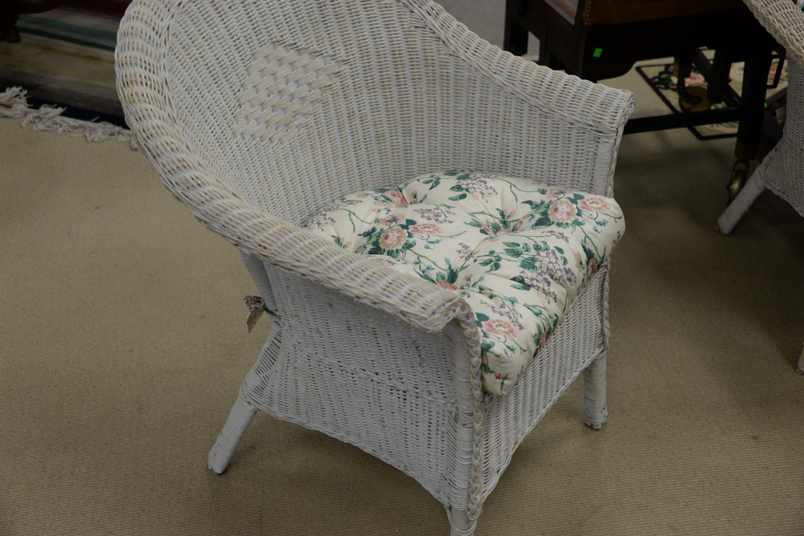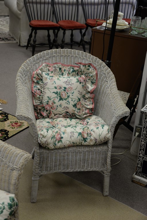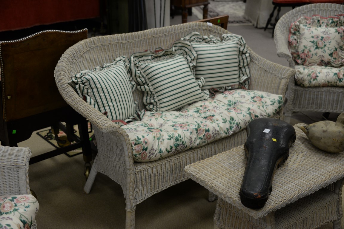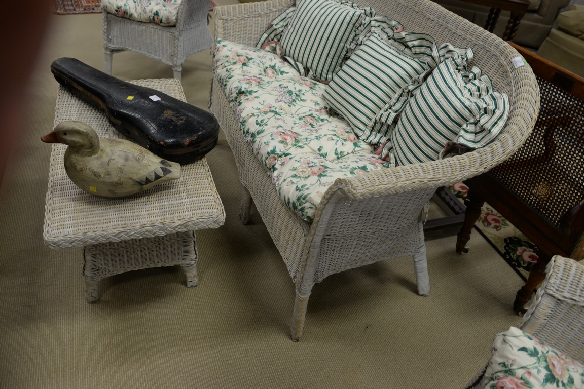 Four piece wicker set including loveseat lg. 55in., two armchairs, and a coffee table.