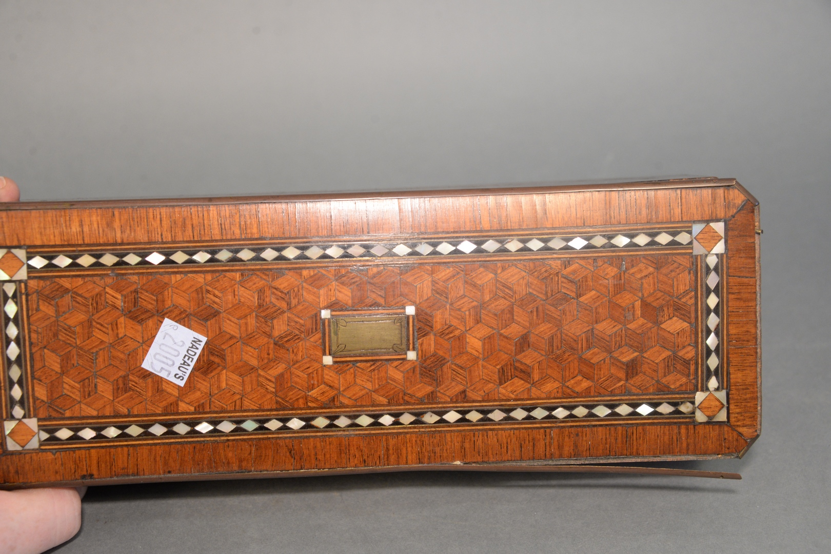 Lot 157: Inlaid Burl Glove Box having mother of pearl inlay, opening to satin tufted interior height 3 1/4 inches depth 4 inches length 11 …