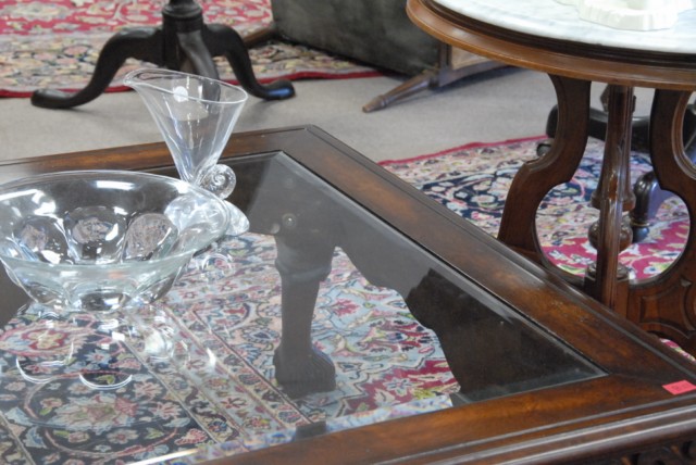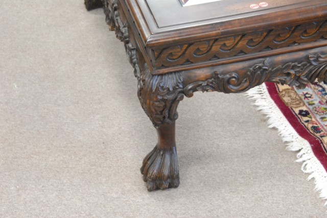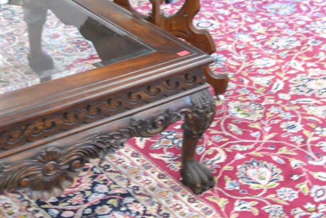 Mahogany Chippendale style glass top coffee table with paw feet.
