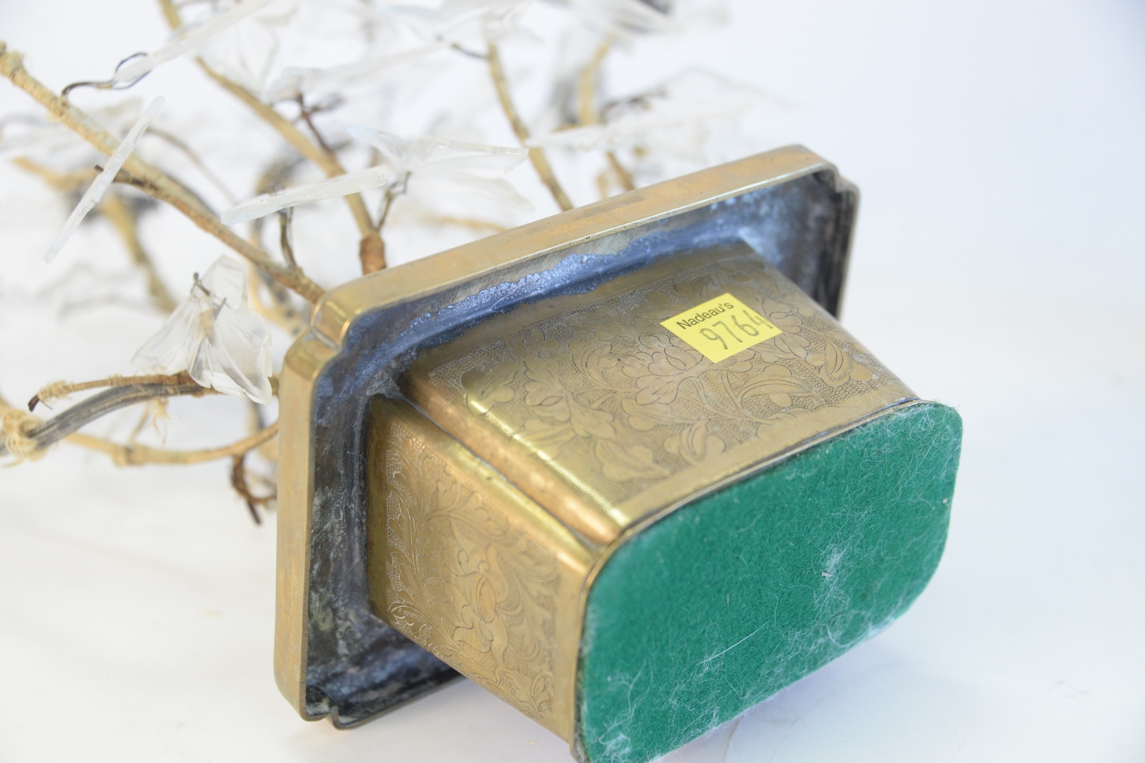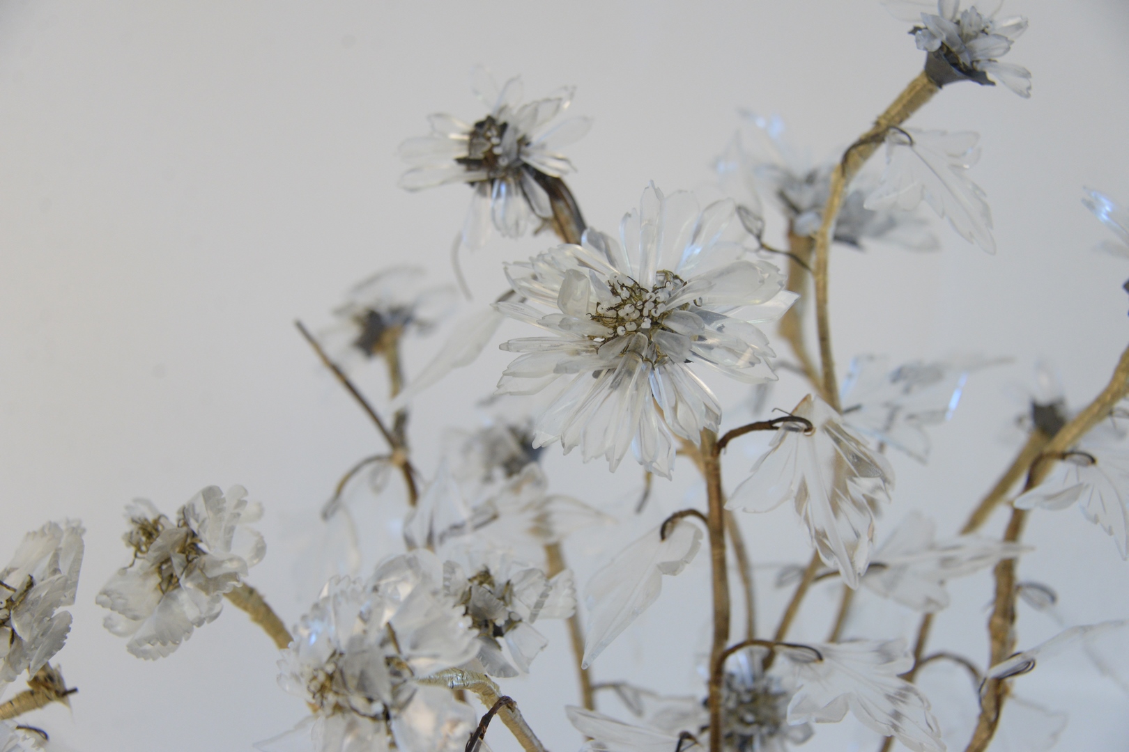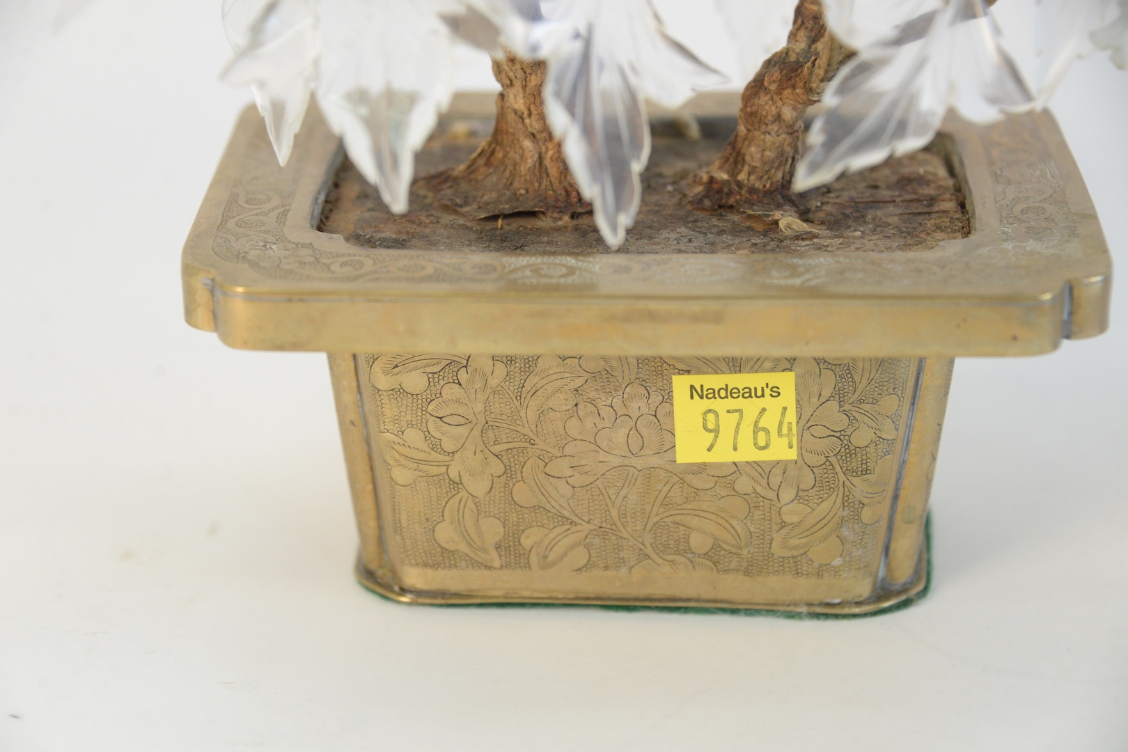 Pair Crystal Floral Plants, with crystal leaves, all set in brass pots, height 13 inches.