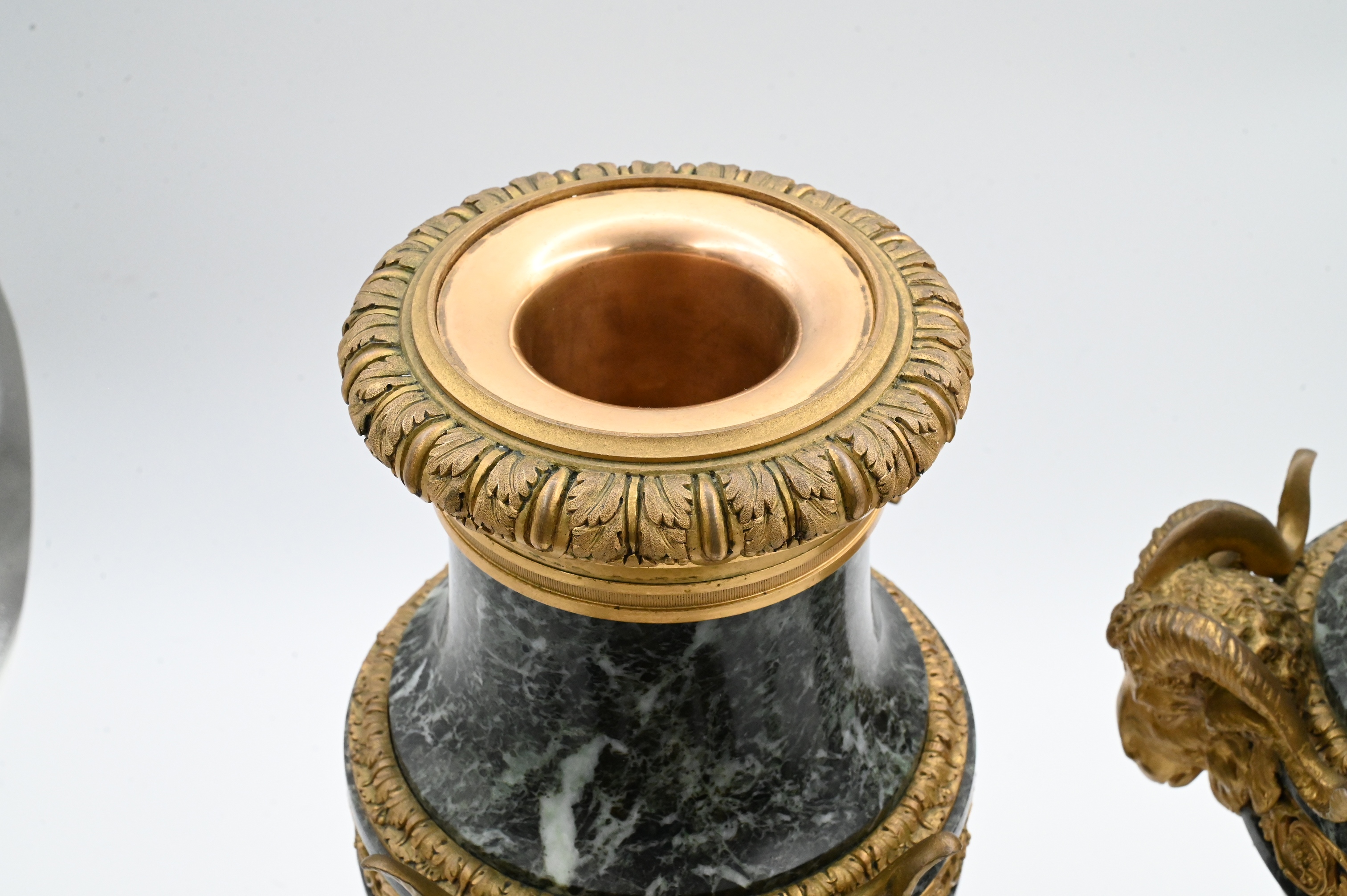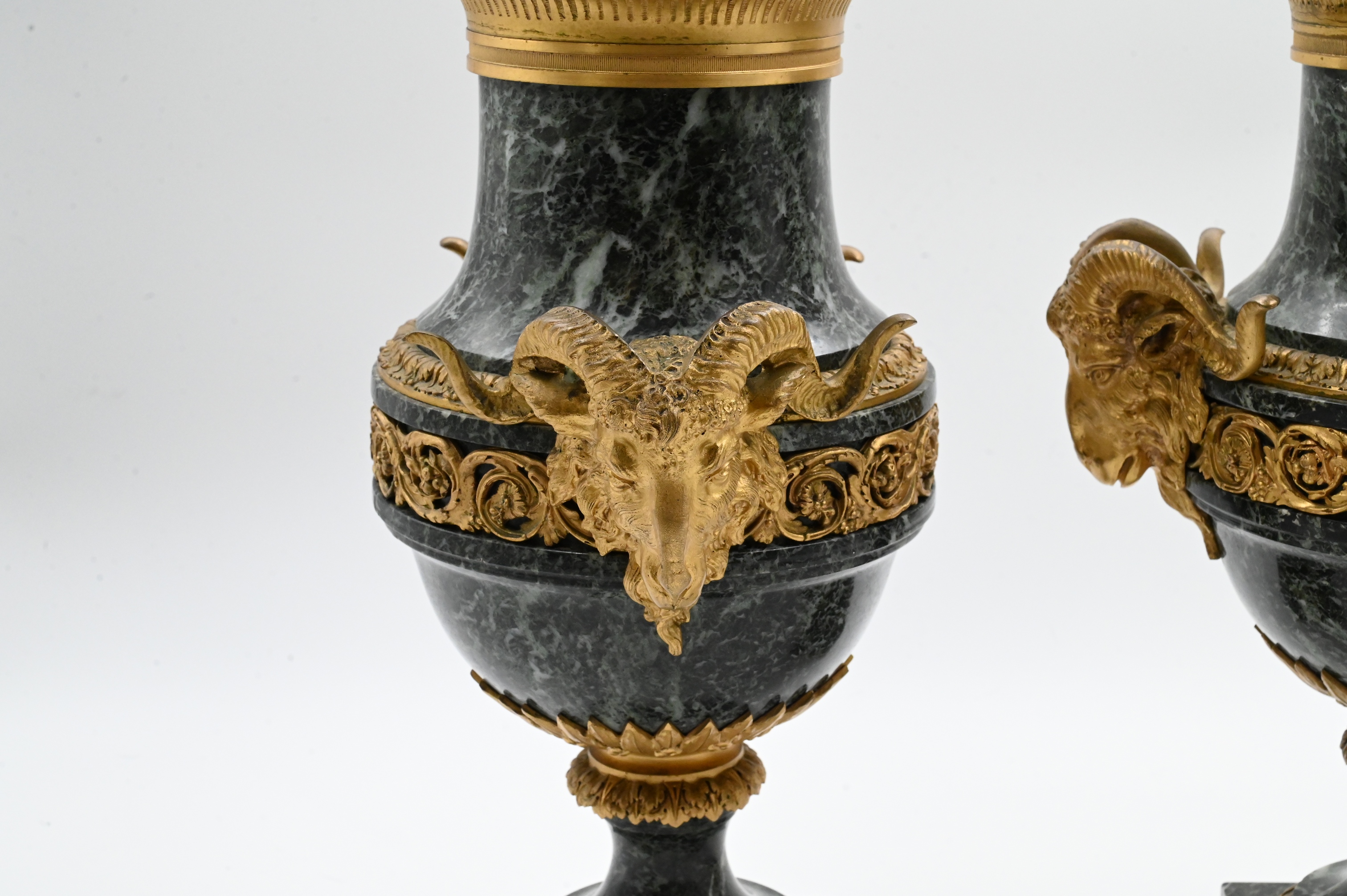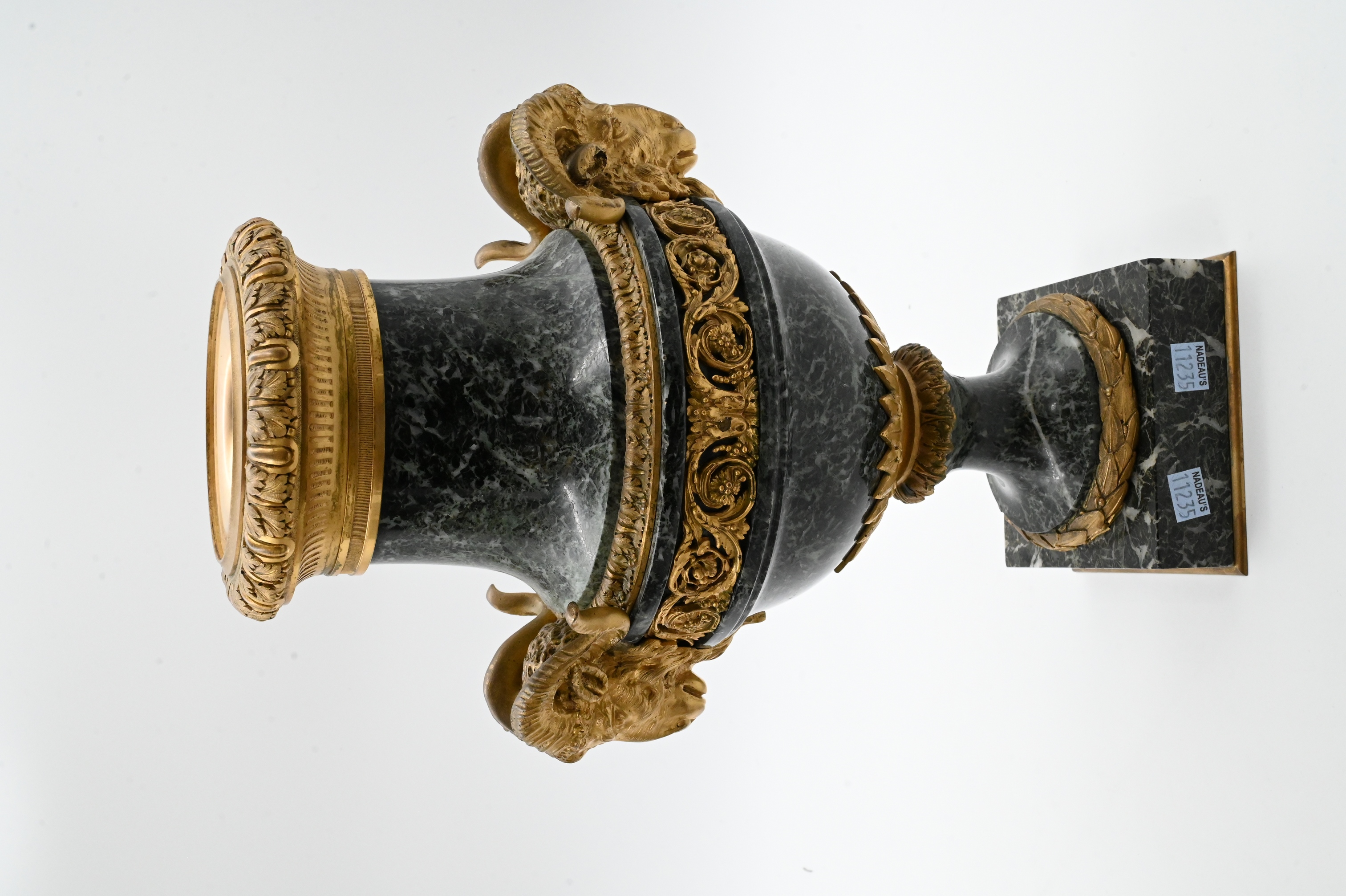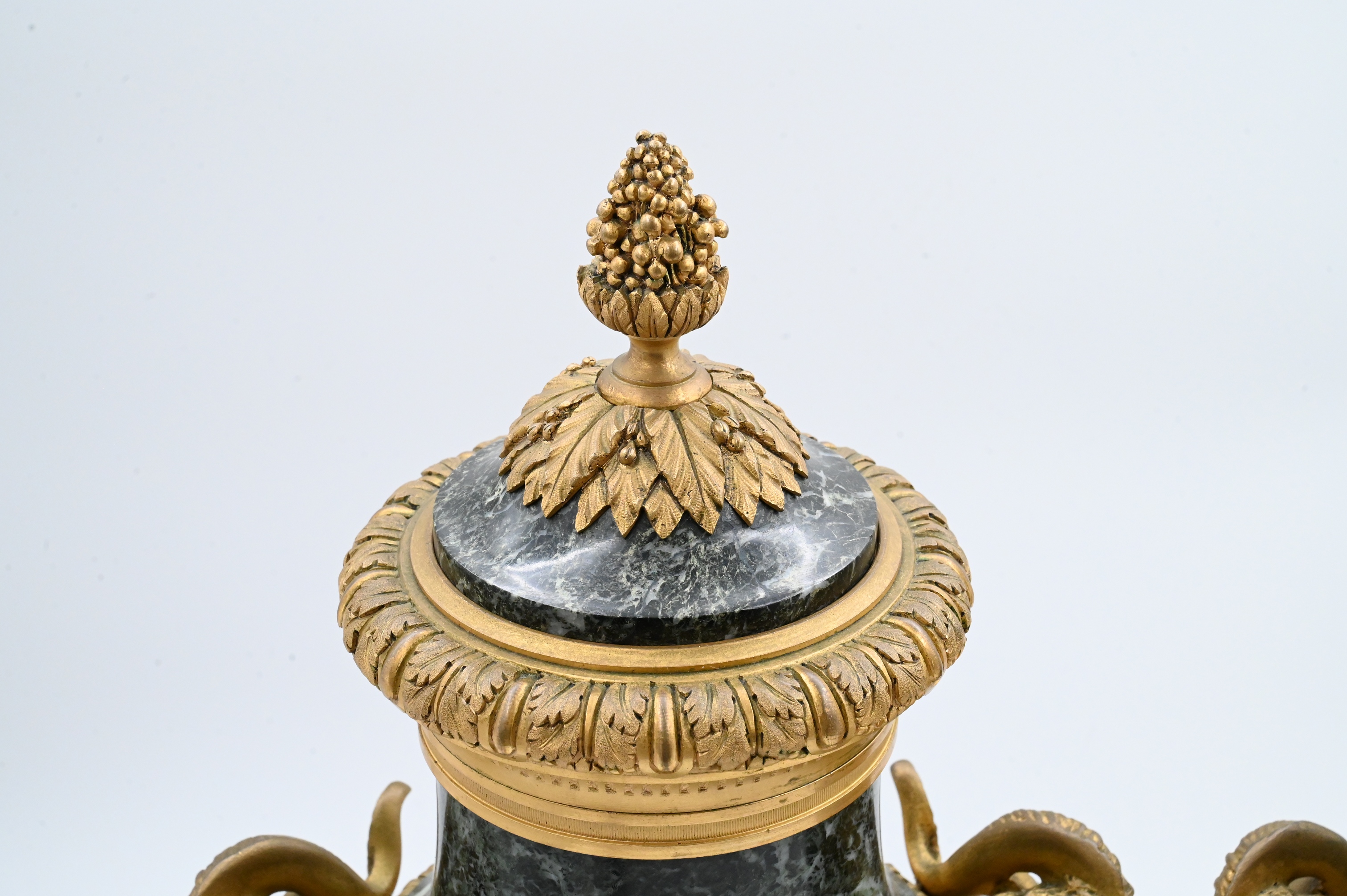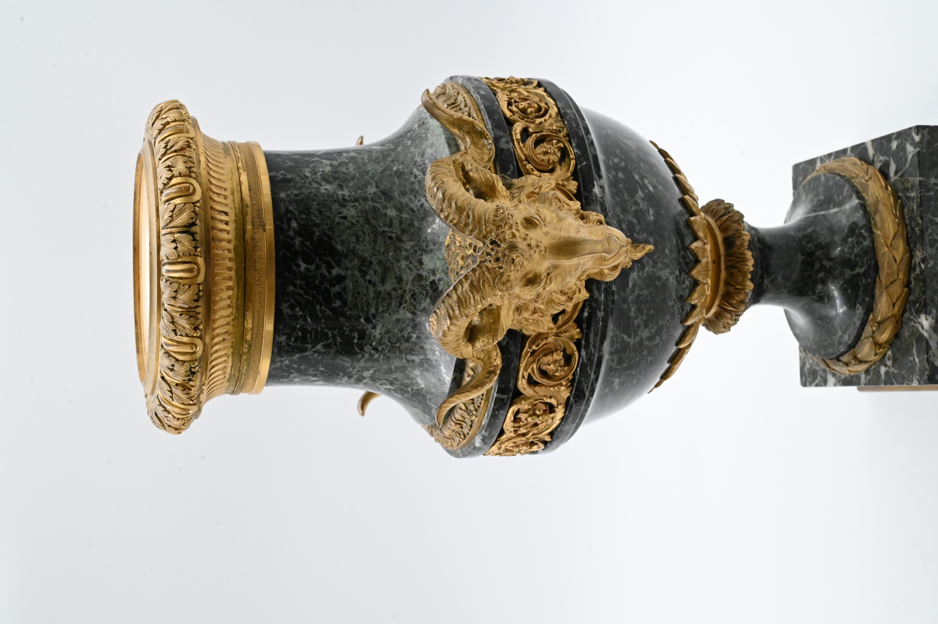 Lot 157: Pair of French Louis XVI Verde Marble and Gilt-Bronze Covered Urns