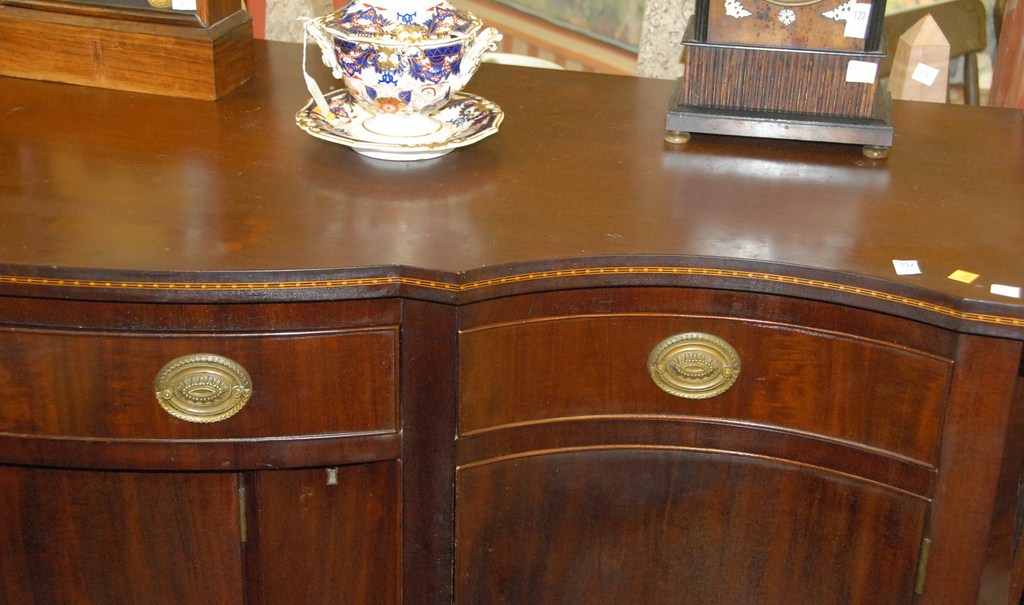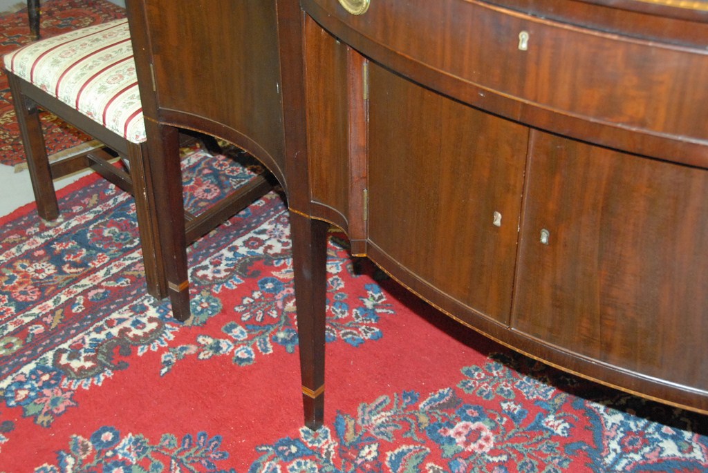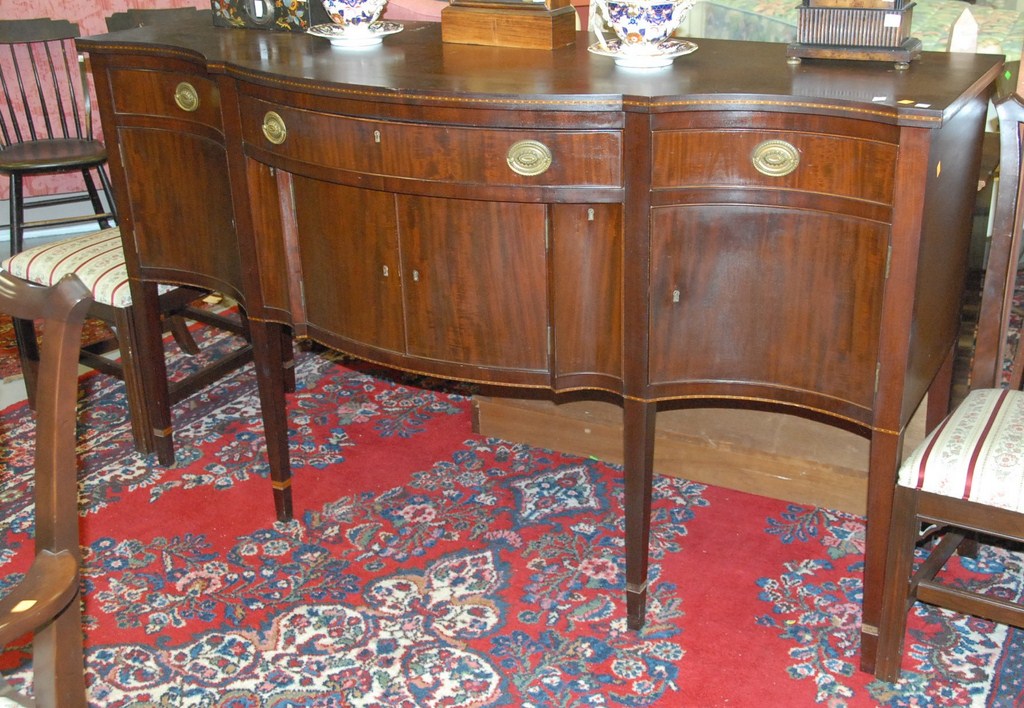 Lot 157: Signed Margolis Federal style mahogany sideboard having shaped top over three drawers over four doors and two bottle drawers on squa…