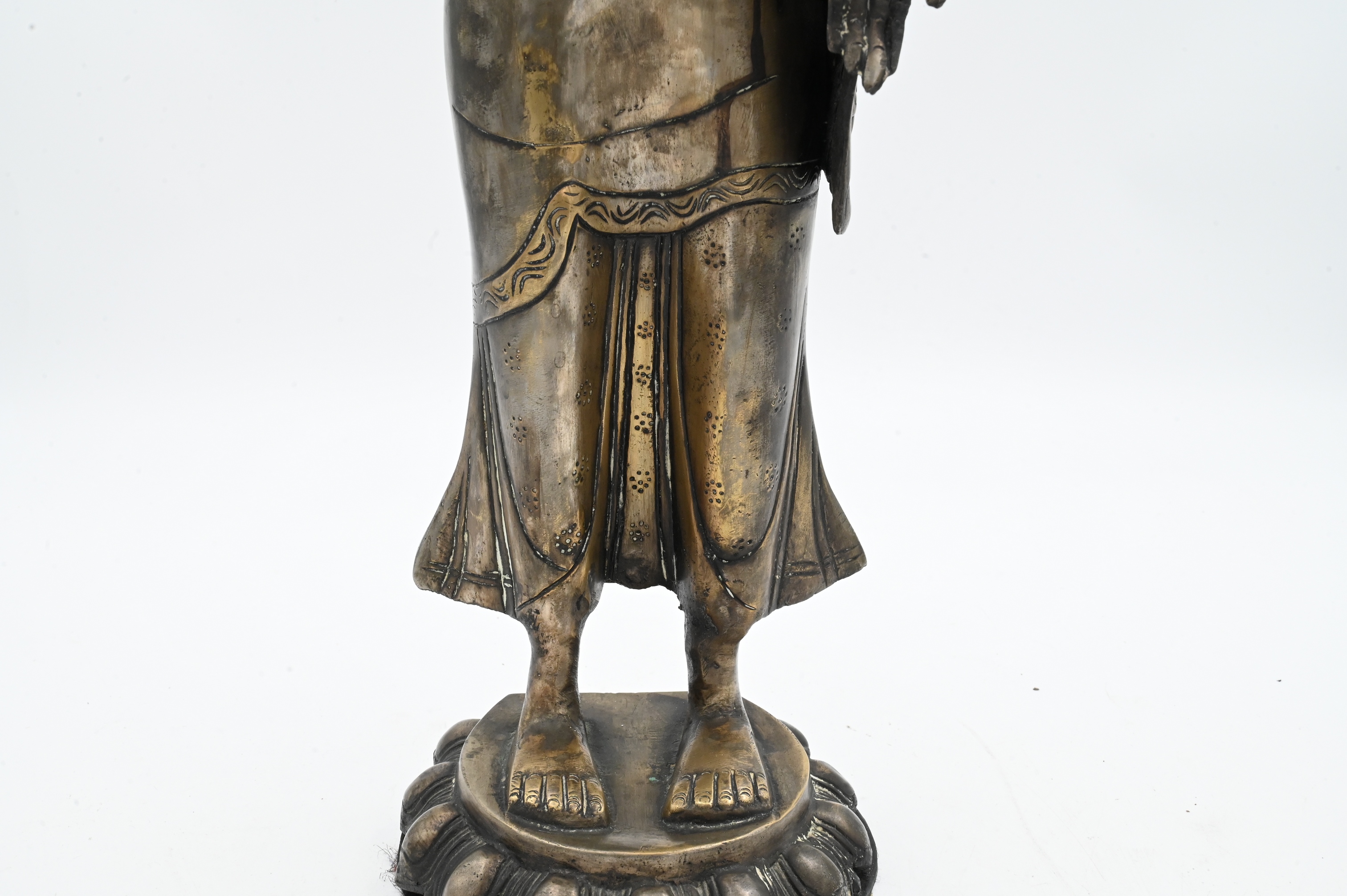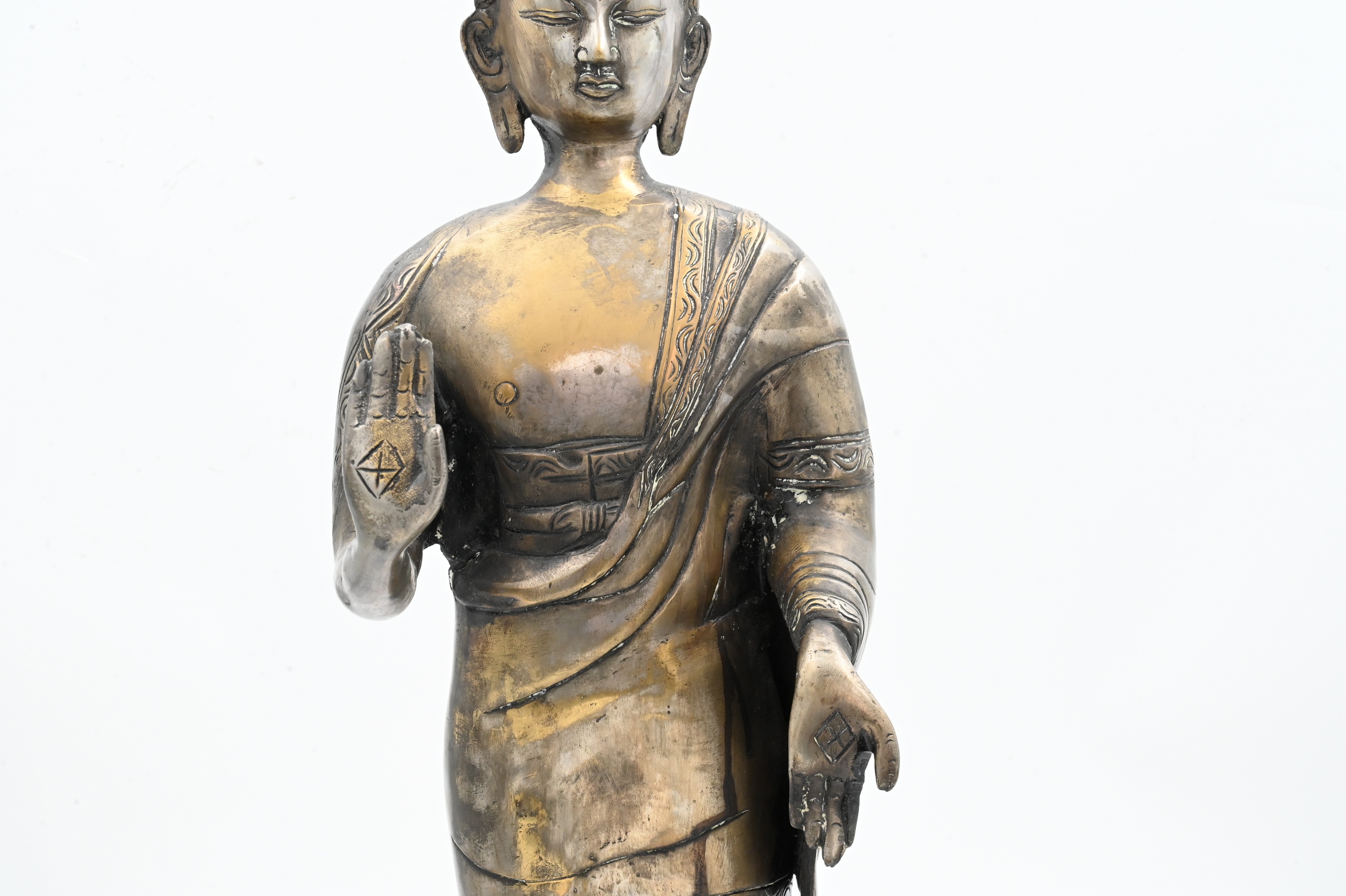 in East Asian fashion with elongated earlobes and extended hands in abhaya-mudra