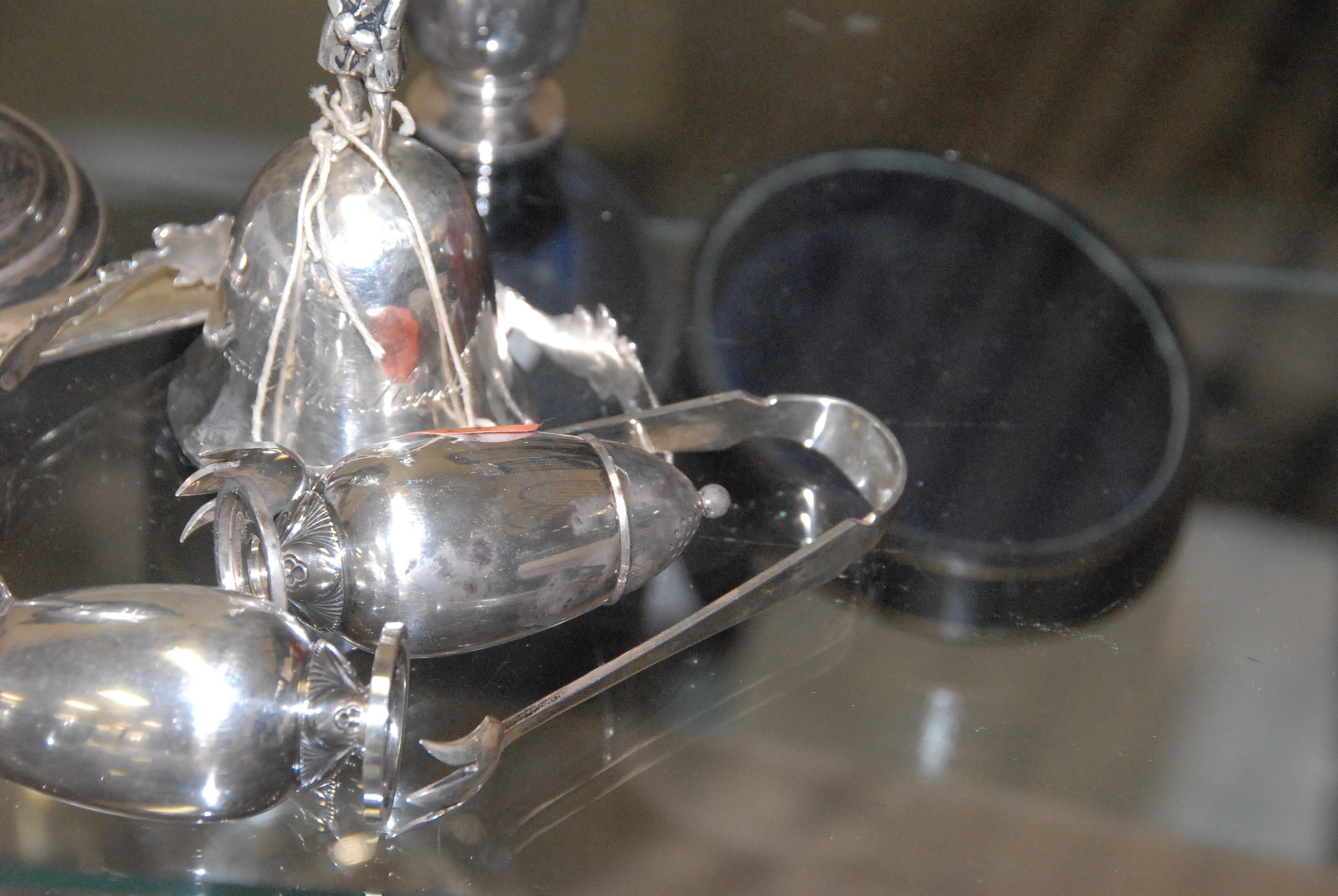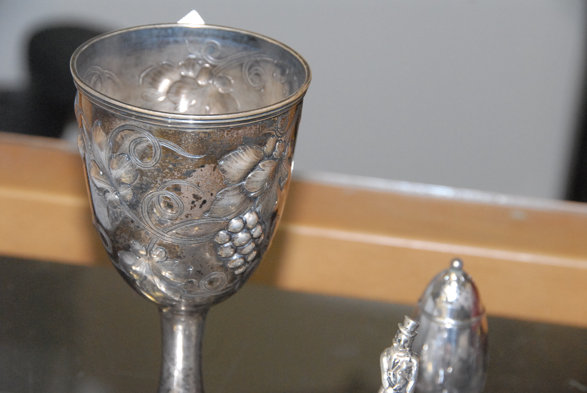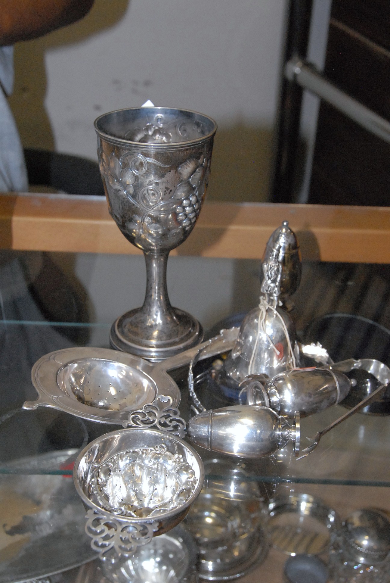 Sterling and coin silver lot to include three tea strainers, tongs, three George Jensen pepper shakers, bell, and a stemmed cup.