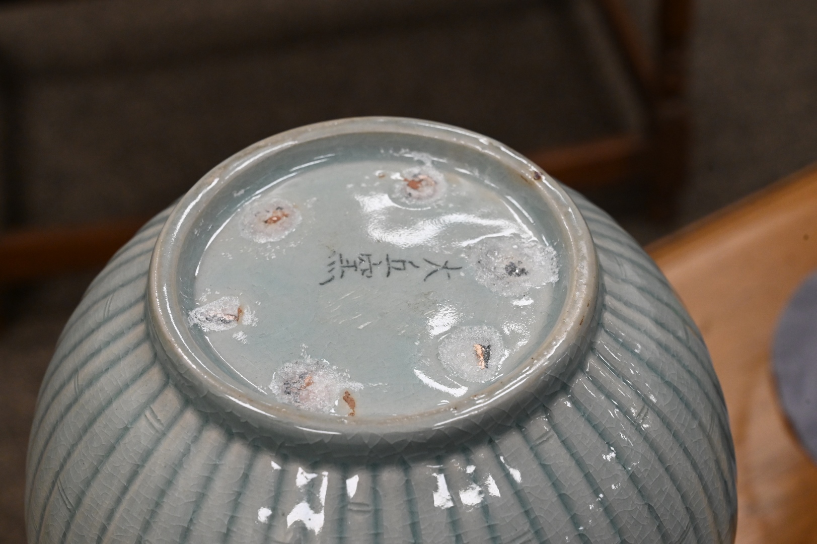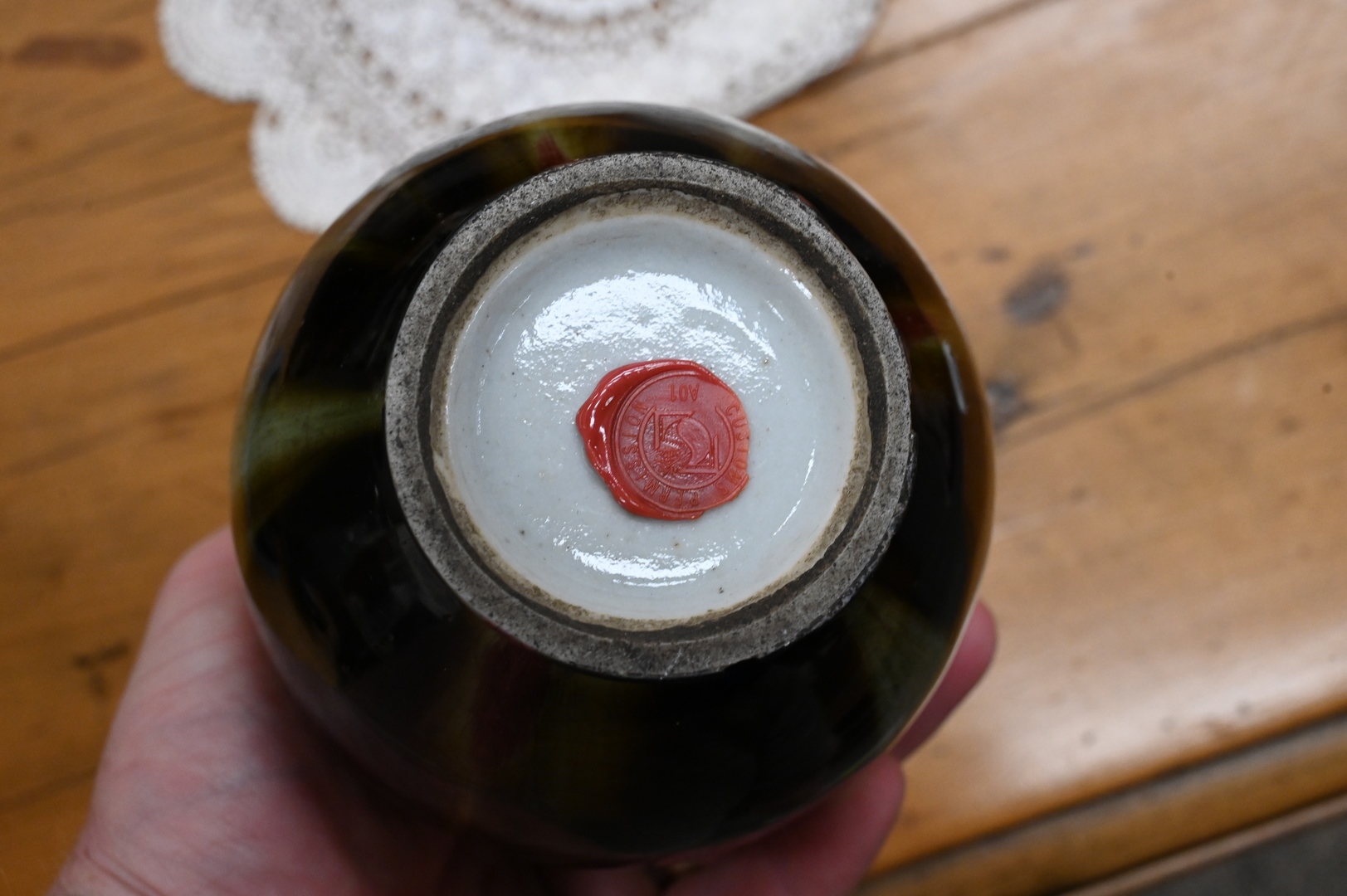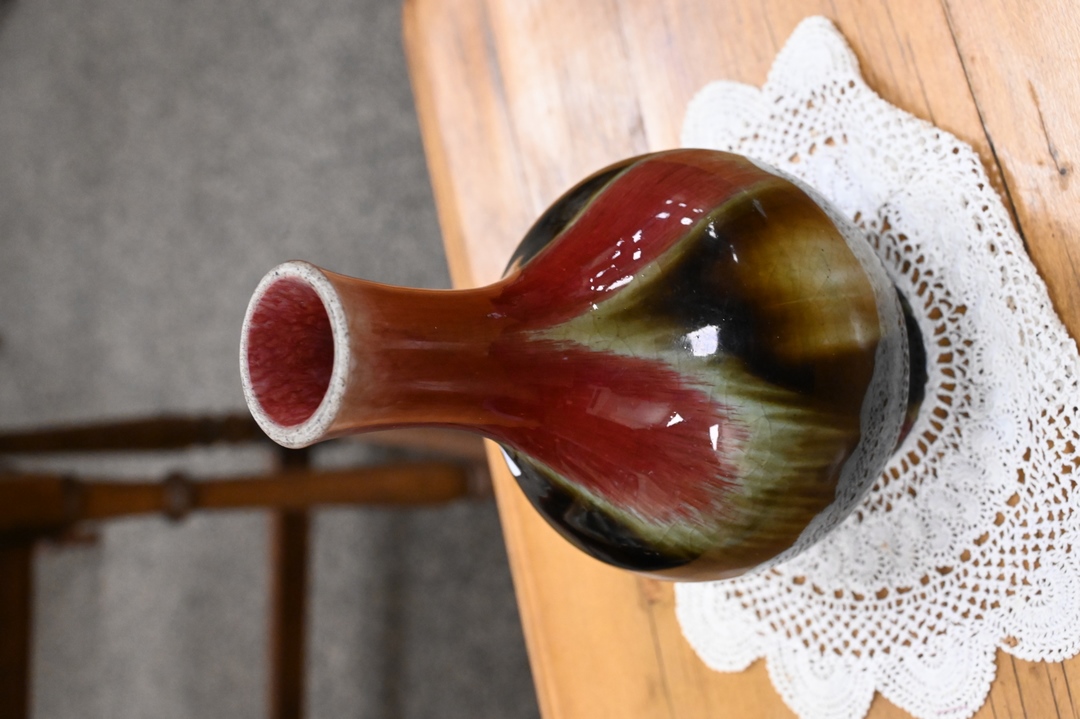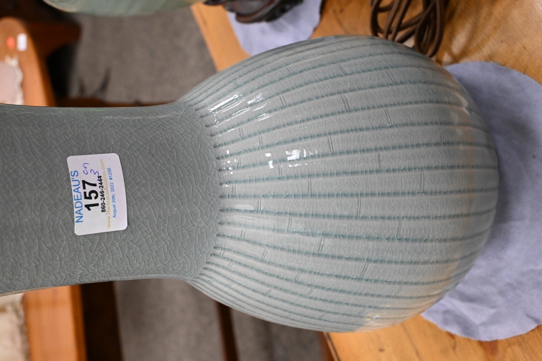Three Piece Group of Asian Porcelain, to include a Chinese celadon glazed vase made into a table lamp, small red and brown glazed bottle vase, along with a Japanese celadon glazed vase having incised bamboo; tallest 14 inches. Provenance: Estate of Peter Tillou, Litchfield, Connecticut.
