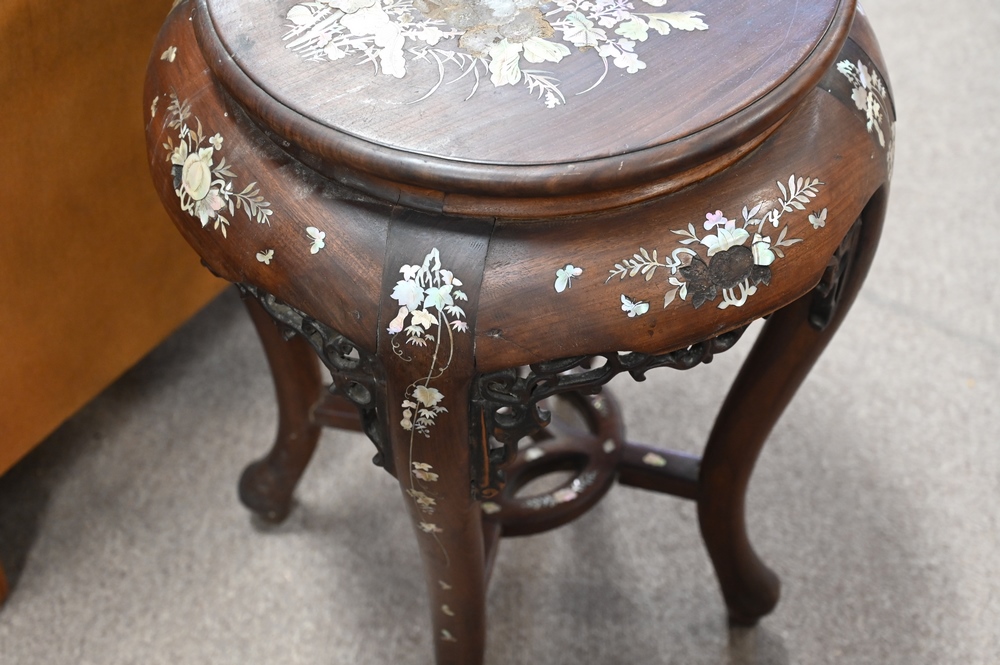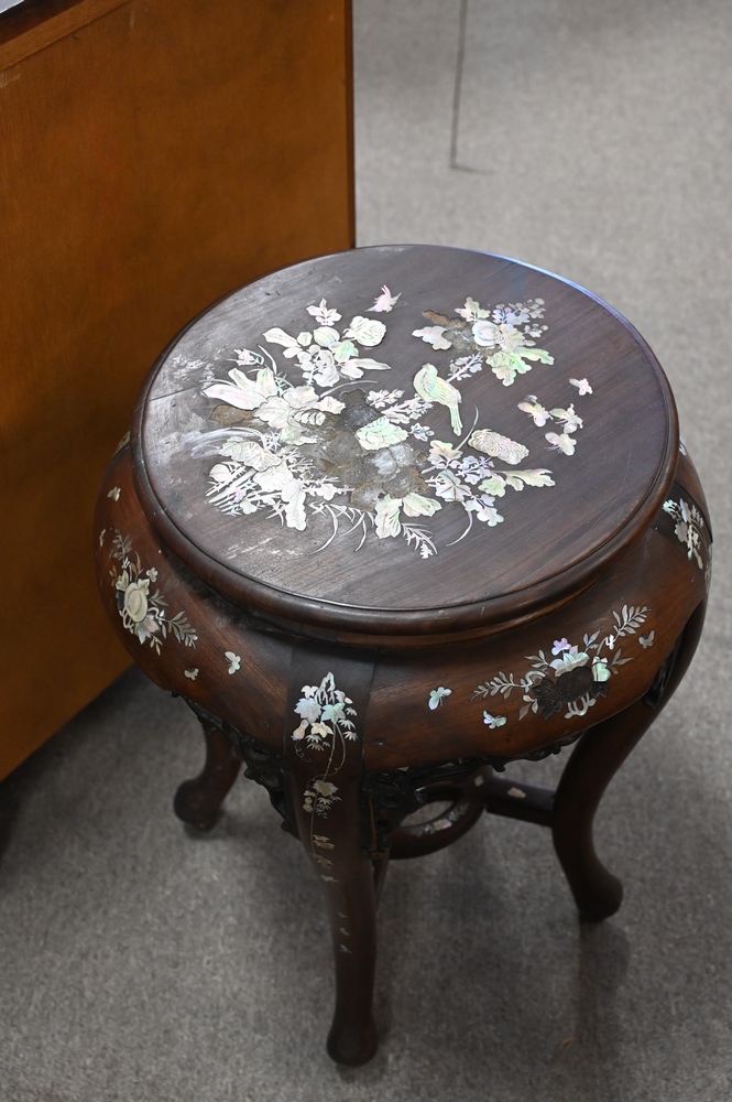 Two Piece Chinese Lot, to include a mother of pearl inlaid stand, height 23 inches; along with a tall hardwood stand, height 29 inches.