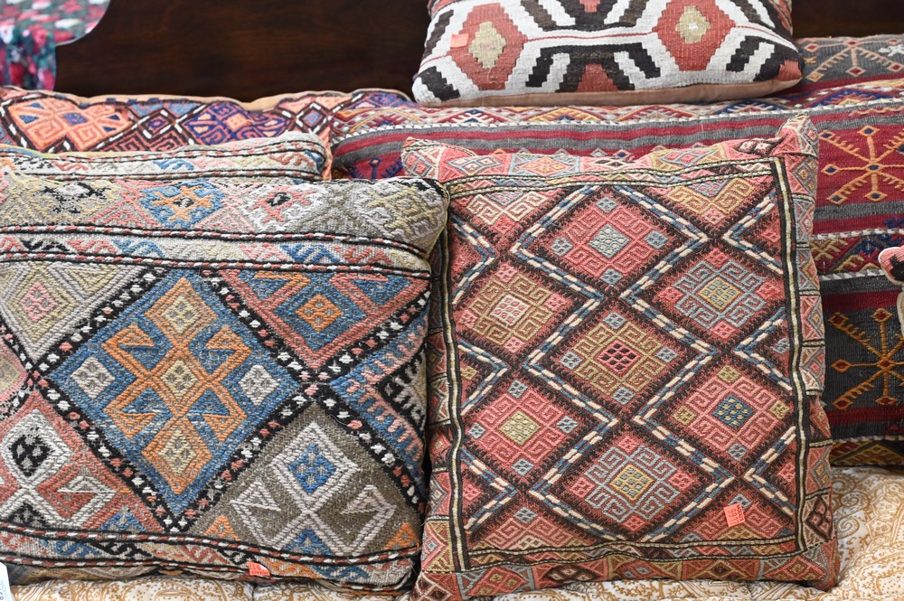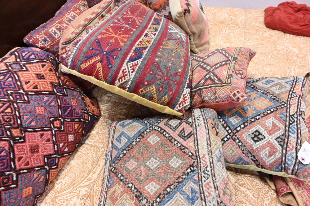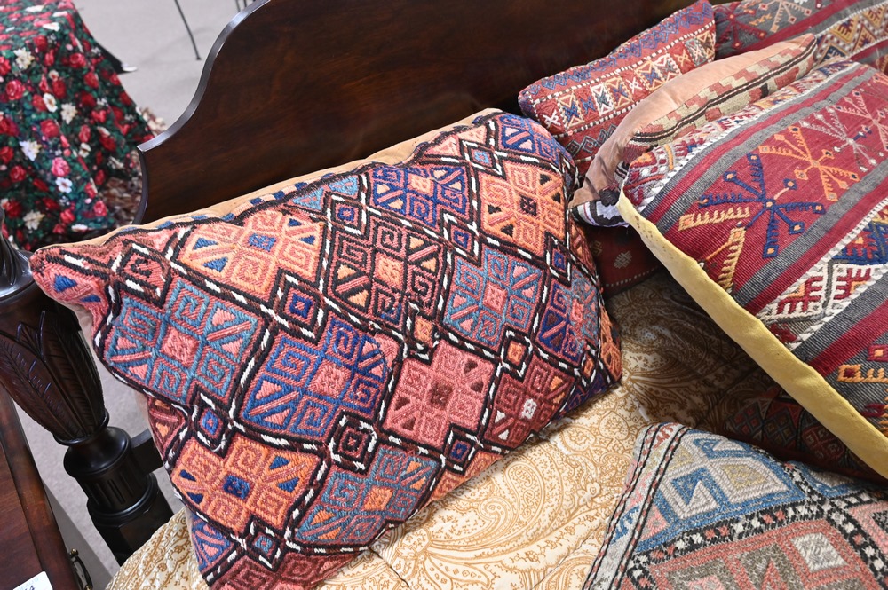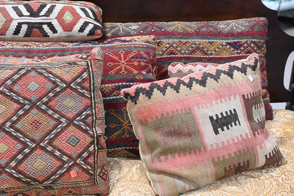 10 Pillows Made of Oriental Bag Faces, along with three early wall hangings.