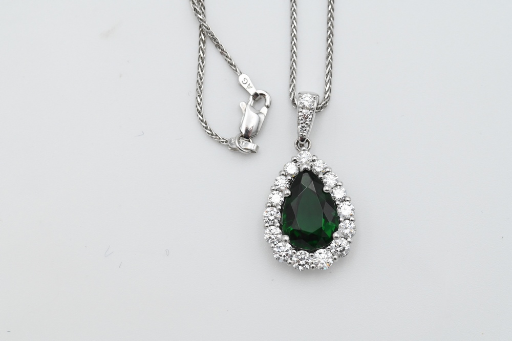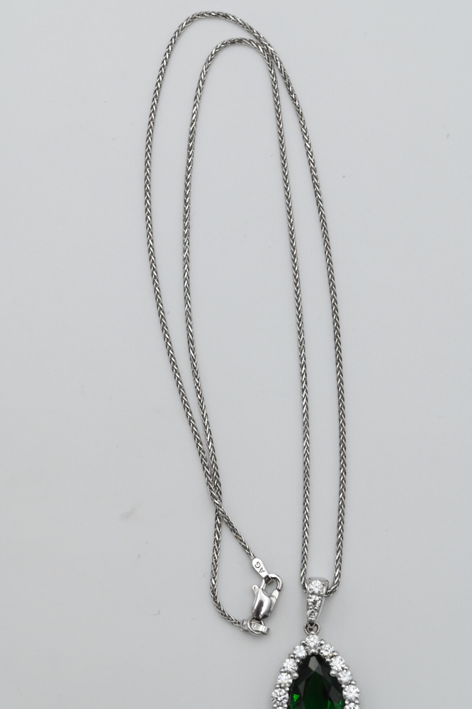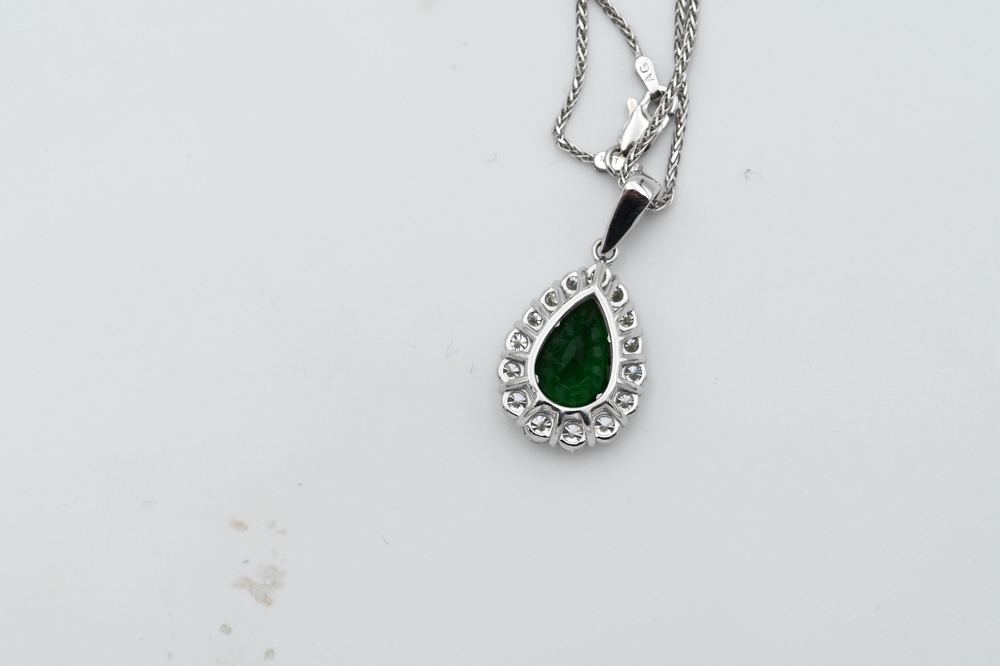 Lot 158: 18 Karat White Gold Pendant, containing one pear shaped mixed cut tourmaline, 2.96 carats; surrounded by round cut diamonds; length …