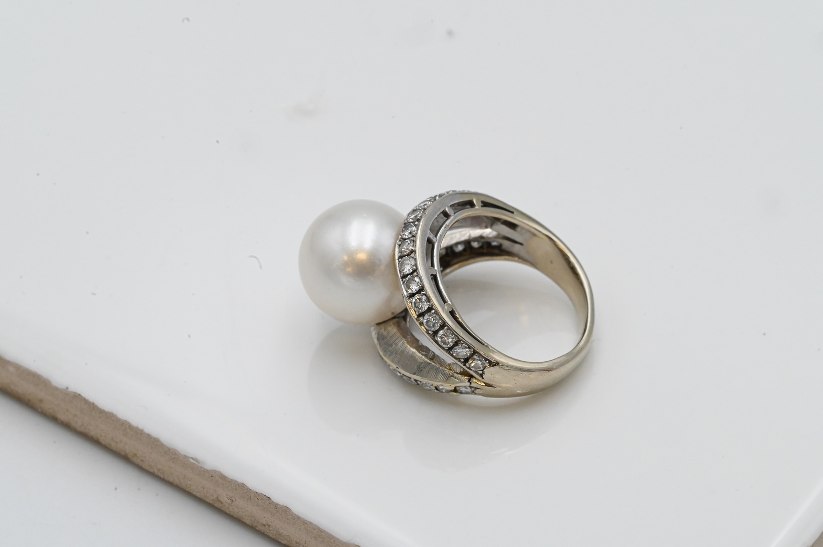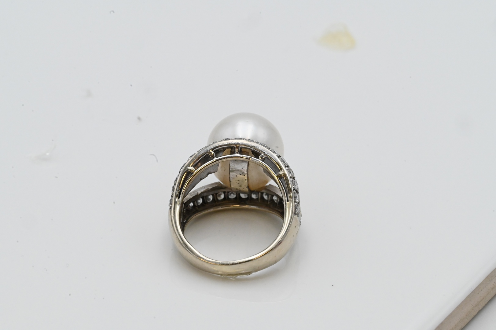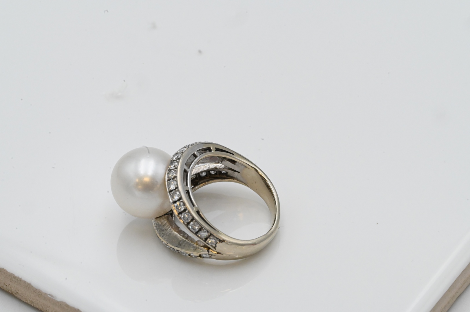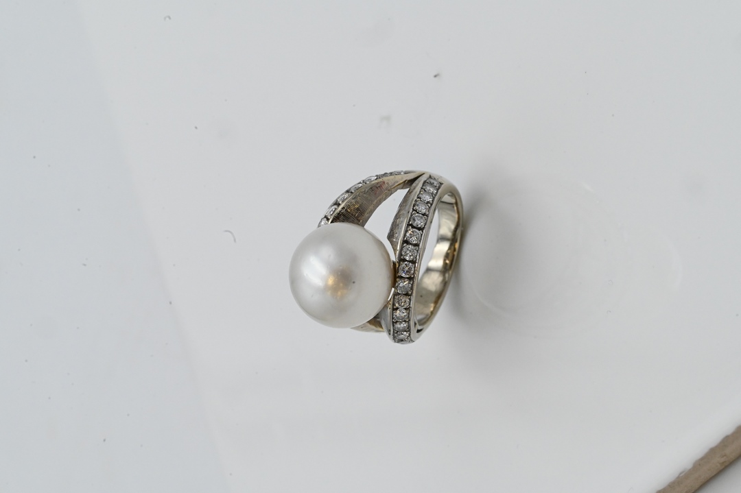 set with central pearl along with channel set bands of diamonds