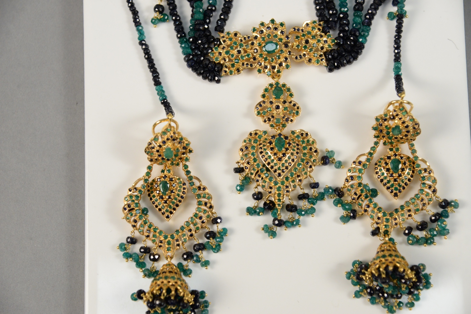 Lot 158: 22 Karat Gold Necklace and Earrings set with emeralds, and sapphire bead work 133 grams total weight without the string necklace