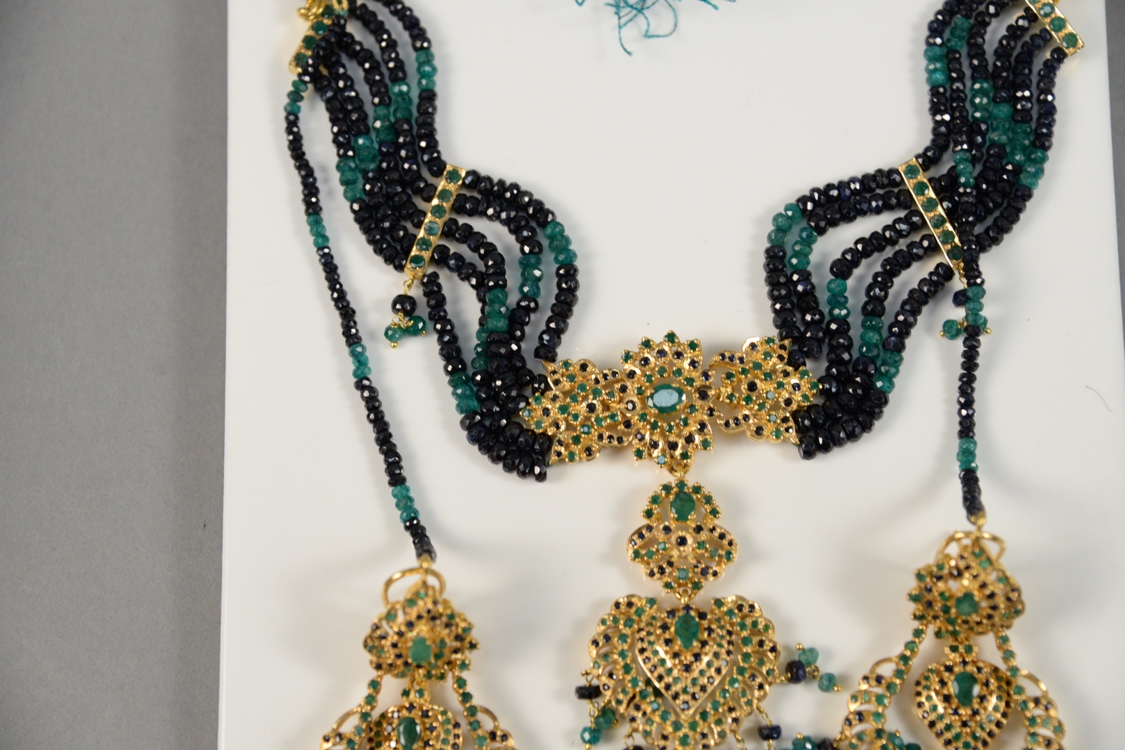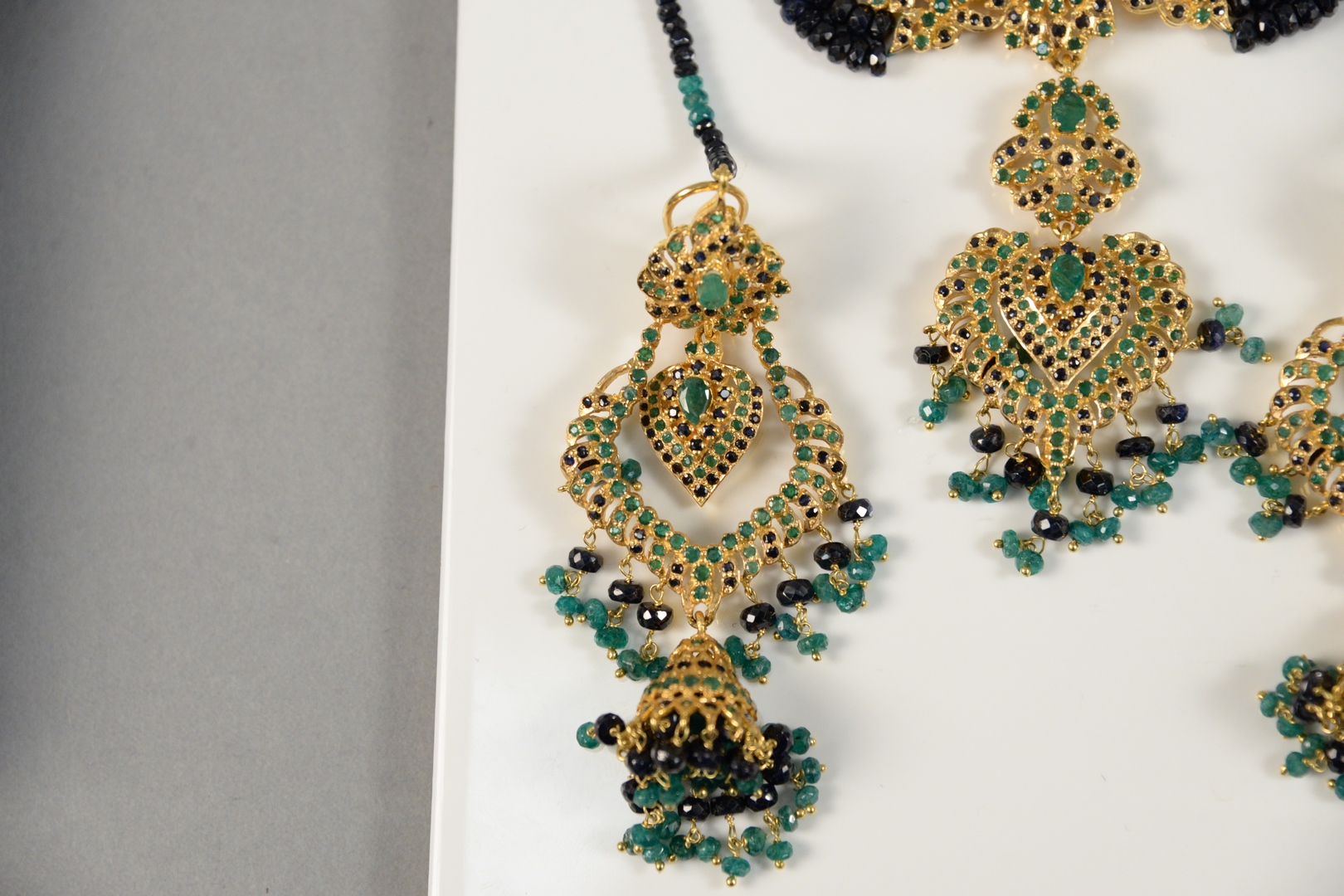 set with emeralds, and sapphire bead work