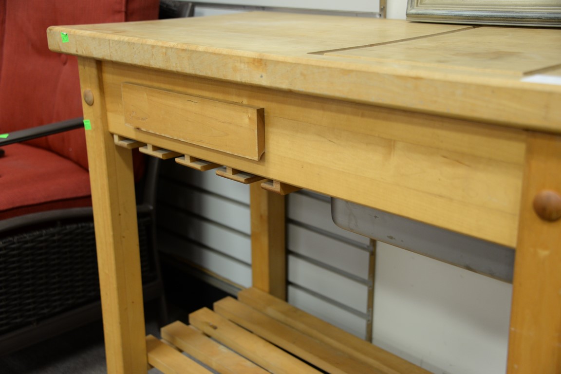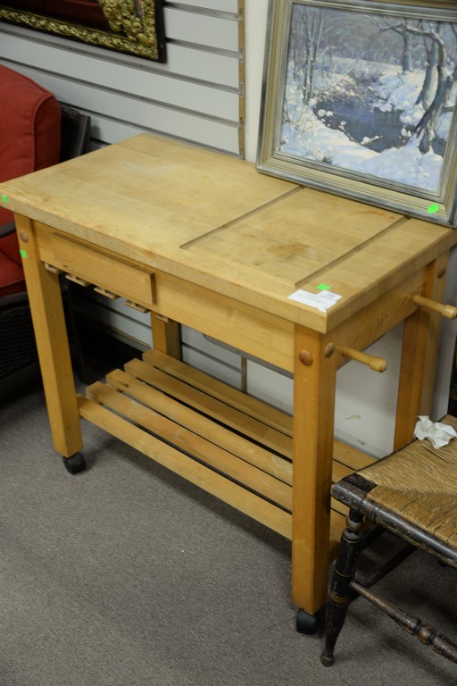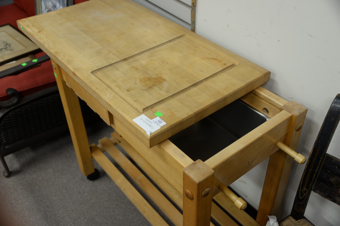 Lot 158: Butcher block serving cart on wheels with sliding top opening to a stainless sink signed Le Gourmand. ht. 32in., wd. 36in., dp. 19in.