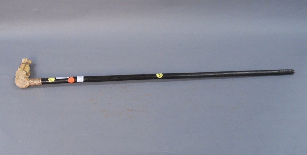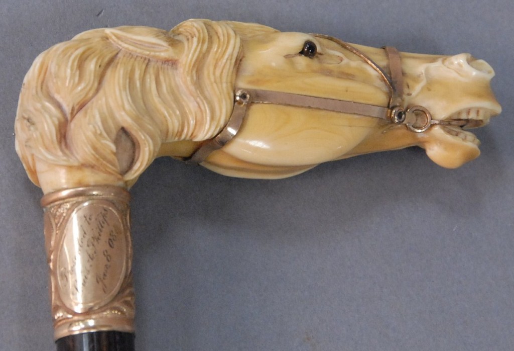 Cane with carved ivory horse head having gold bridle, marked Presented to Louis Phillips 1908. length 35in.