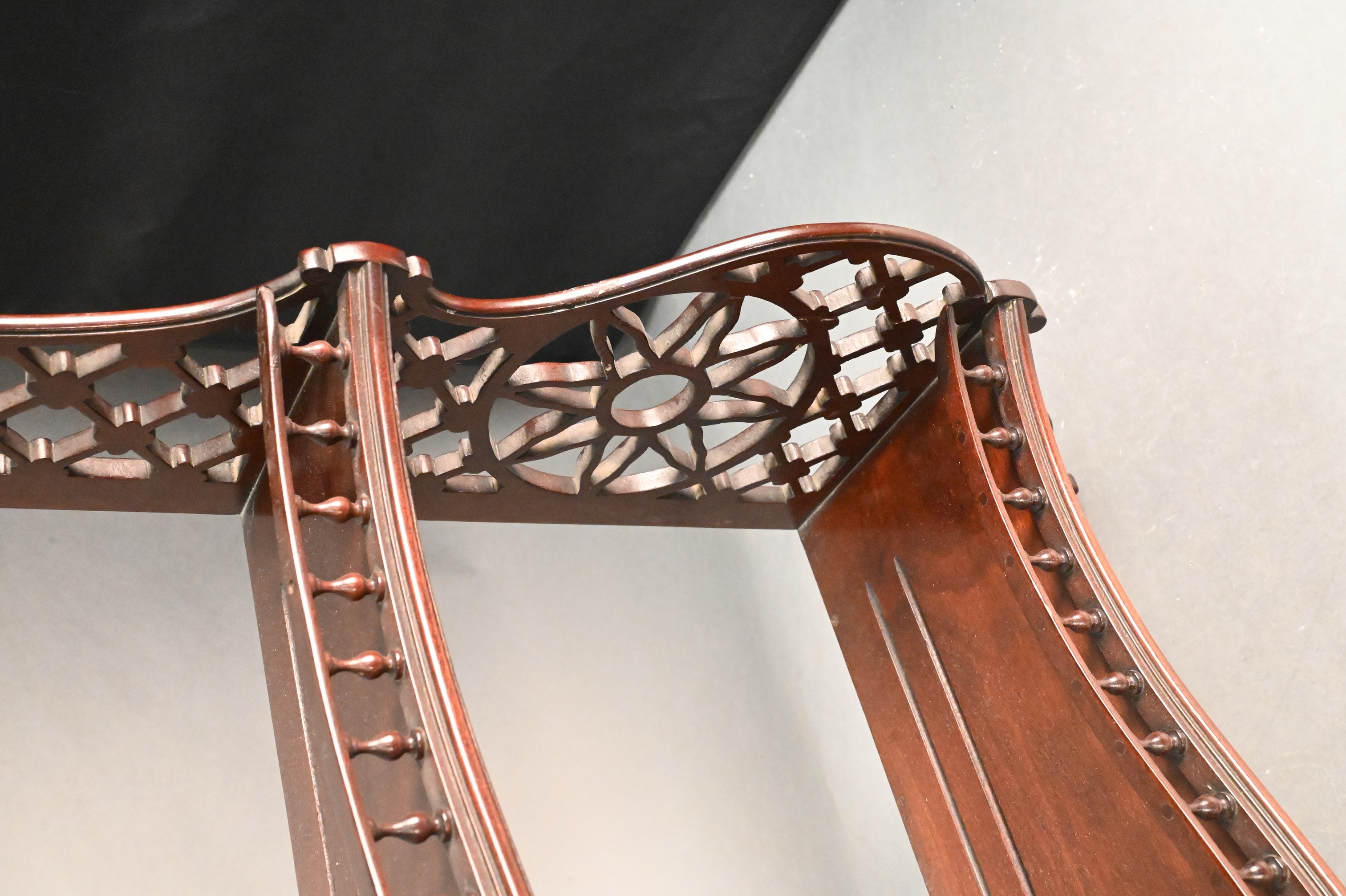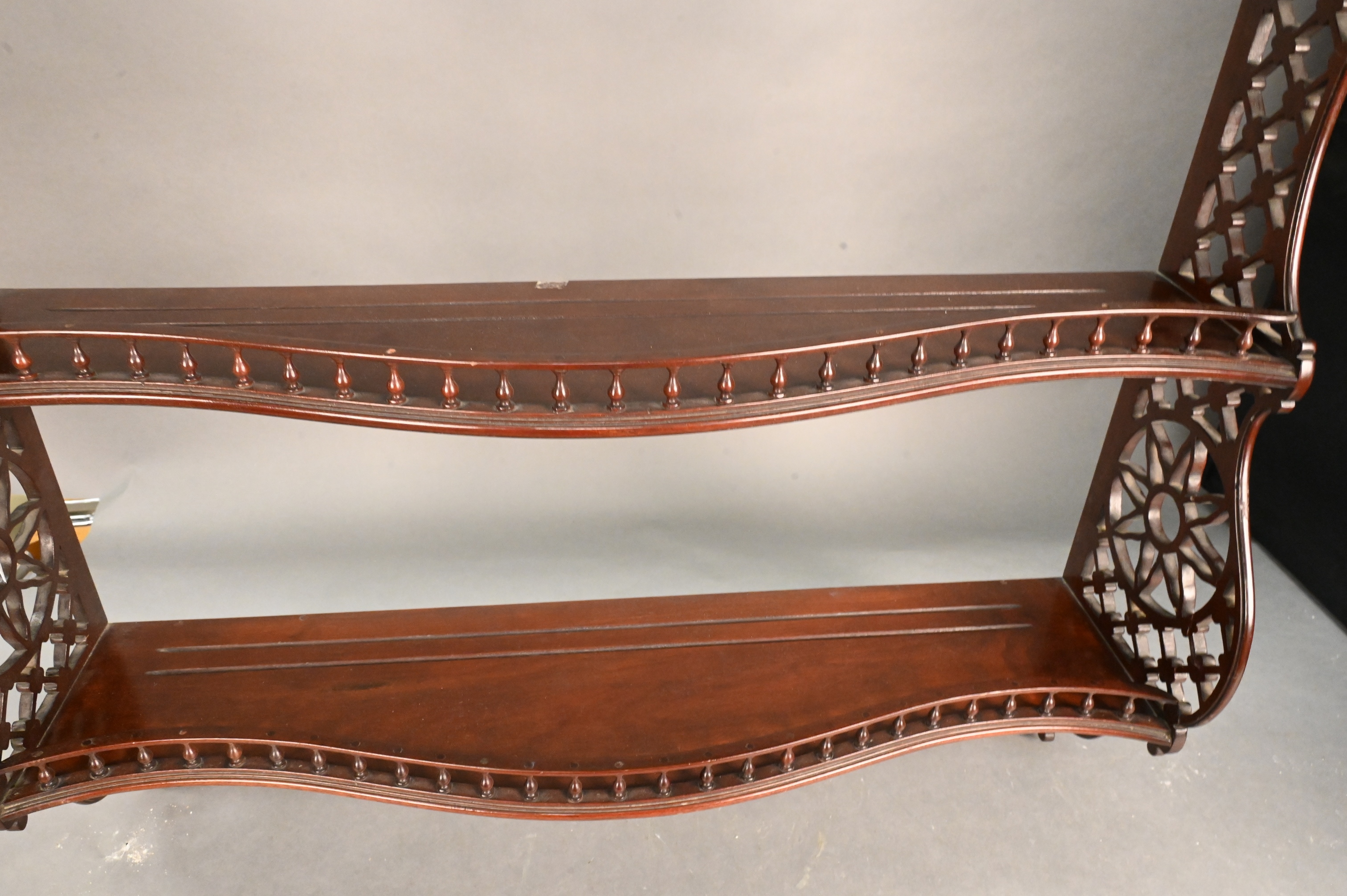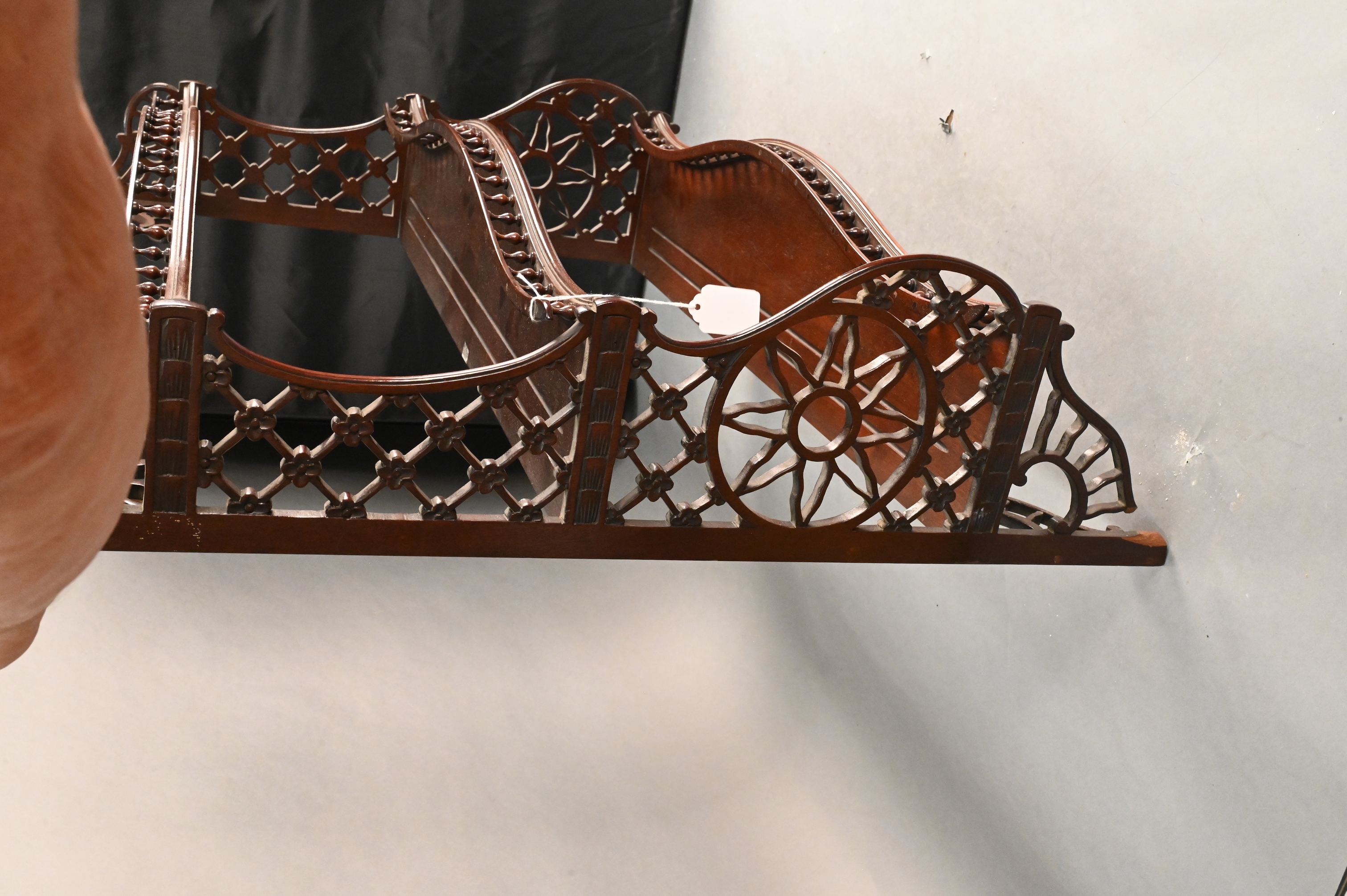 having galleries on three shelves, sun medallion, design on sides, dovetail joints, chip to bottom right