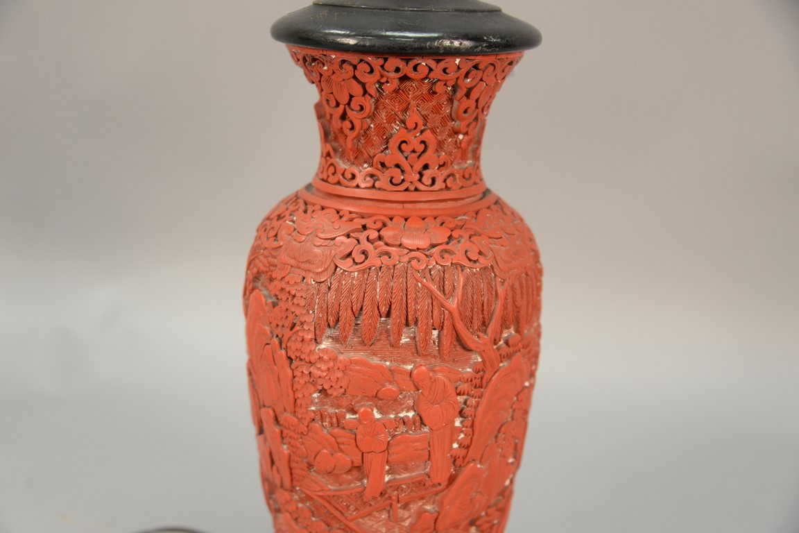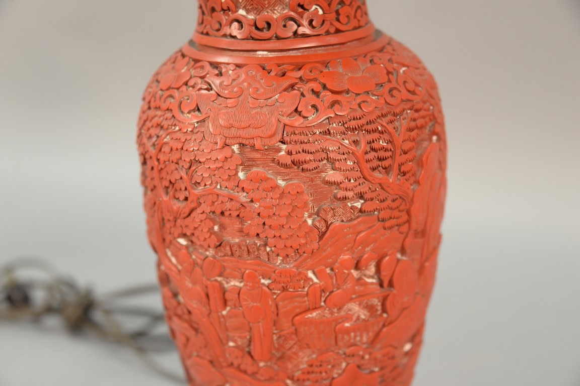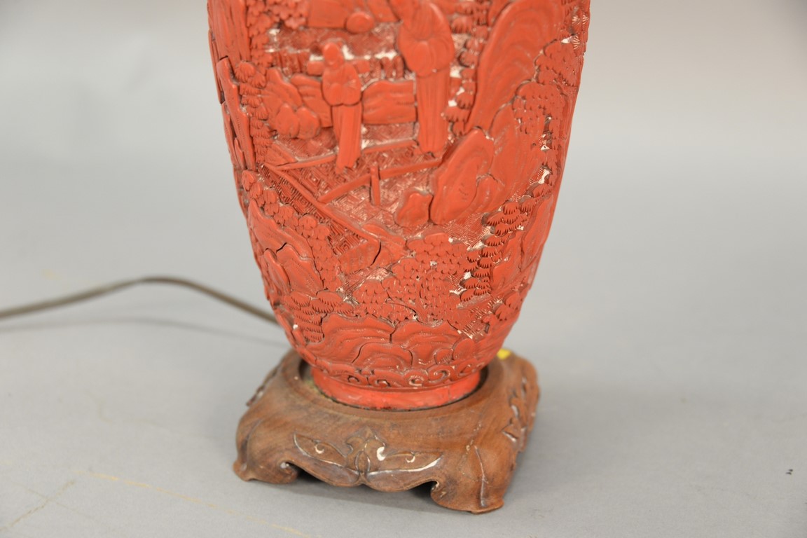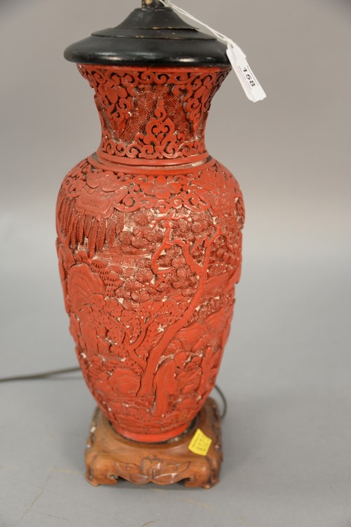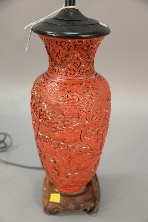 Lot 158: Chinese cinnabar vase with landscape design, made into a table lamp, on a carved hardwood stand. lamp ht. 12in.