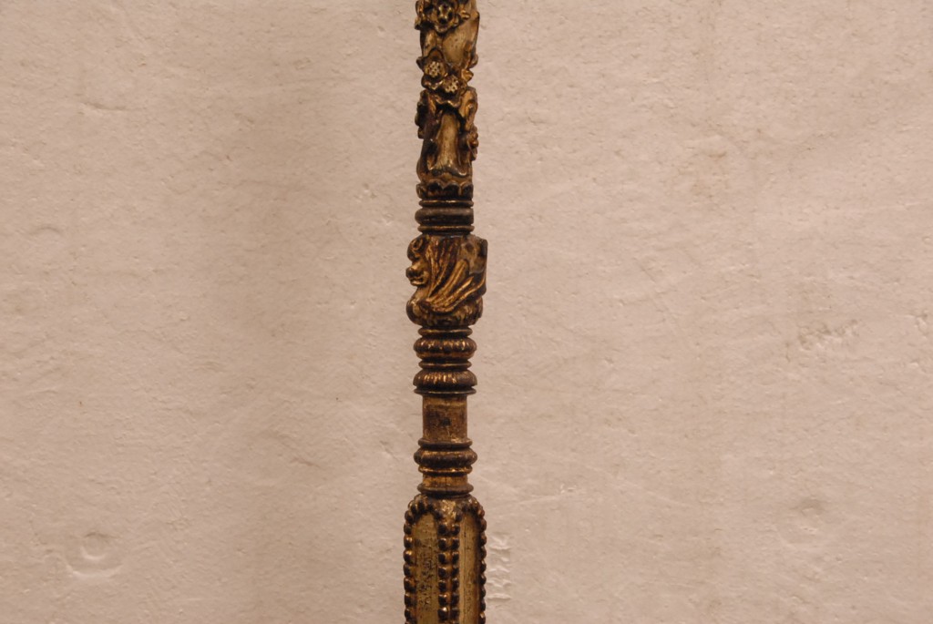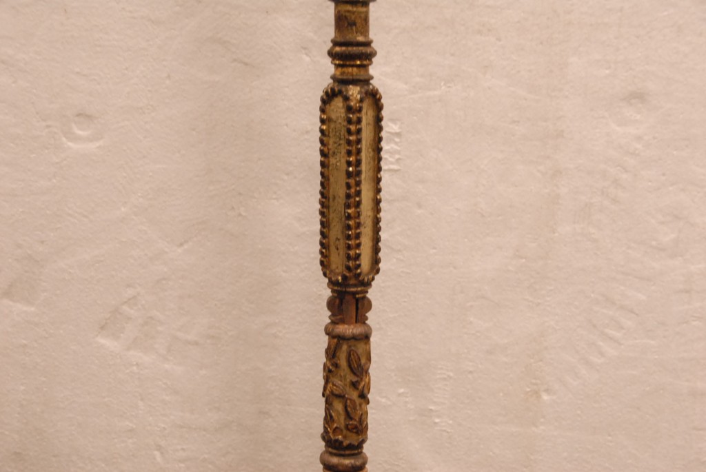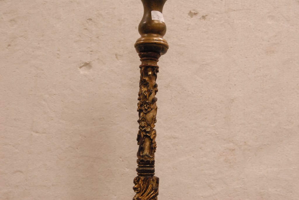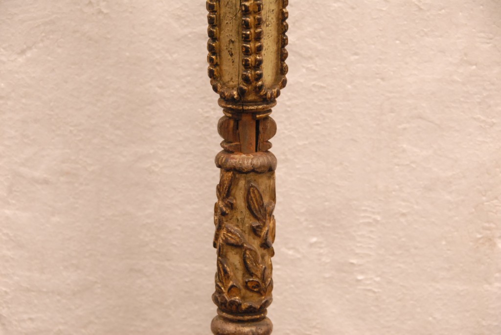 Early wooden candlestick with gilt decoration with bronze top and bottom chipped.