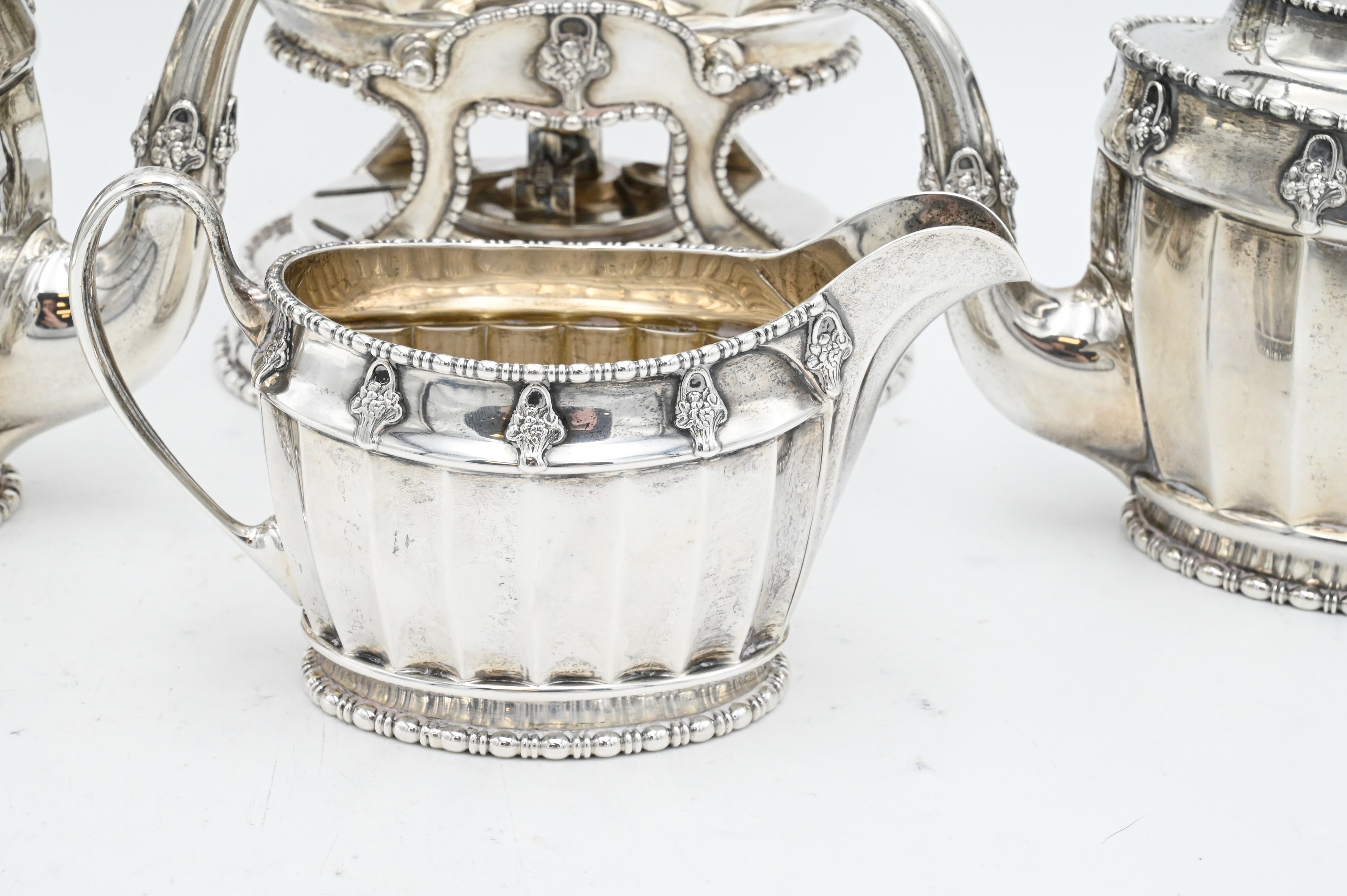 consisting of tilting hot water pitcher, teapot, coffee pot and matching cream pitcher, having embossed floral basket motifs, floral finials and beaded base, marked Gorham Black Starr and Frost