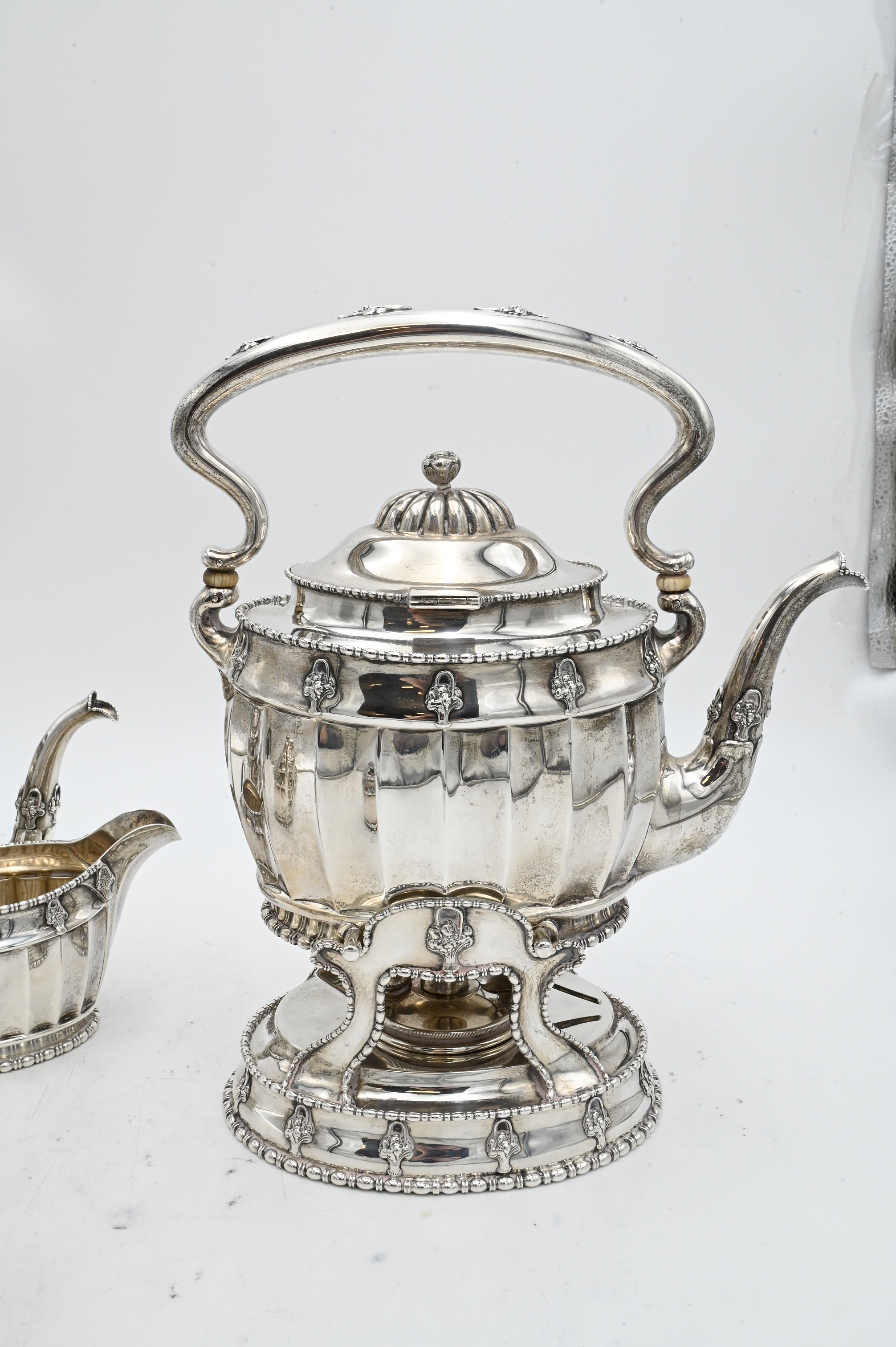 Condition: coffee pot handle slightly loose, and spacers cracking, finial bent, creamer with pin head sized ding to inside, tea pot with pin head dings to lower handle, tilting water pot with two small dings to backside, handle loose, light scuffing to all throughout
