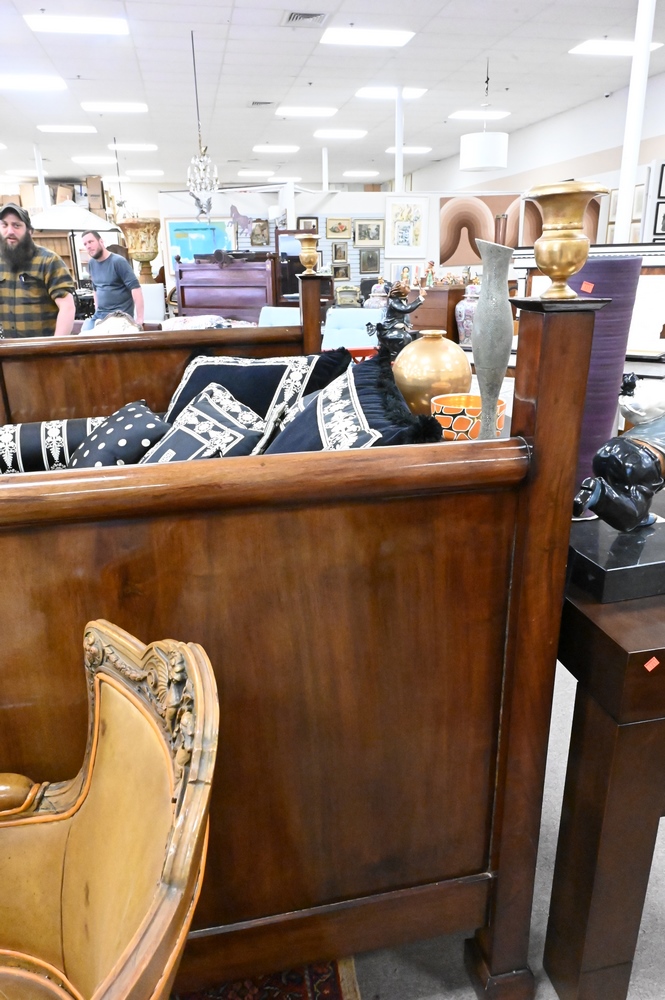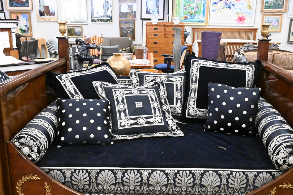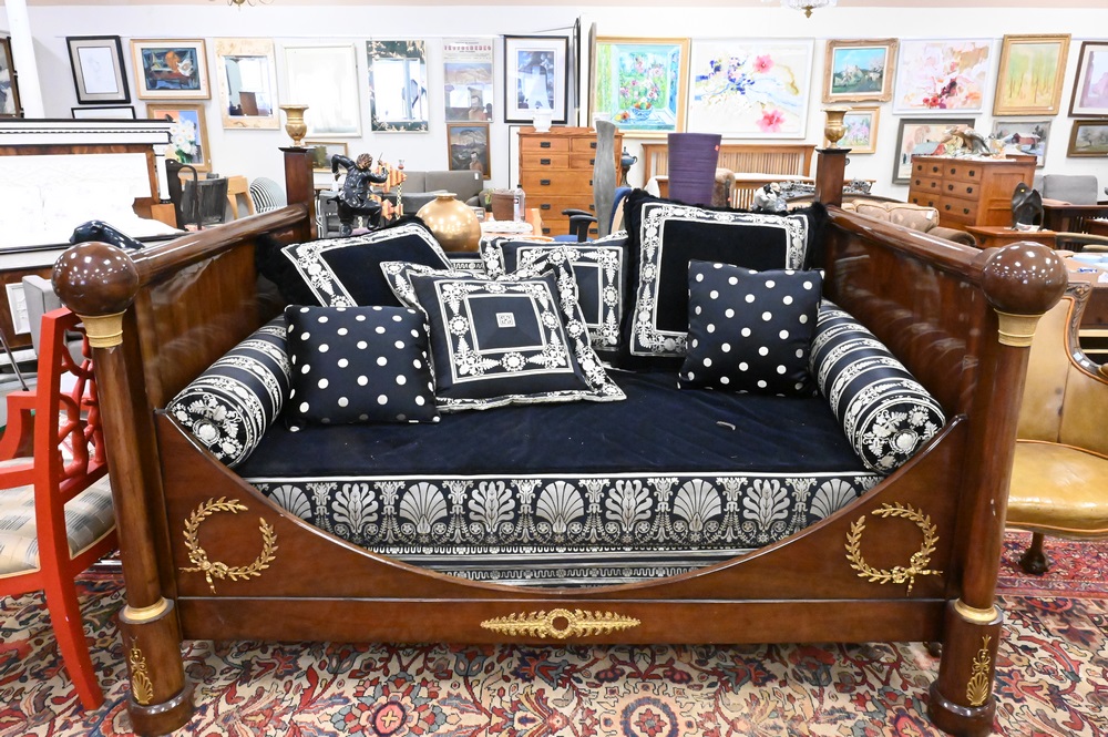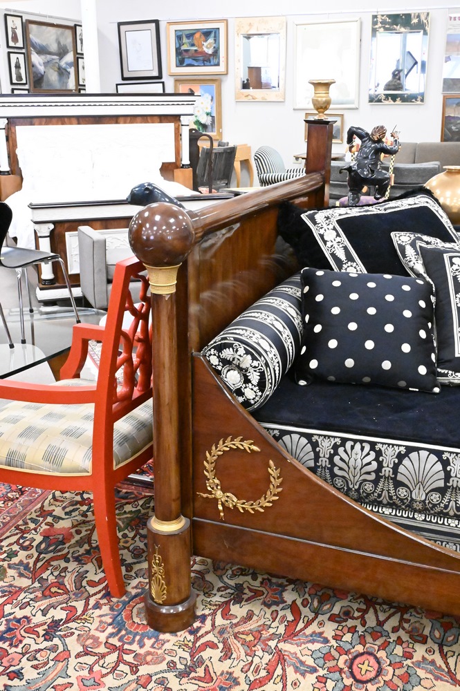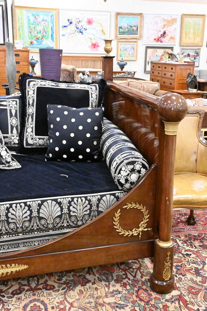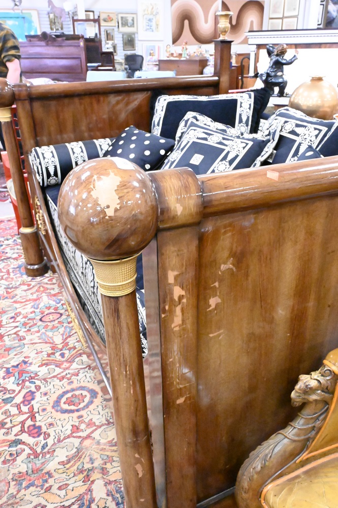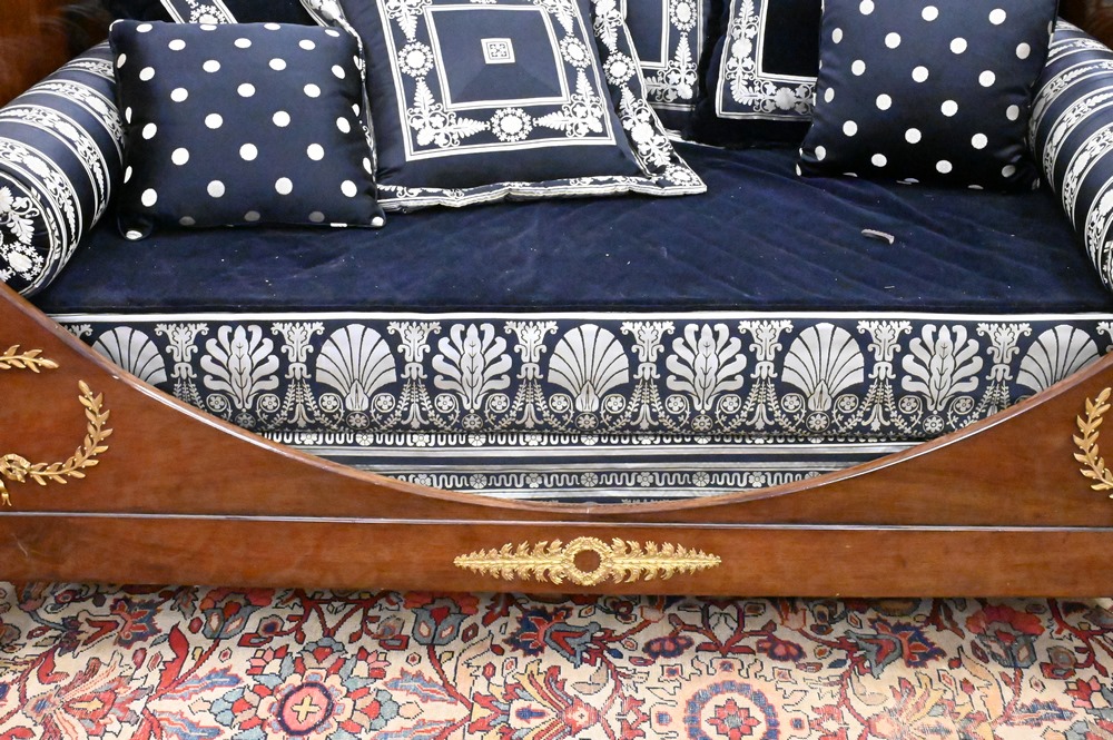 Lot 158: French Empire Mahogany Daybed, having gilt urn top, bronze mounts and capitals, custom upholstered mattress, pillows and bolsters, interior dimensions 48 x 75 inches, height 57 1/2 inches, length 80 inches, total depth 57 inches, (sun dried on right side).