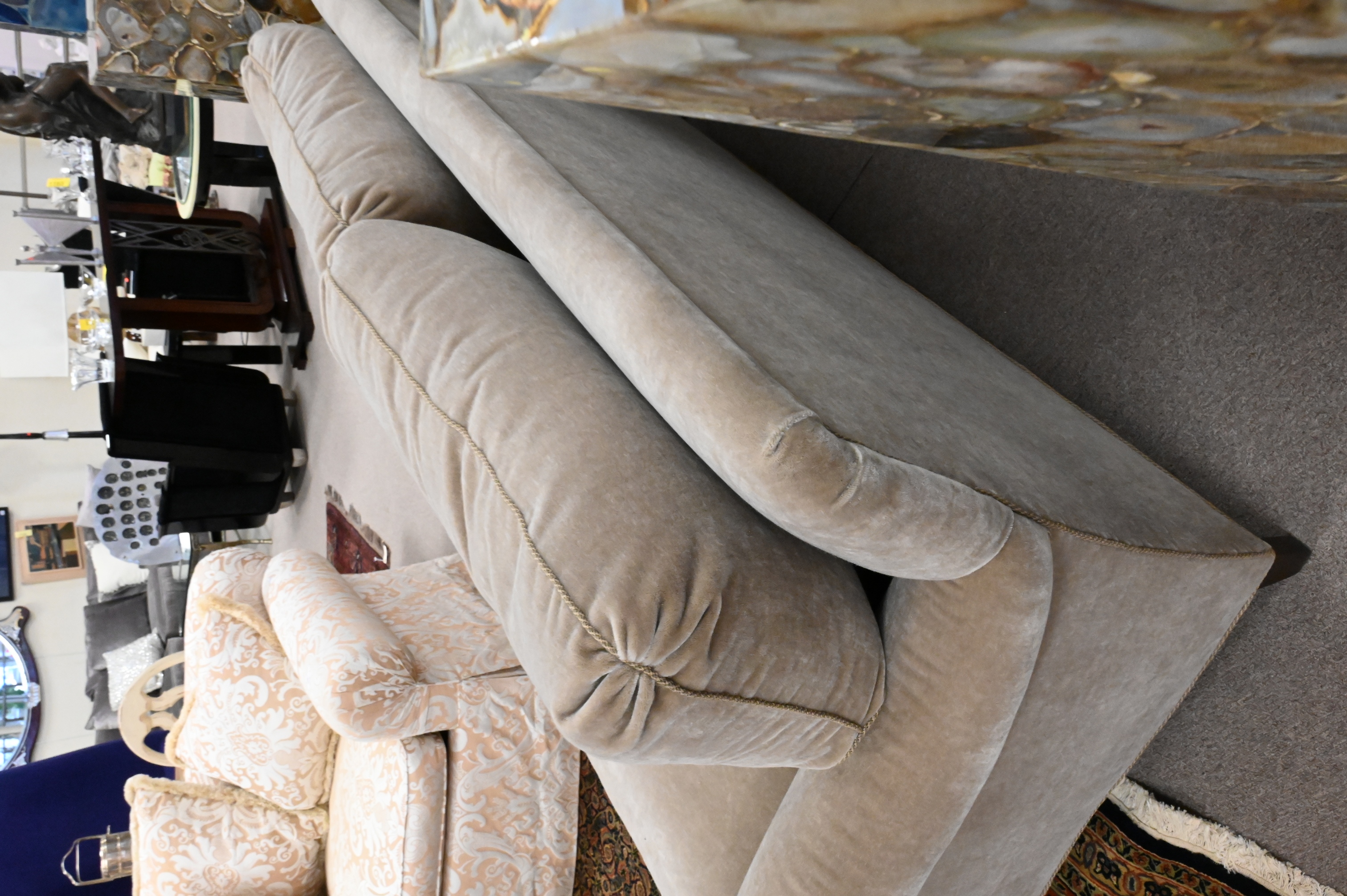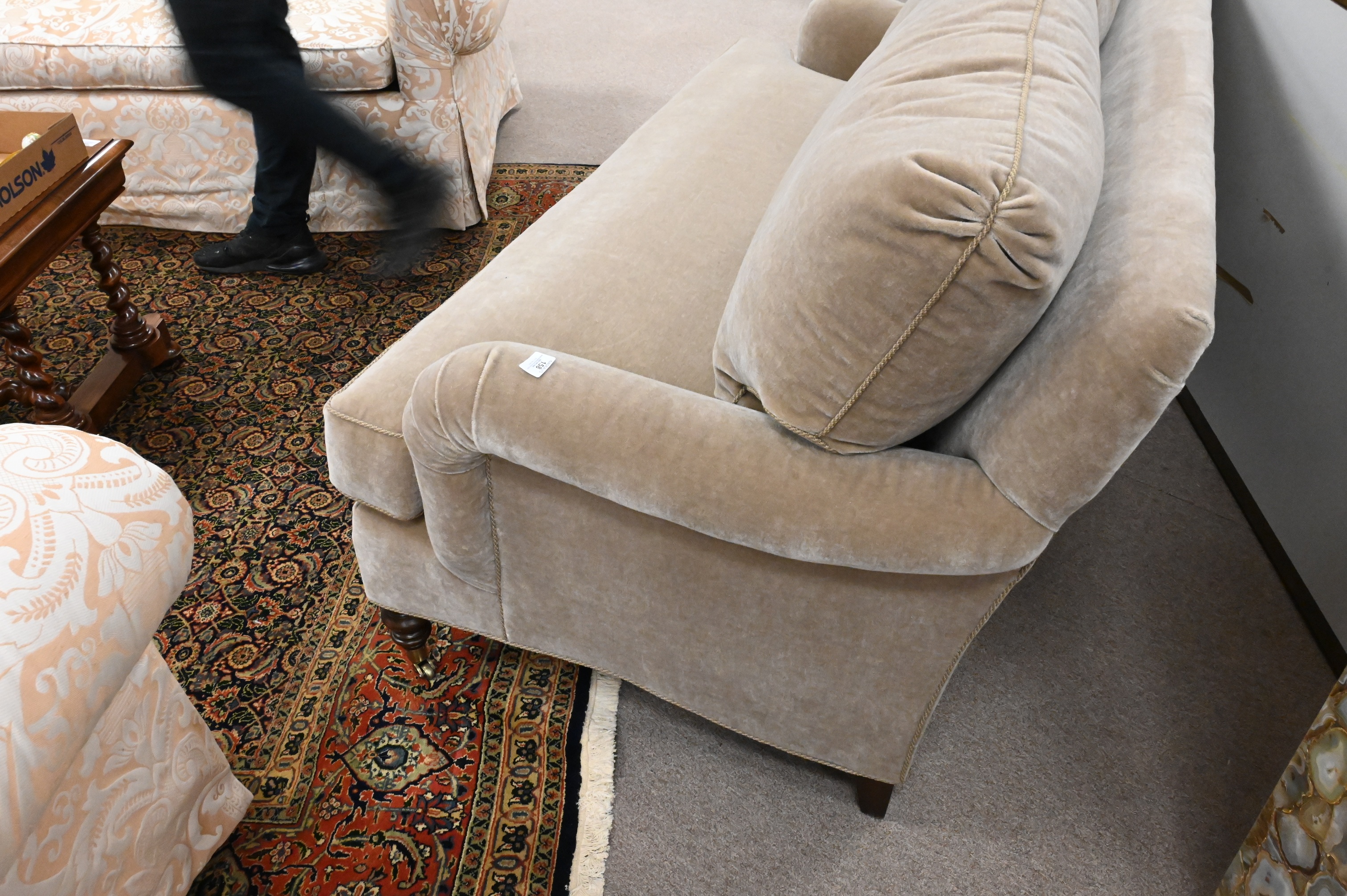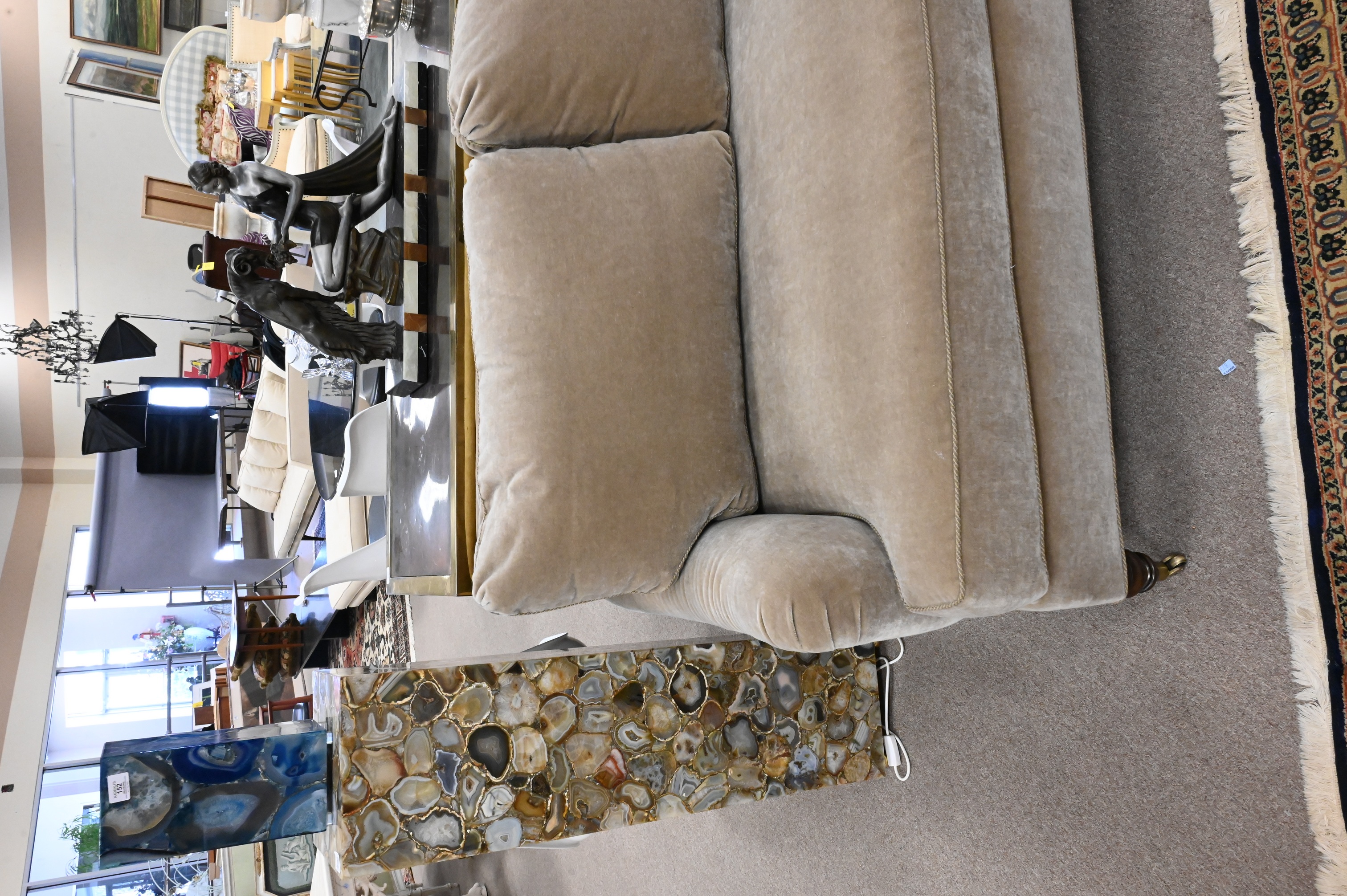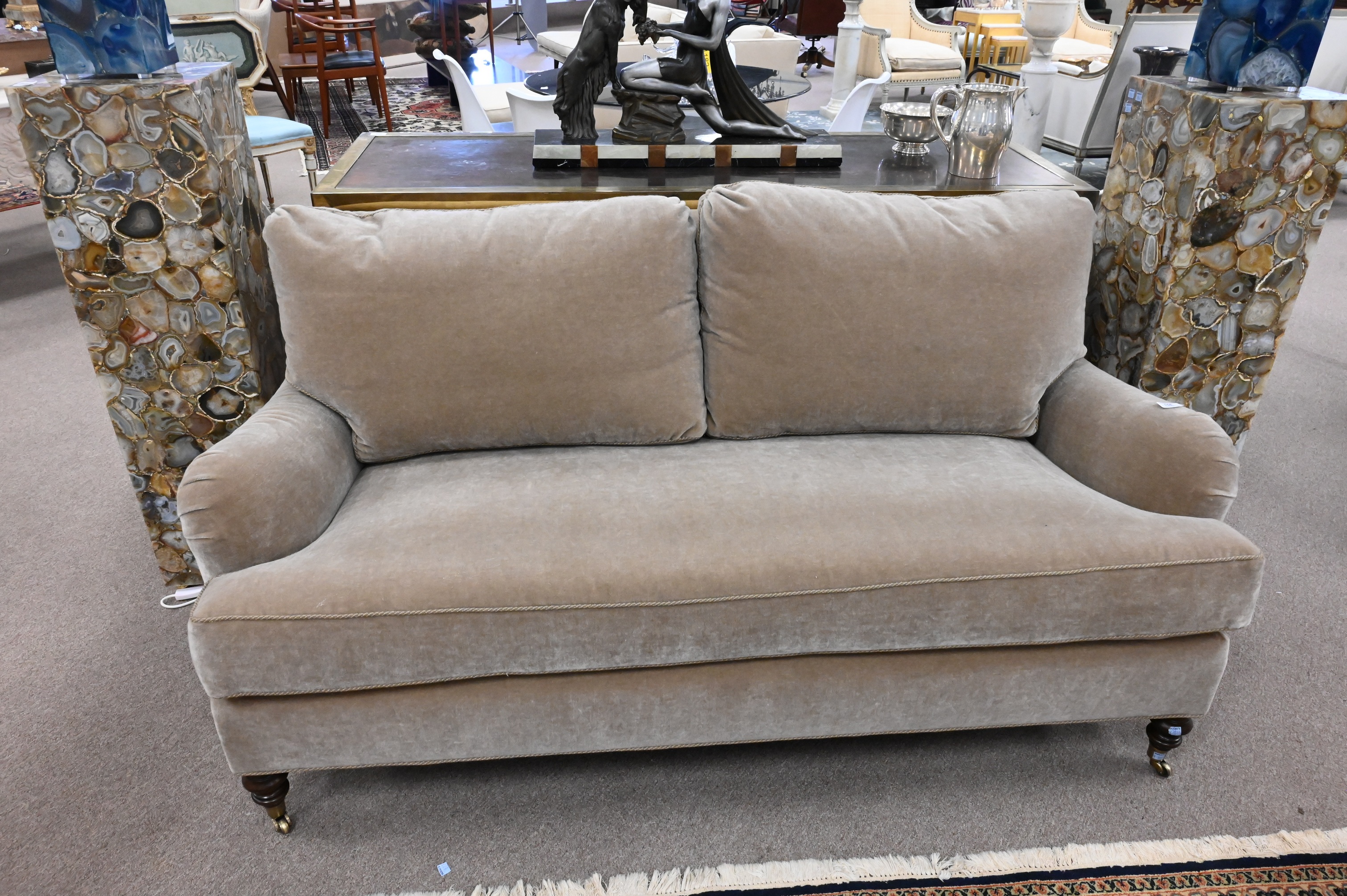 in down filled beige upholstery with two back cushions and single long seat cushion having rolled arms over turned wood and two brass caster feet