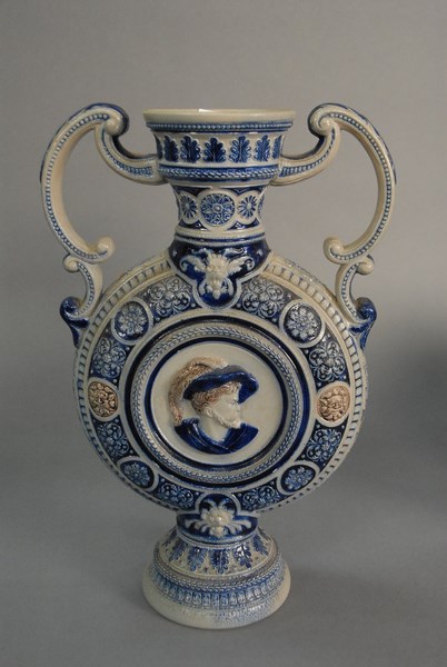 Ges. Gesch Gerz stoneware blue glazed two handled urn marked on bottom, ht. 14 1/2in.