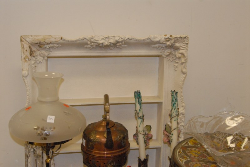 Group lot to include box lots brass stool, silver plated wine bucket, copper pot, lamp with prisms, candlesticks, overlay candy dish etc.