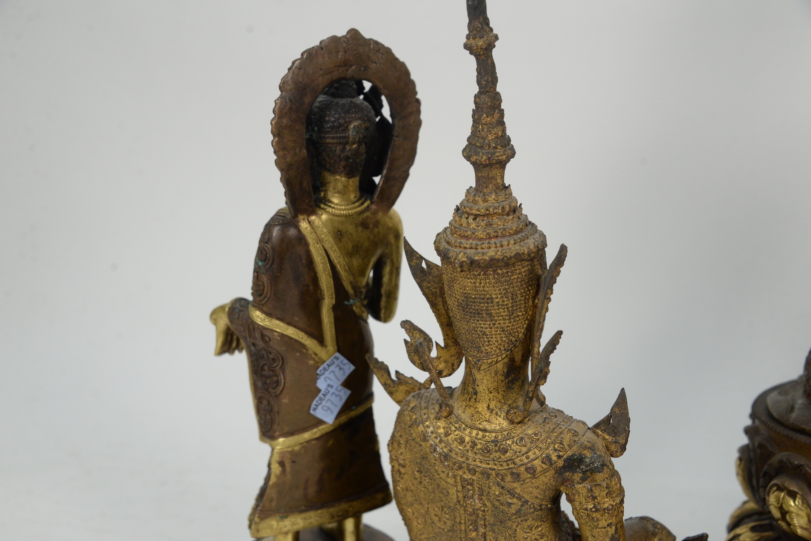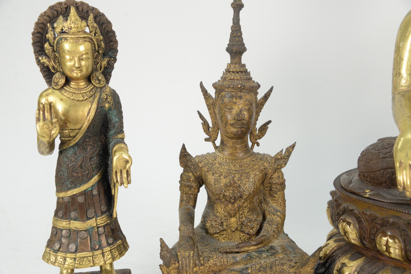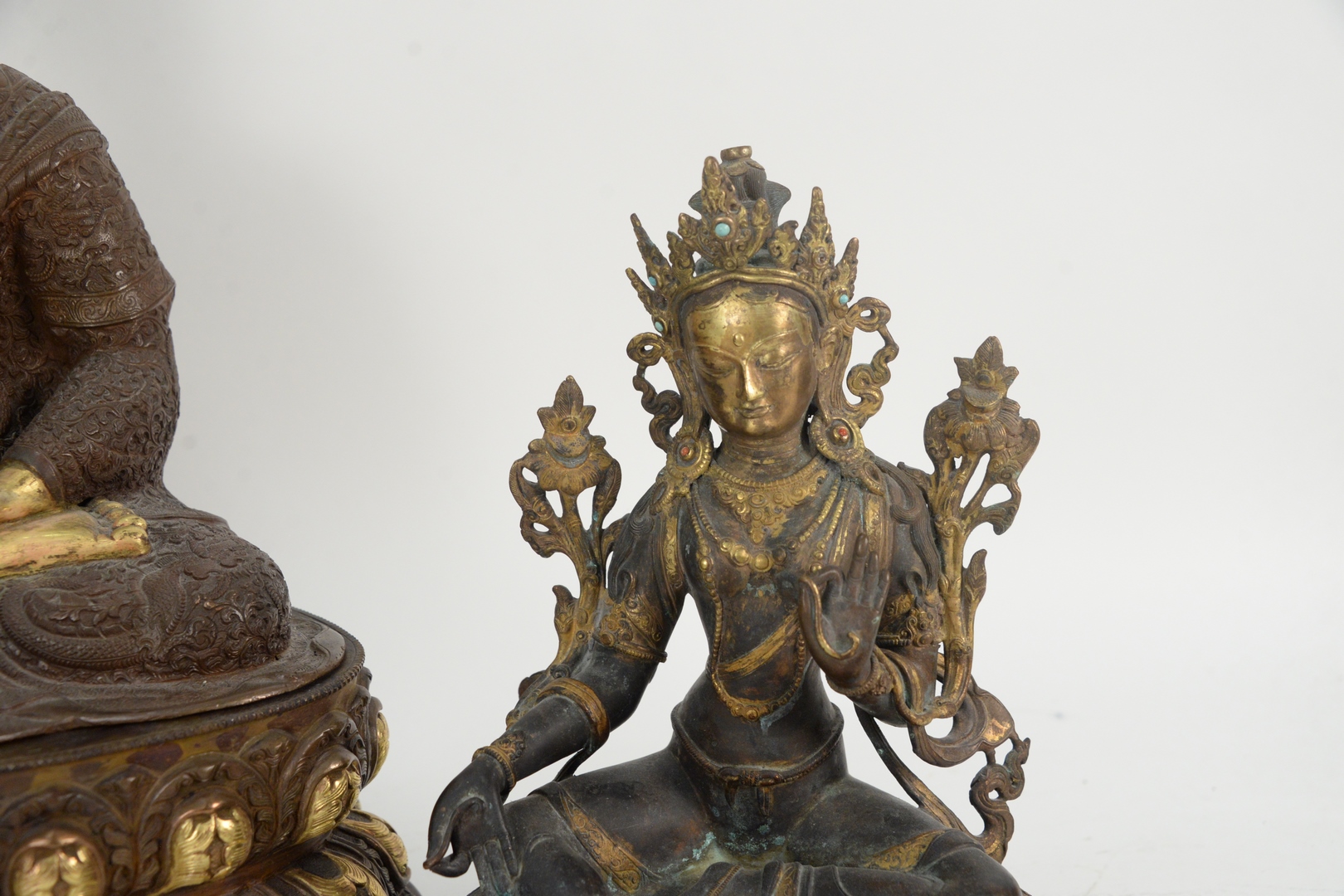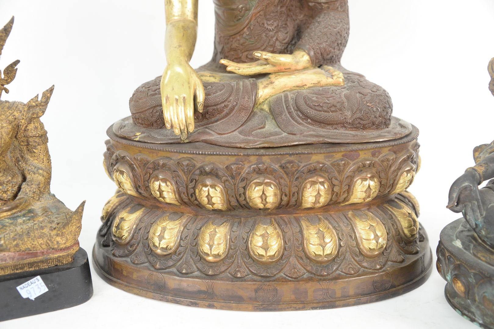 Group of Four Bronze Chinese Figures to include large two-part seated Buddha on lotus form base standing Guanyin along with two other seated Buddha figures, tallest 19 inches.