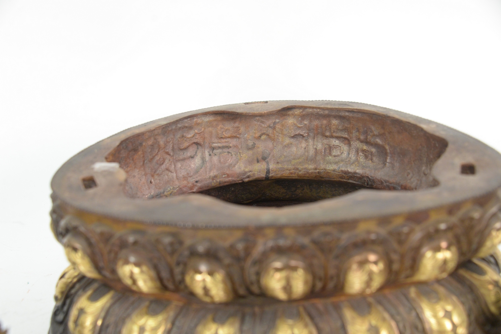 Lot 158: Group of Four Bronze Chinese Figures to include large two-part seated Buddha on lotus form base standing Guanyin along with two other seated Buddha figures, tallest 19 inches.