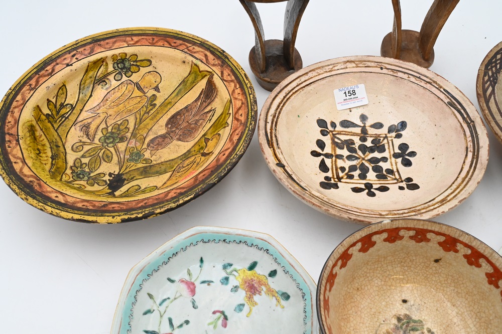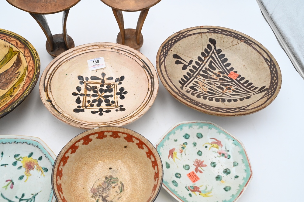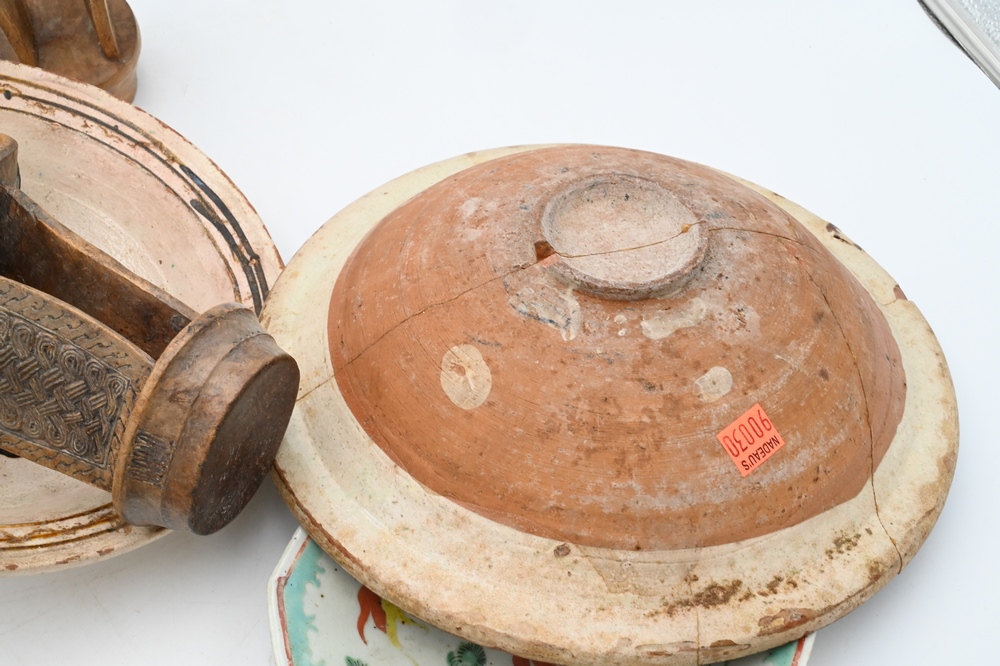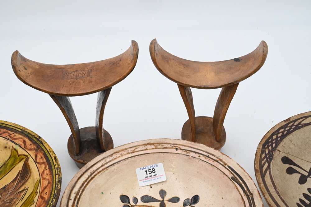 Lot 158: Group of Pottery Items, to include two Chinese compotes, two bowls, two carved wood headrests, along with painted bowls.
