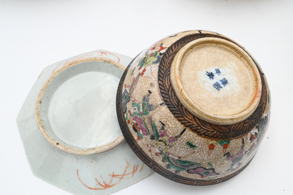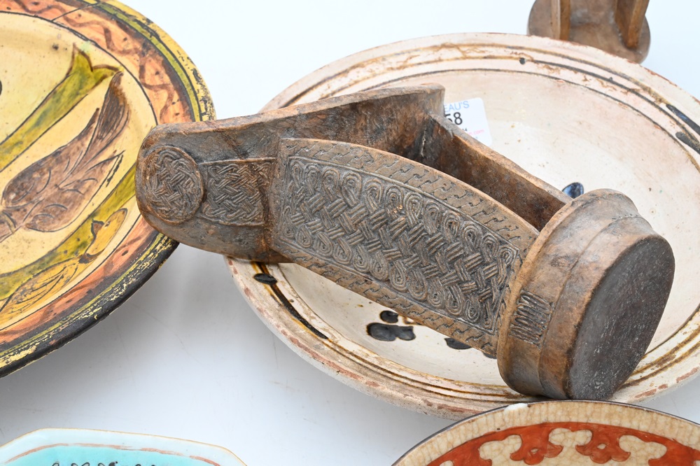 Group of Pottery Items, to include two Chinese compotes, two bowls, two carved wood headrests, along with painted bowls.