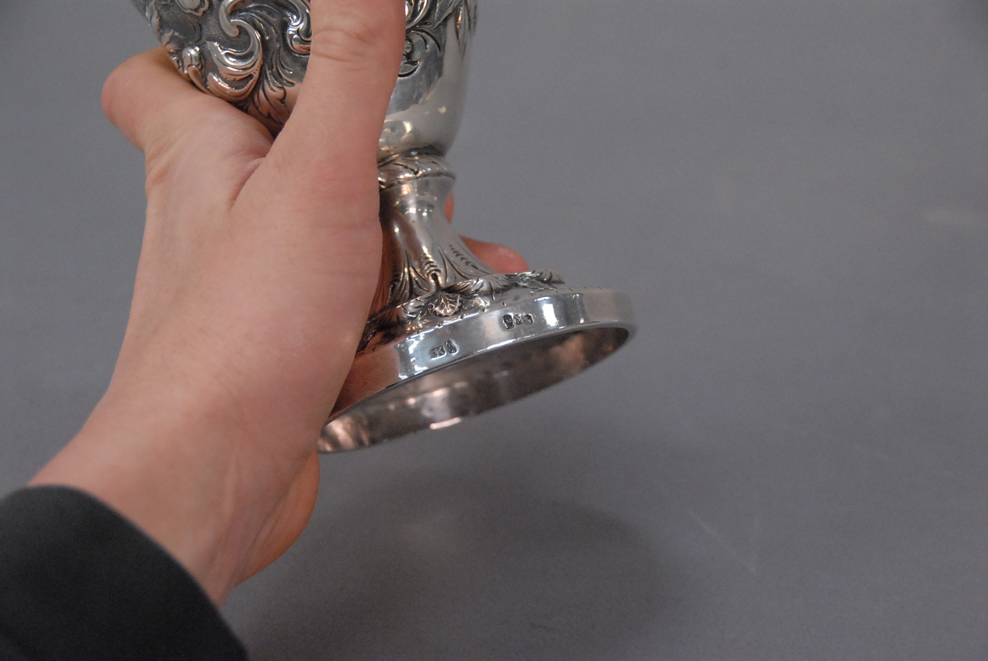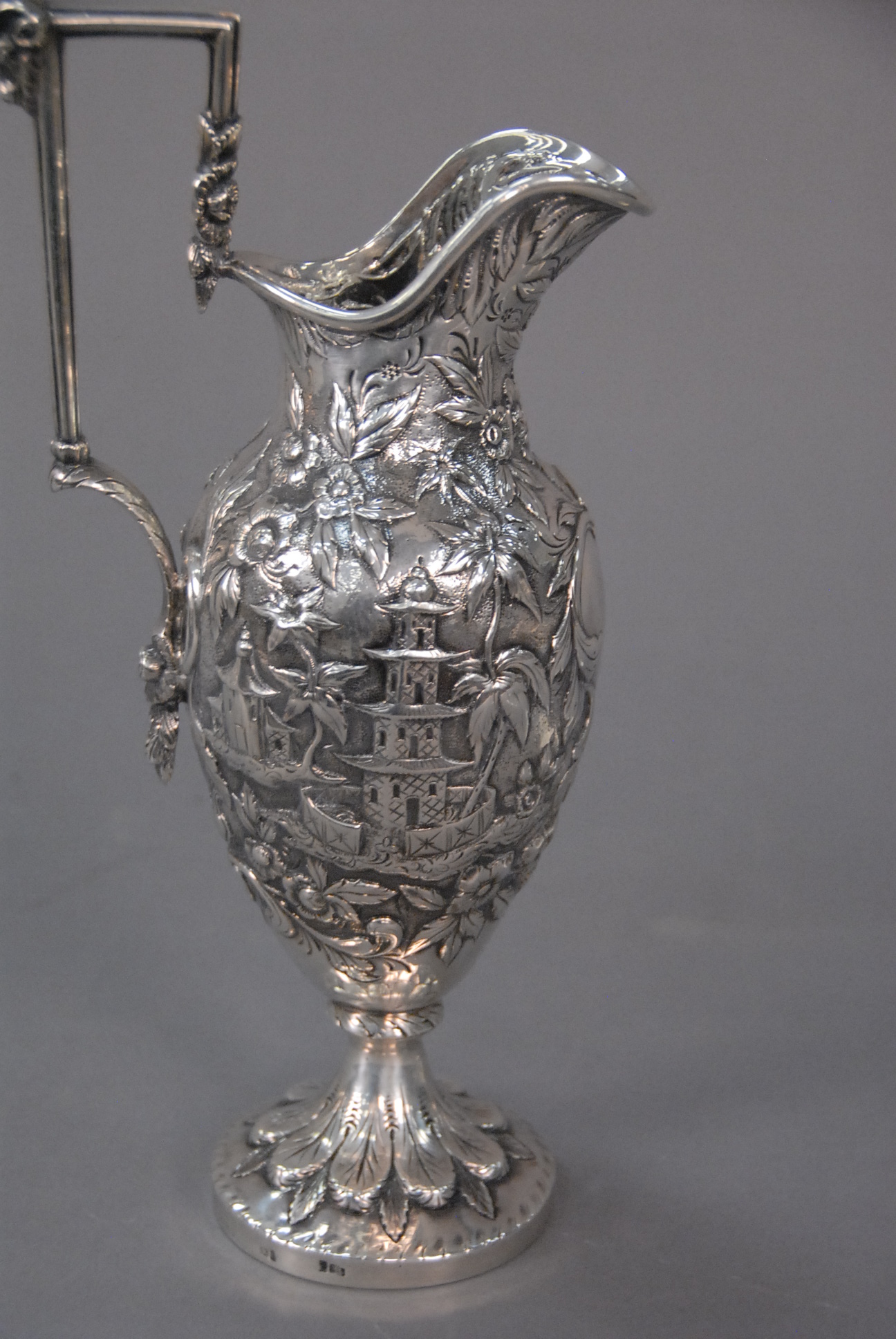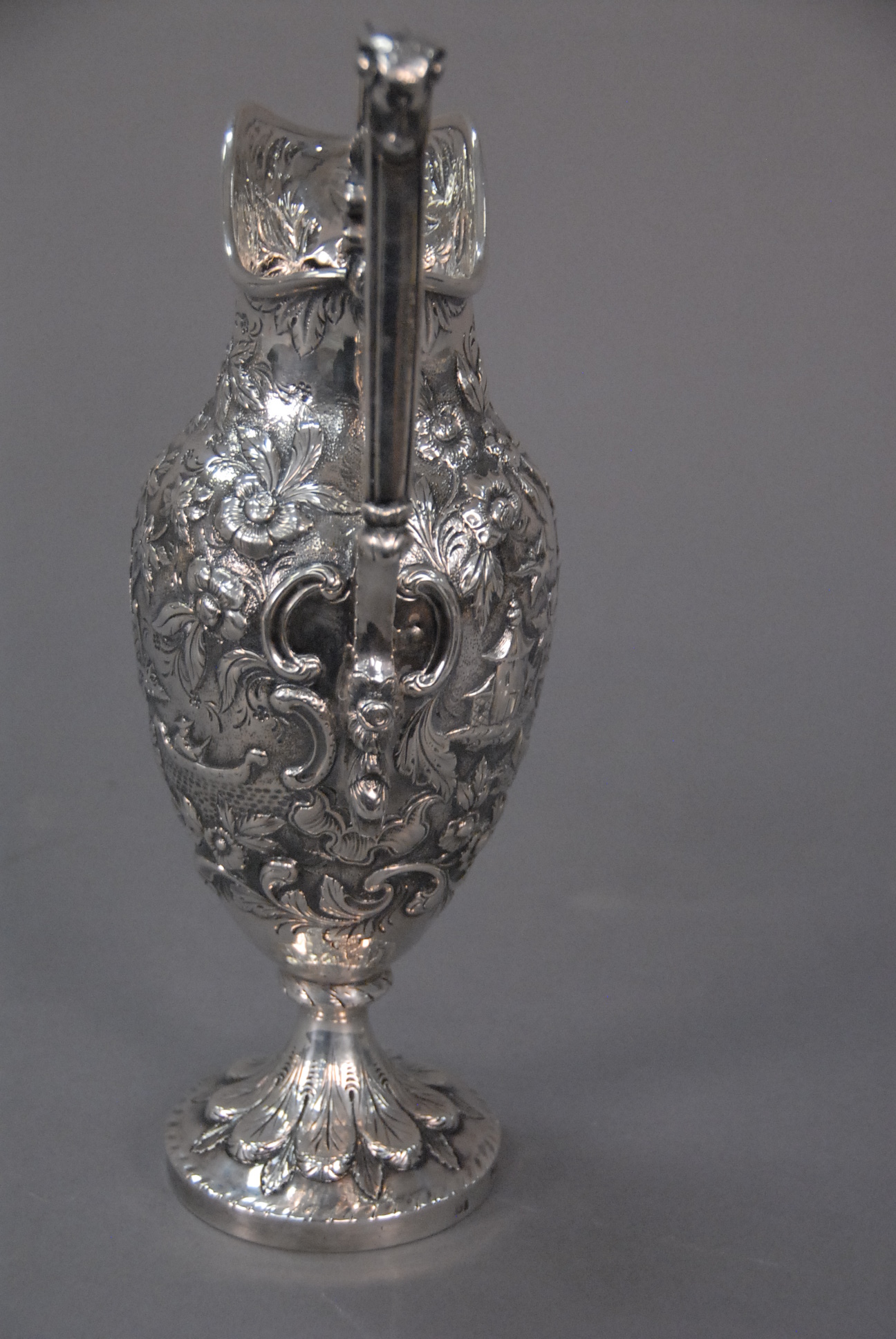 Lot 158: Kirk Ewer with pagoda repousse body and flowers, handle with rams head, hallmarked SK. ht. 12 1/4in. 26.2 t oz.