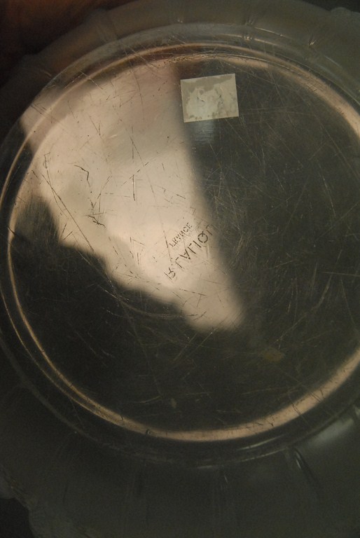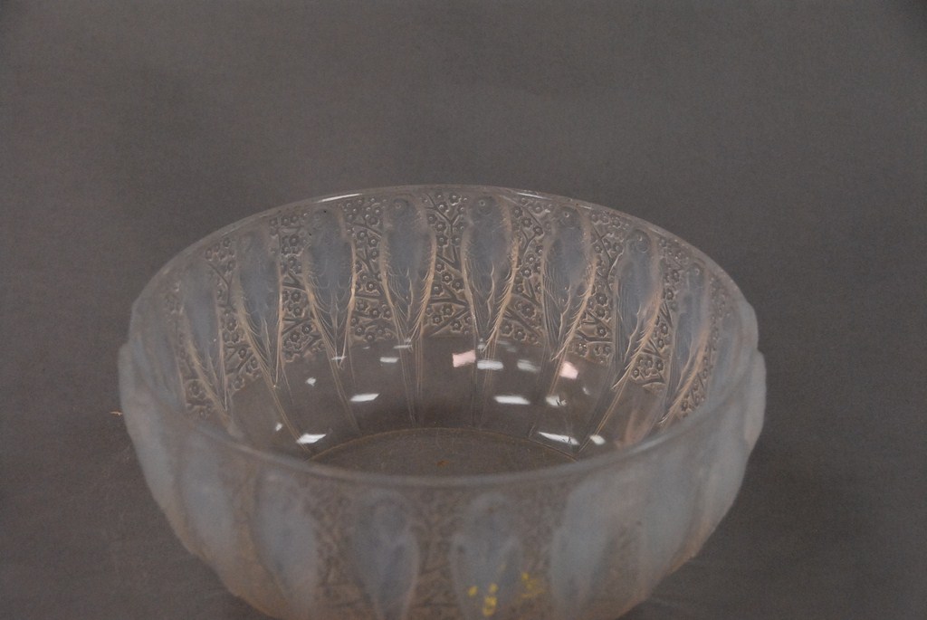 Lot 158: Lalique center bowl with opalescent parrots marked on bottom R. Lalique in block letters slight chip on inside rim edge. Proven…..