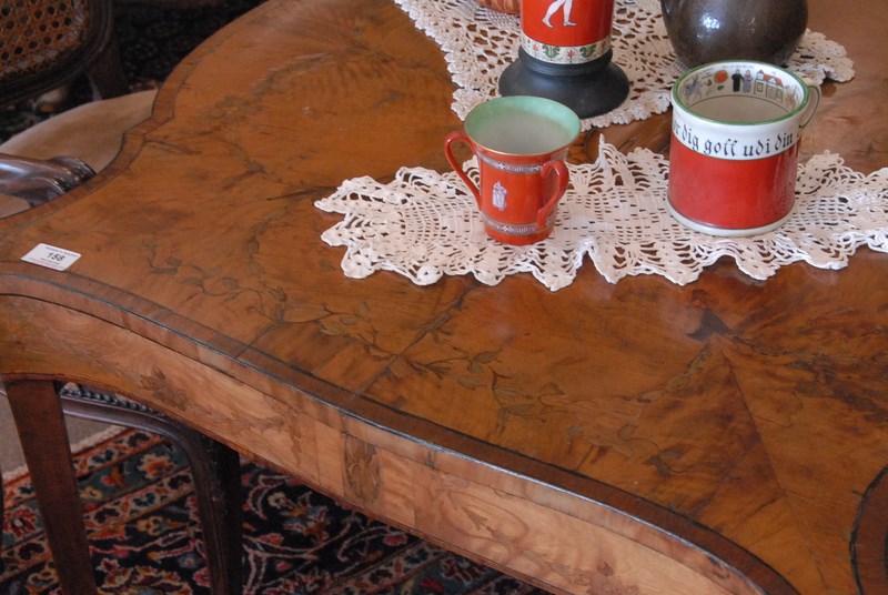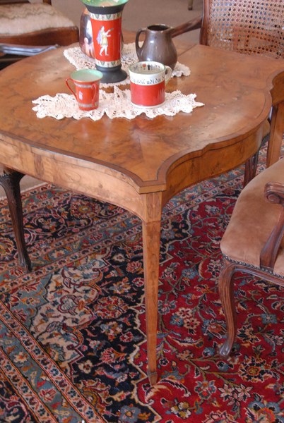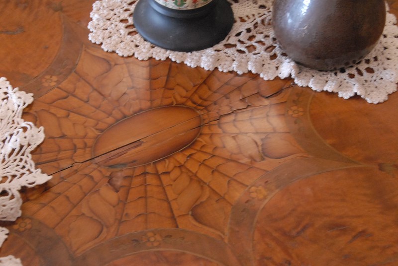 Louis XVI style inlaid gaming table, drawer on two sides, split on top.