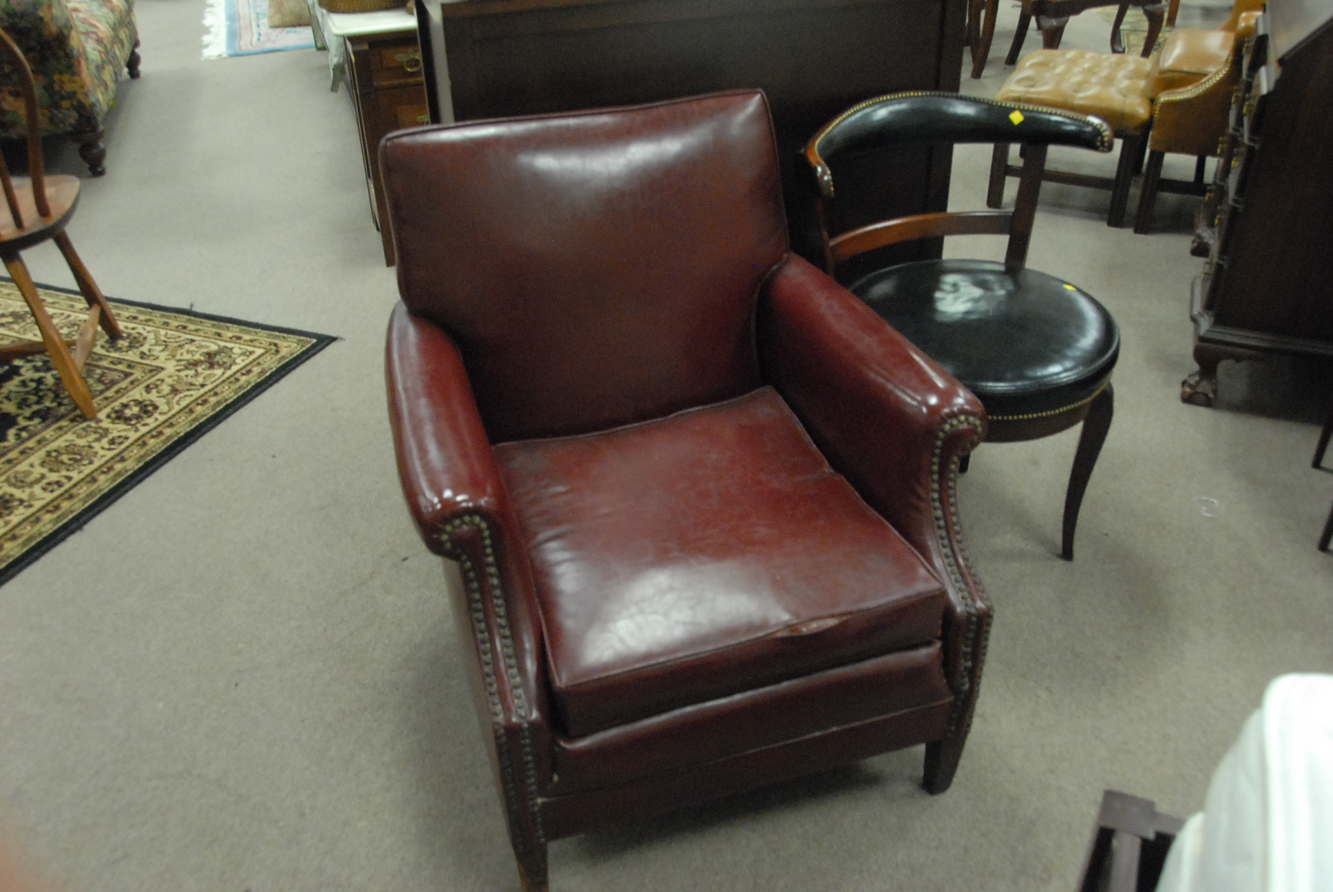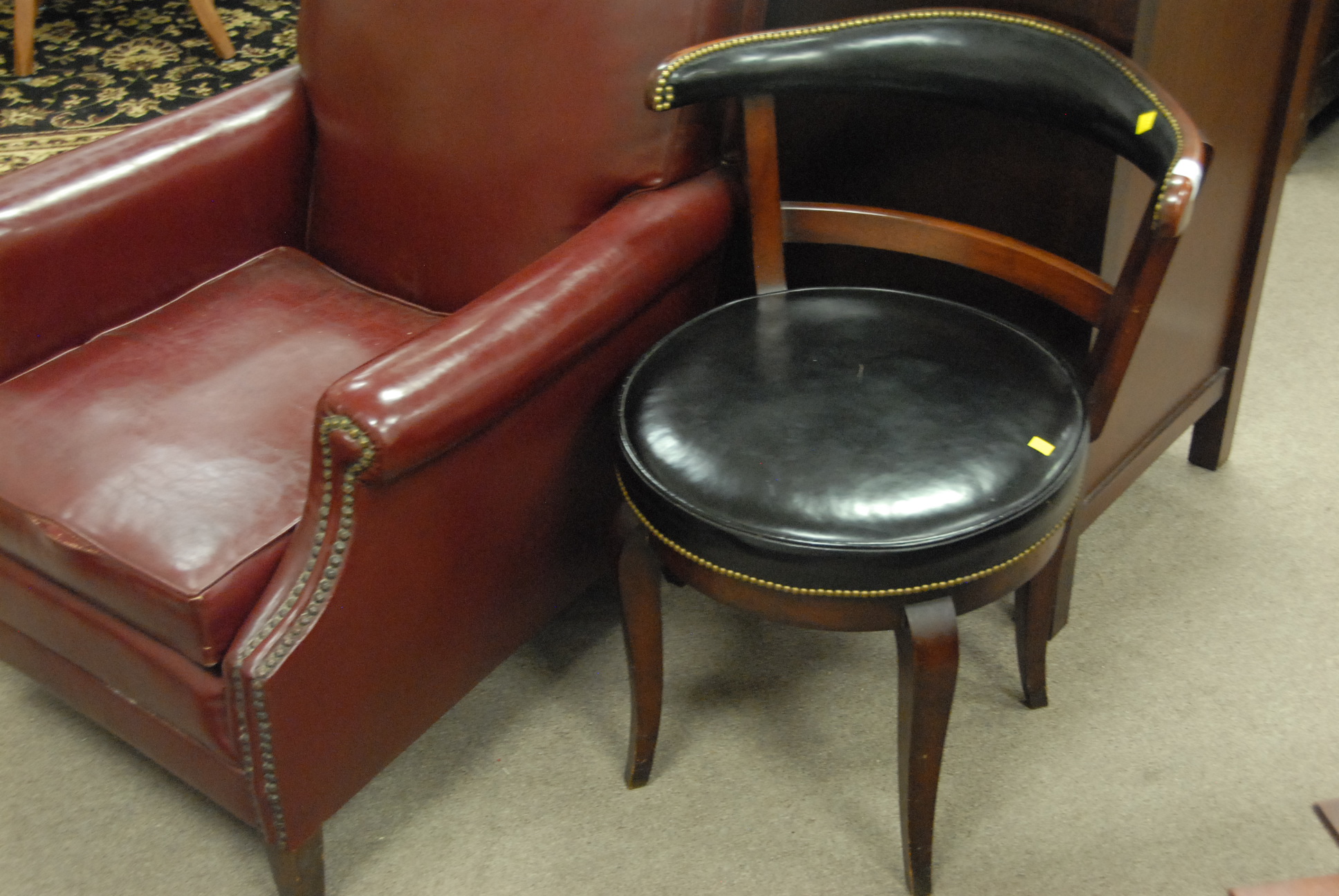 Maroon leather club chair and black leather swivel chair.