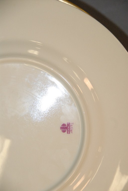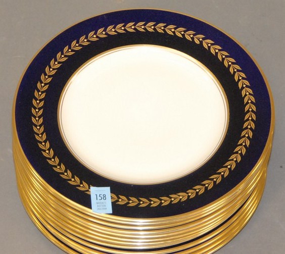 Set of cobalt blue and ivory dinner plates marked Tatler, dia. 10 1/4in.