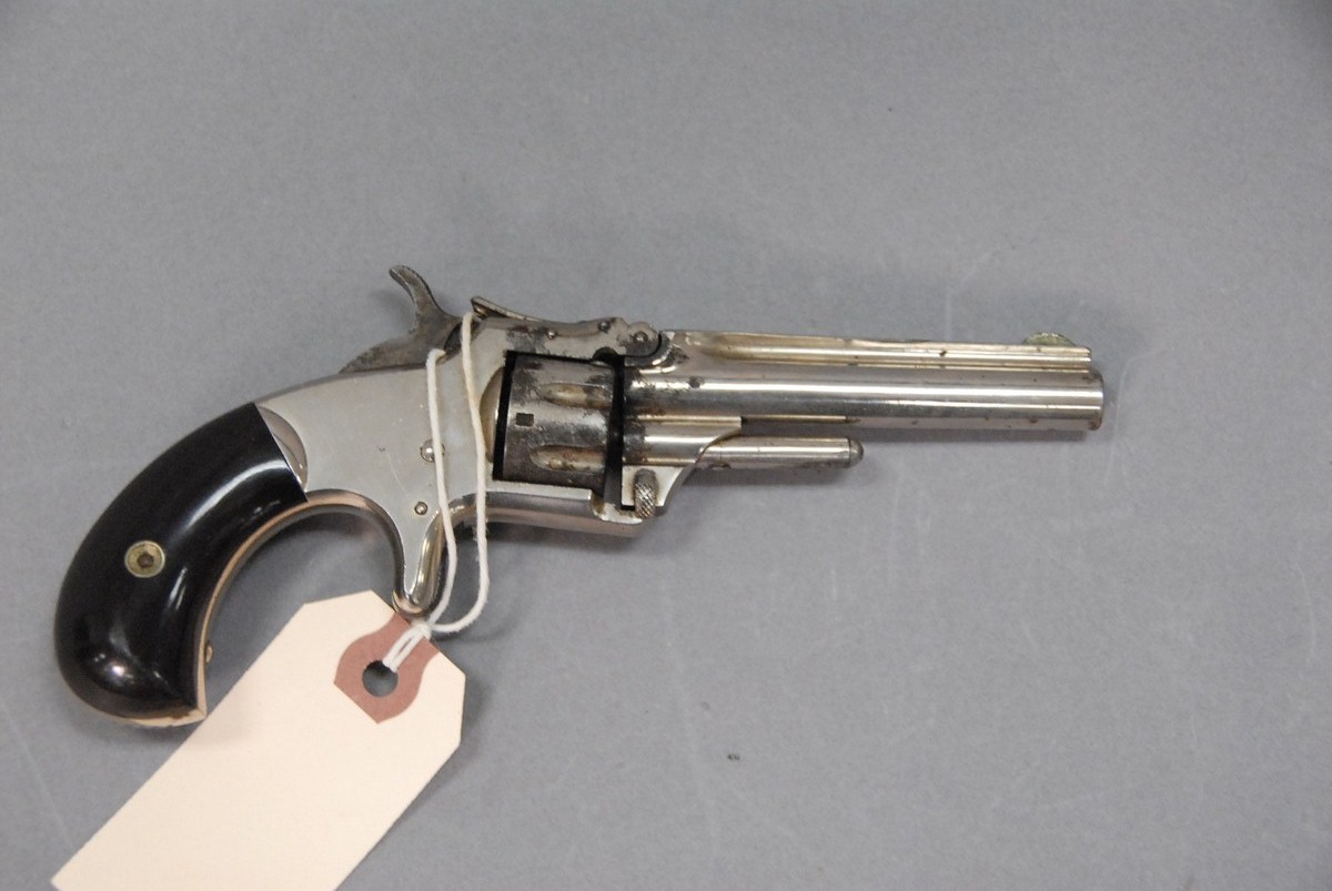 Smith & Wesson model 1 revolver, third issue, .22 caliber rimfire, 7 shot, nickel plated, 3 1/4 barrel. 189 SN-86484