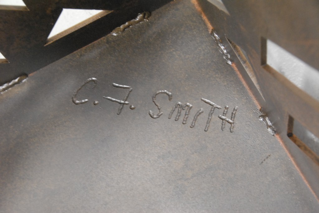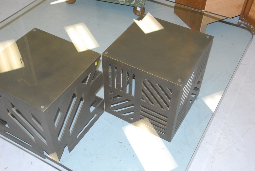 Lot 158: Square top glass coffee table with double square bronze base, signedon base C. F. Smith, top: 48 square.