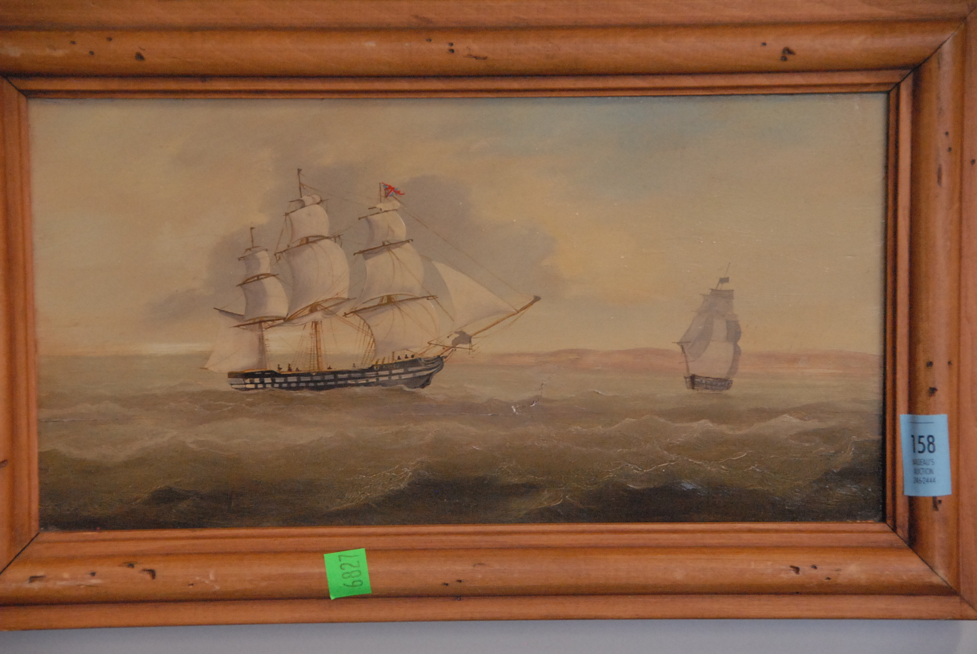 Lot 158: Three paintings to include an oil on mahogany panel of two sailing ships one flying British flag, still life of woodstove and chair,…